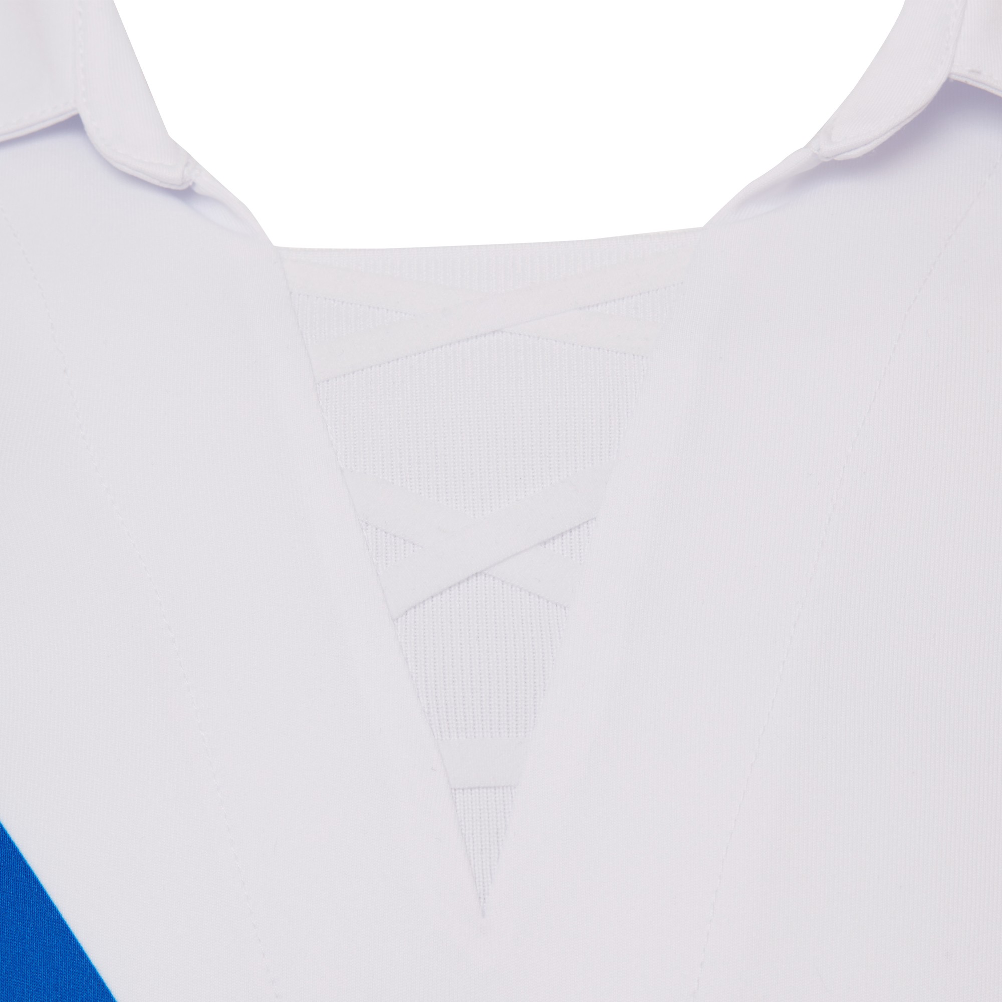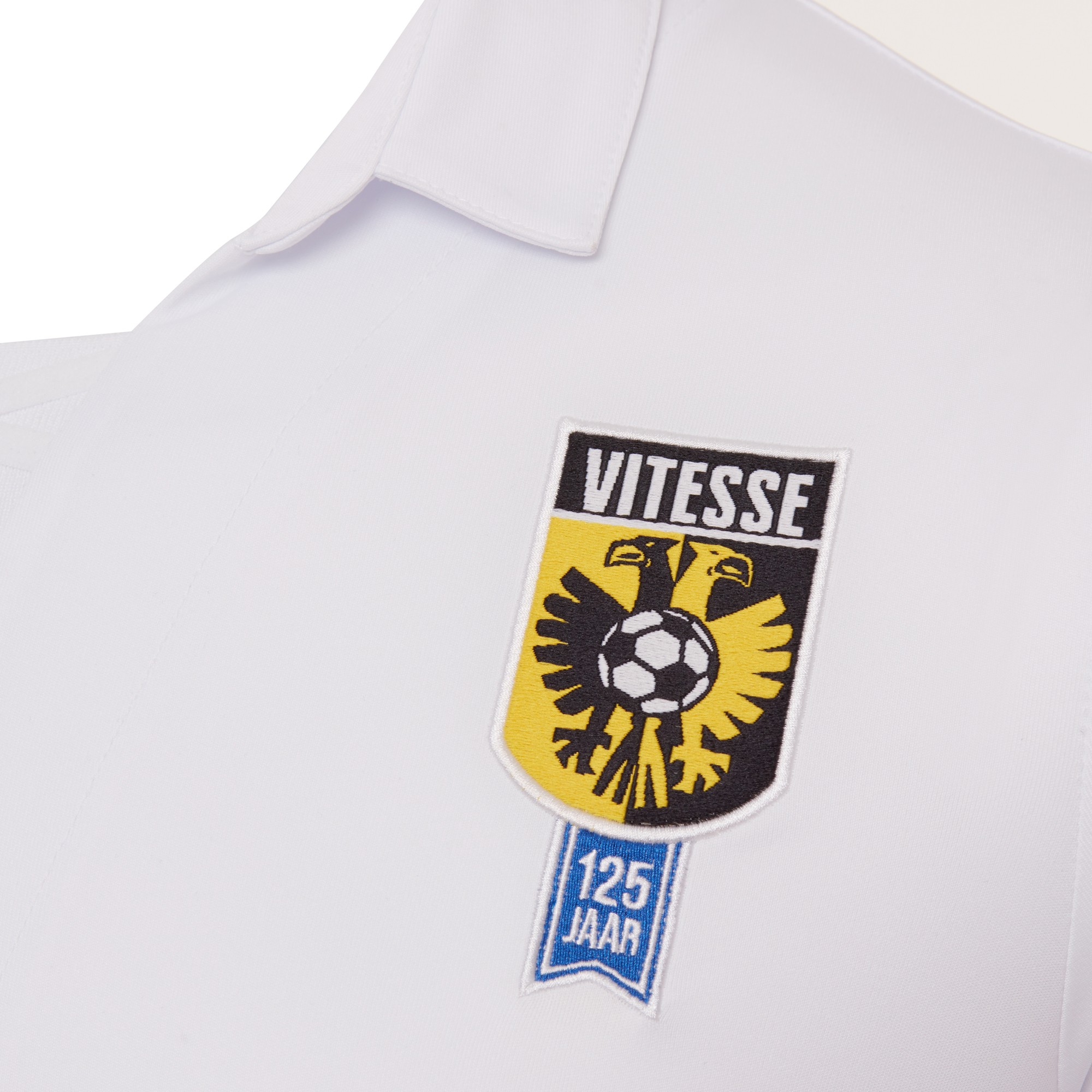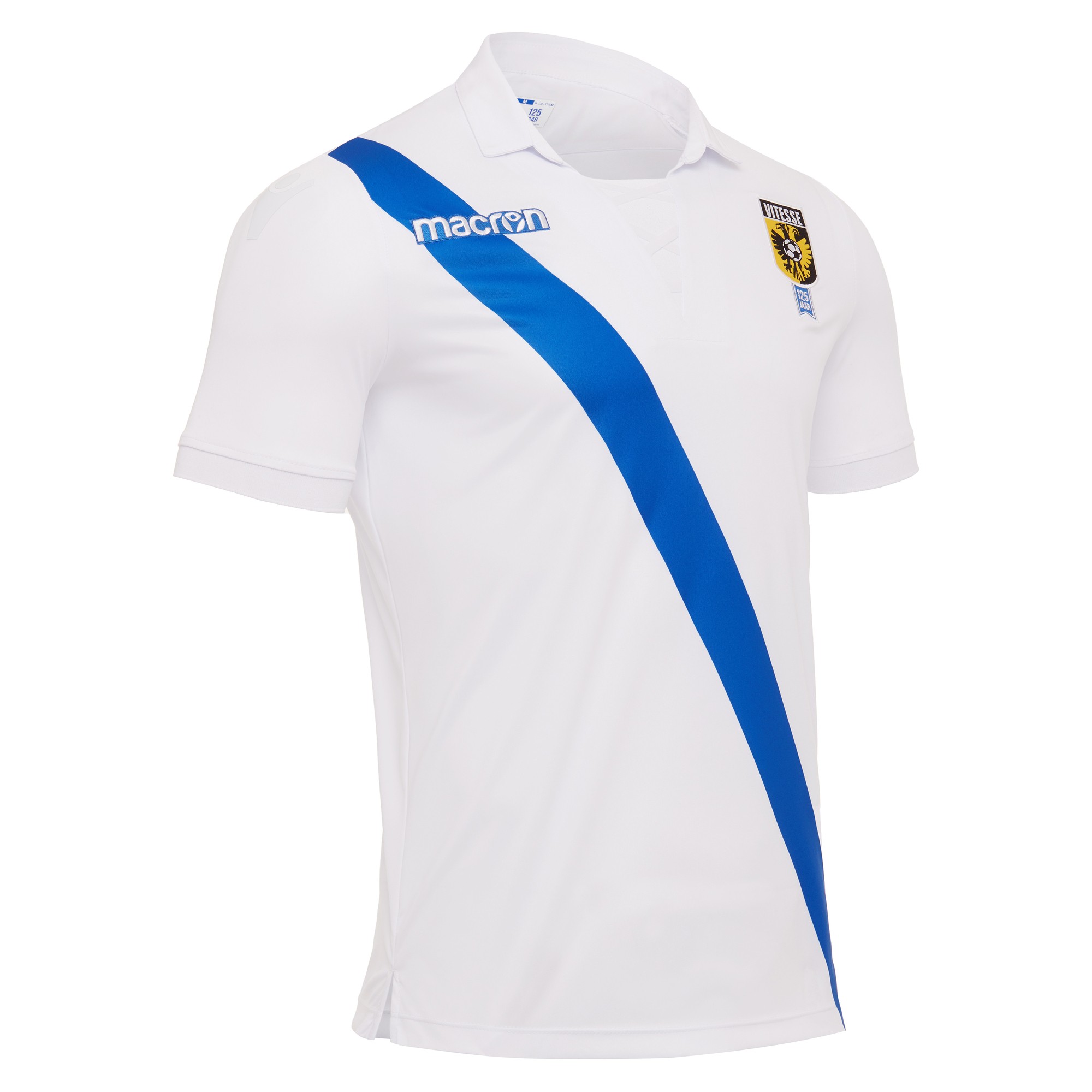 The new Vitesse 17/18 Macron 125th Anniversary away shirt is white, with a blue diagonal strip running across the front.
