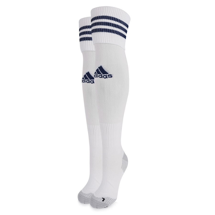 Similar to last season, the shorts and socks are white, with the addition of navy blue adidas stripes to replace last season’s light blue.