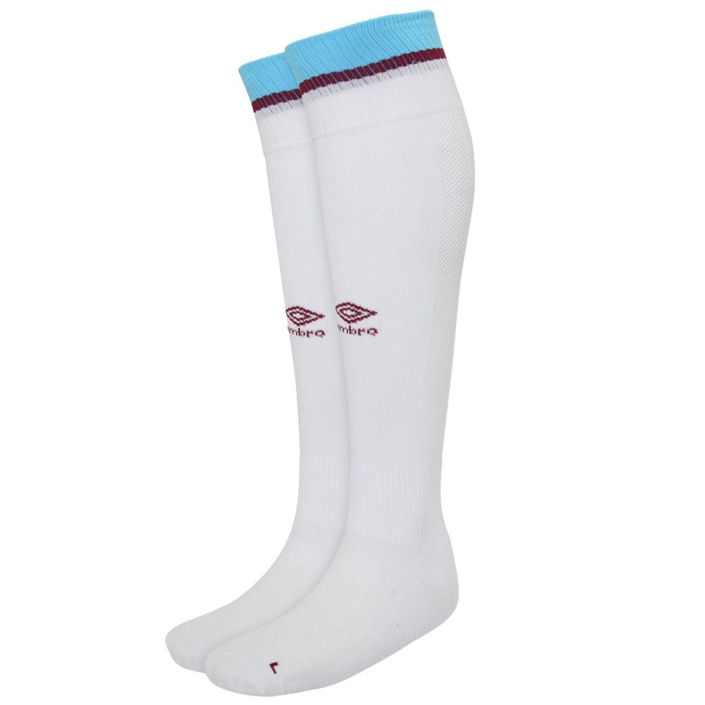 Double-welt socks - reverting back to white - feature a claret and blue band adorned with the double diamond to complete a kit that matches the modern day footballer’s high level of performance on the pitch.
