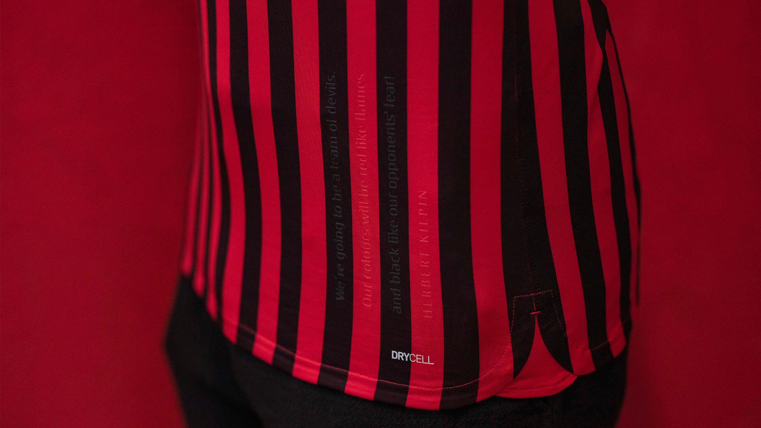 The jersey features design elements commemorating the 120th anniversary, including Herbert Kilpin’s iconic club founding statement: "We’re going to be a team of devils. Our colors will be red like flames, and black like our opponents' fear!" The statement is printed on the jerseys to be worn proudly by the players, additional features include commemorative sign-off and shirt highlights featured in gold color.