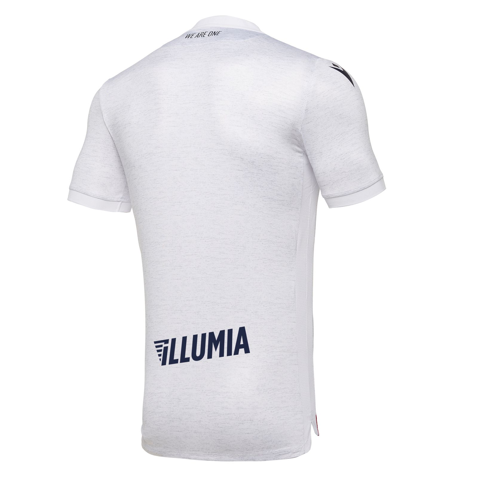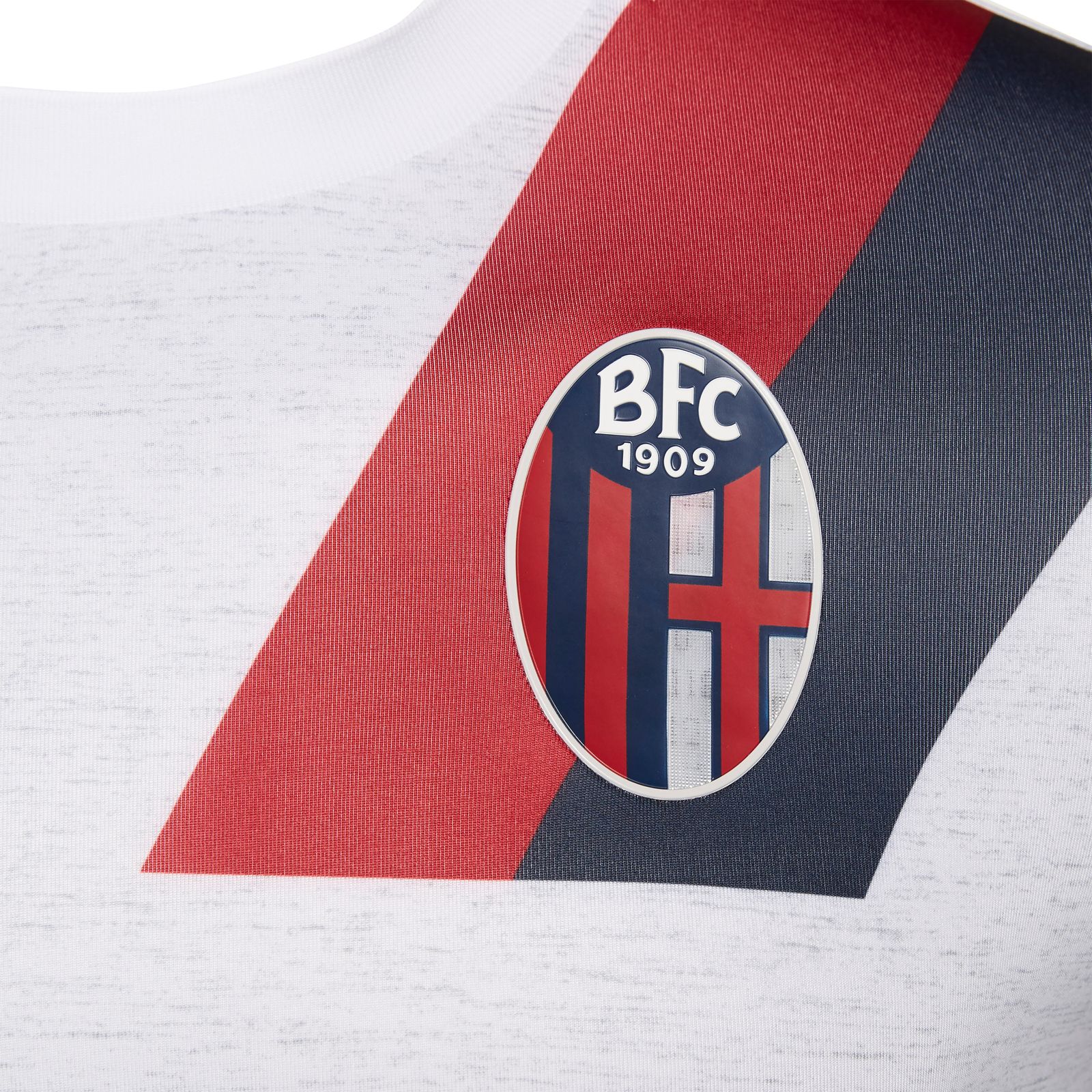 The Bologna FC away shirt has a melange, light grey textured design with two diagonal bands in traditional red and blue club colours.