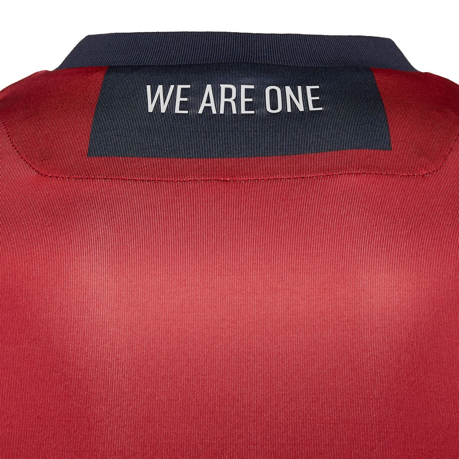 The silicone club badge with a 3D hologram stands out on the left side of the chest. Various details such as the rib-knit cuffs, the knitted V neck collar with fabric studs enhance this shirt. The heat transfer slogan 'We are one' features at the back while the Macron hero logo, also applied by heat transfer, features on the sleeves.