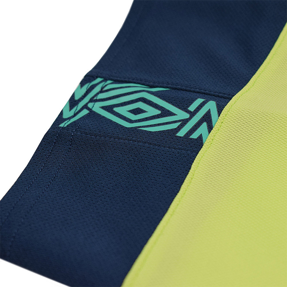Navy tone shorts are complemented with a flash of green, whilst the socks are all green with a navy tone turnover.