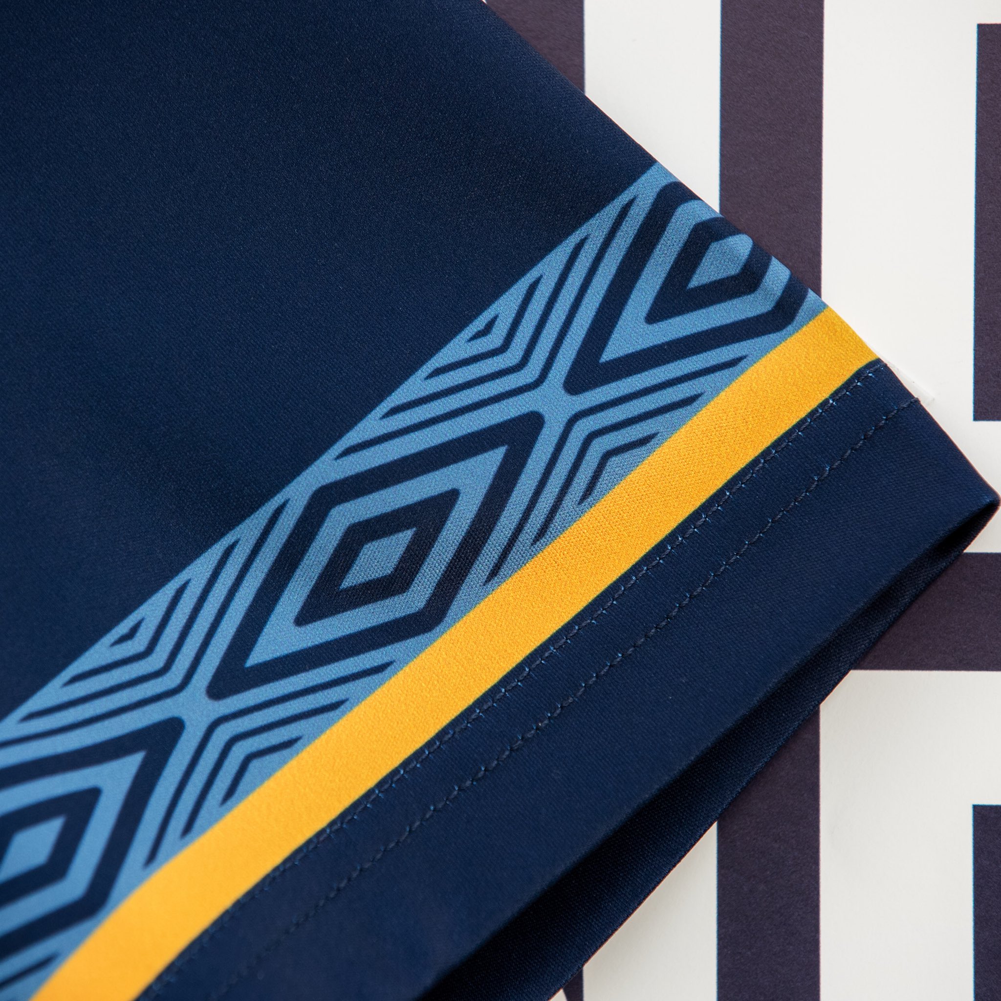 The new shirt features navy and blue hoops with water graphic overlay, an embroidered stacked diamond and a double diamond sky blue and gold trim on the sleeve cuffs.