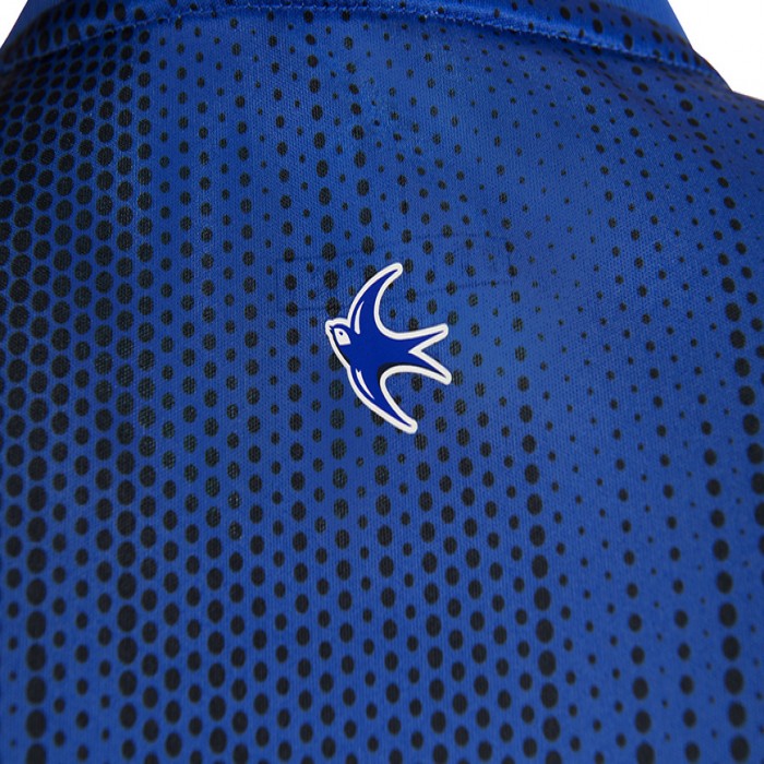 The new jersey is peppered with small black blobs scattered across its entirety. The Bluebird continues to fly high on the back of the home shirt, while the strip this campaign will be complemented by white shorts and blue socks.