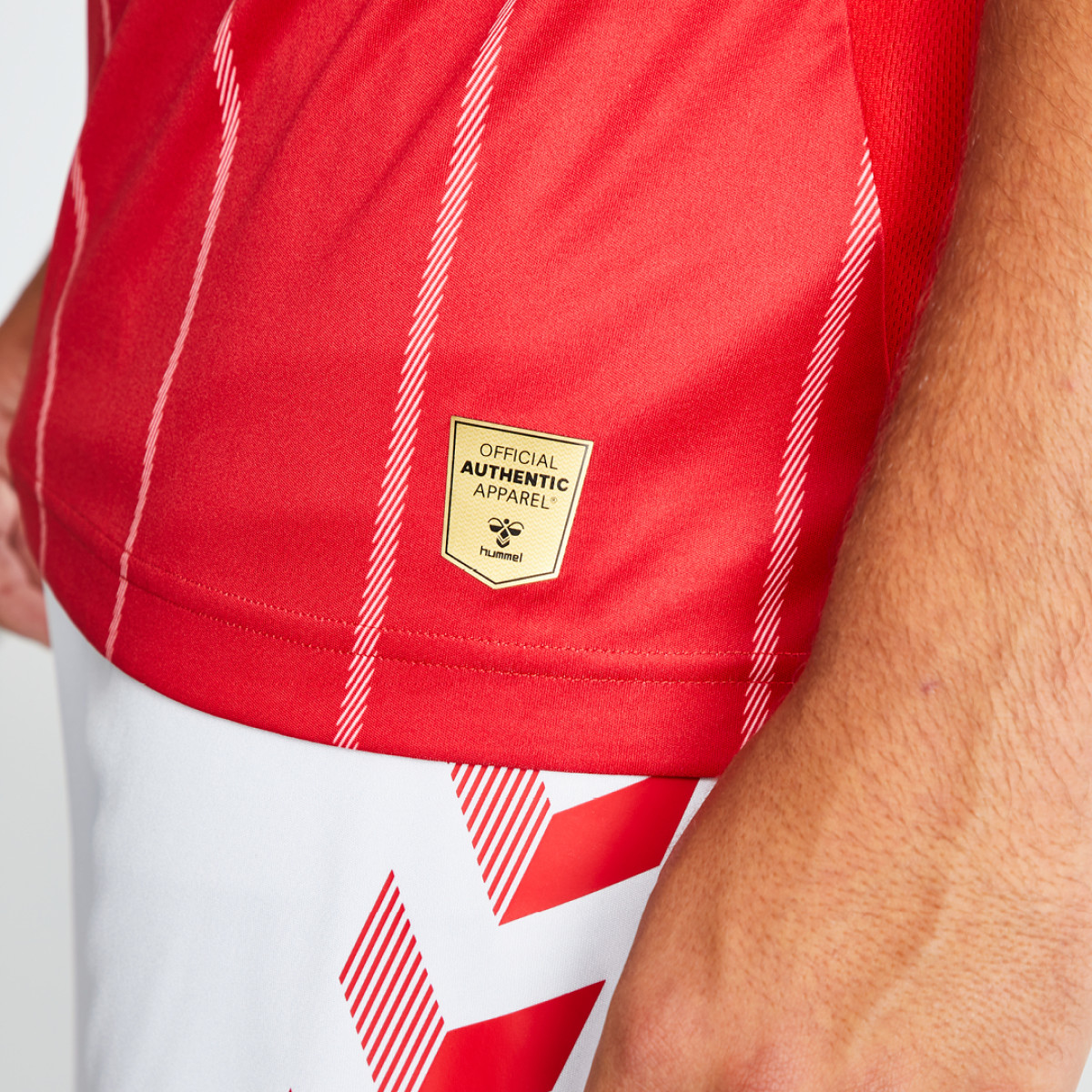 The shirt is complemented by white shorts which feature red detail, including hummel’s distinctive chevrons, while the red socks include a white fold-over hem.