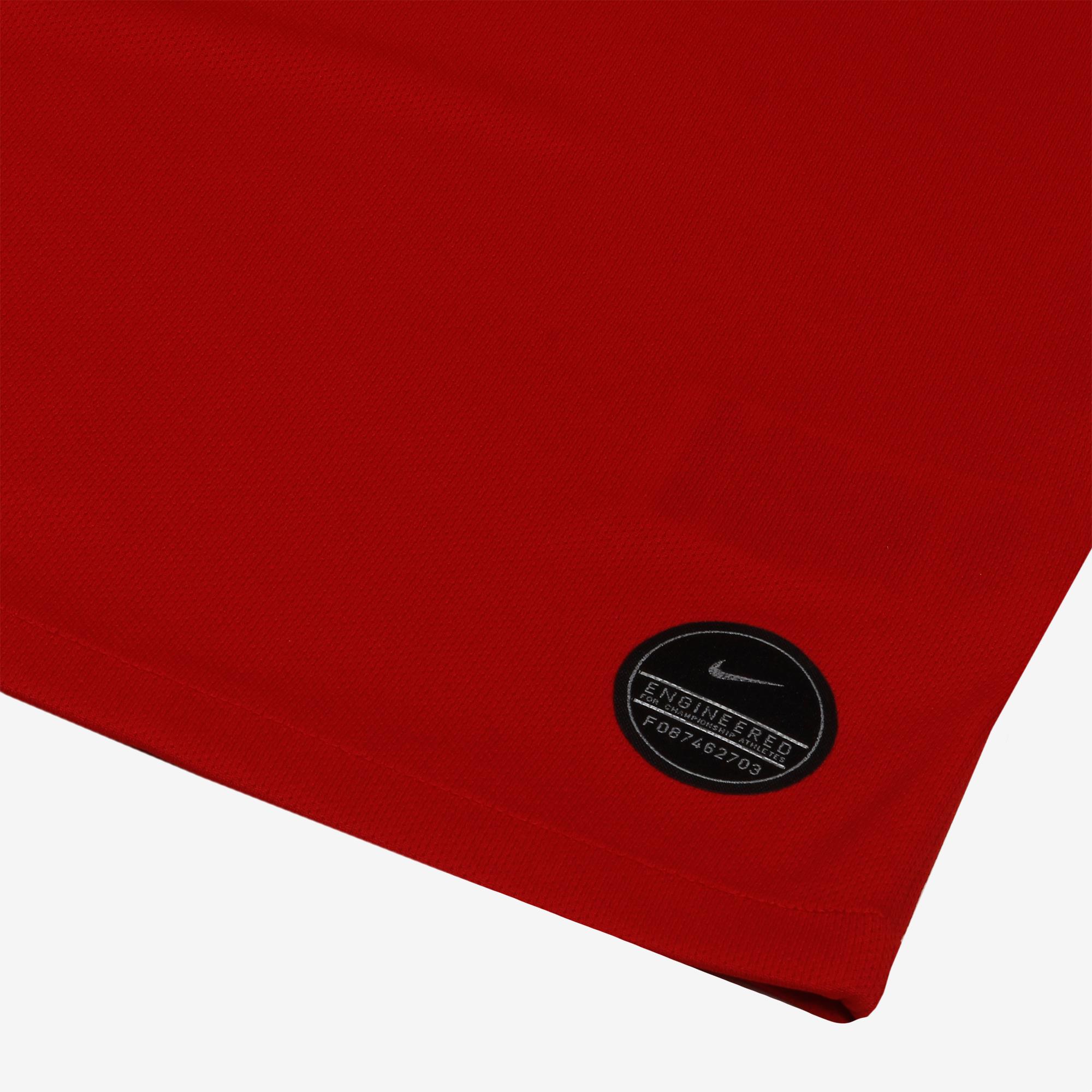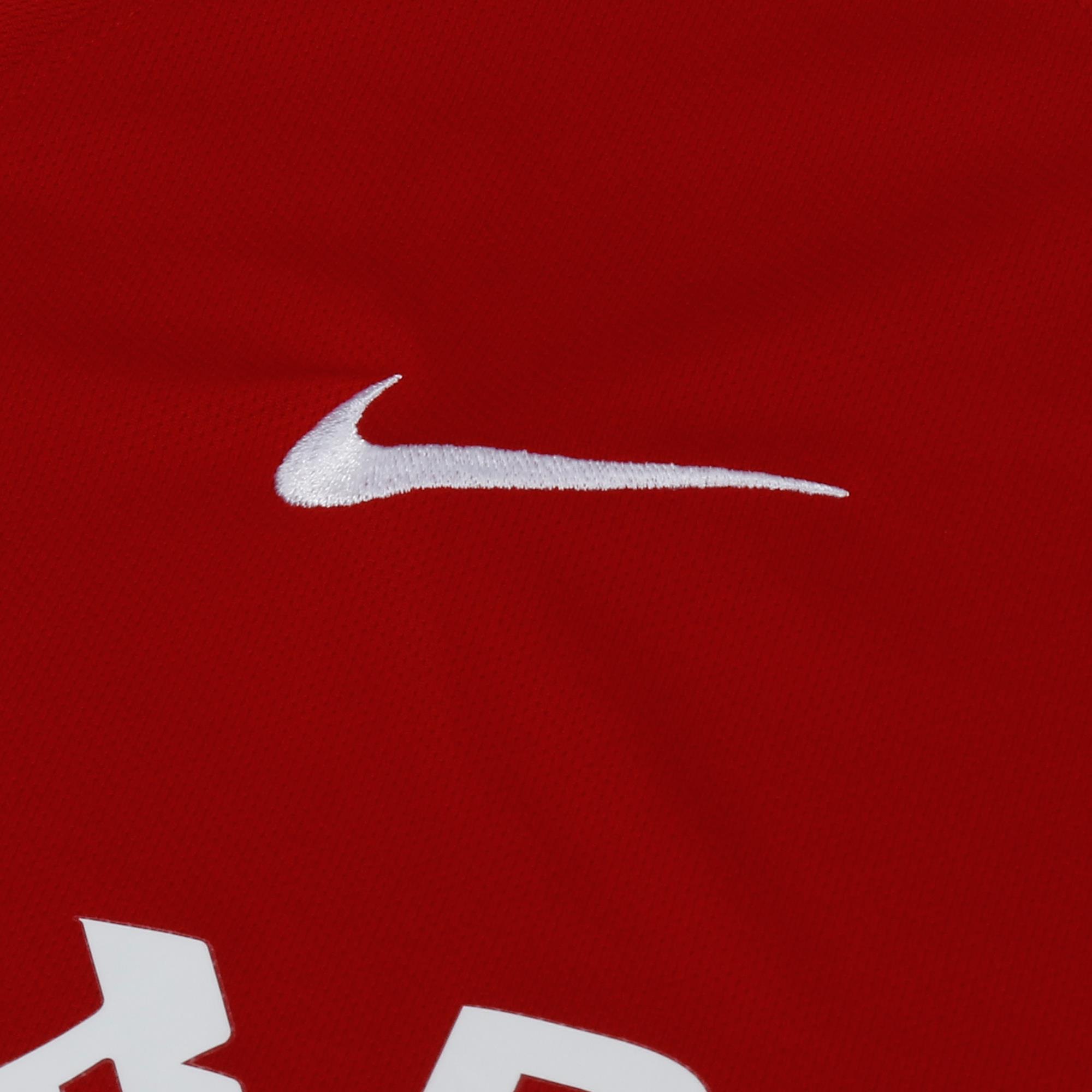 In the famous red, the shirt has a white V-neck collar design, with white cuffs on the sleeves and the Nike Swoosh logo, Banrisul sponsor logo and crest all in white. This Inter shirt features the classic crest first used by the club in 1979 to celebrate the third national title.