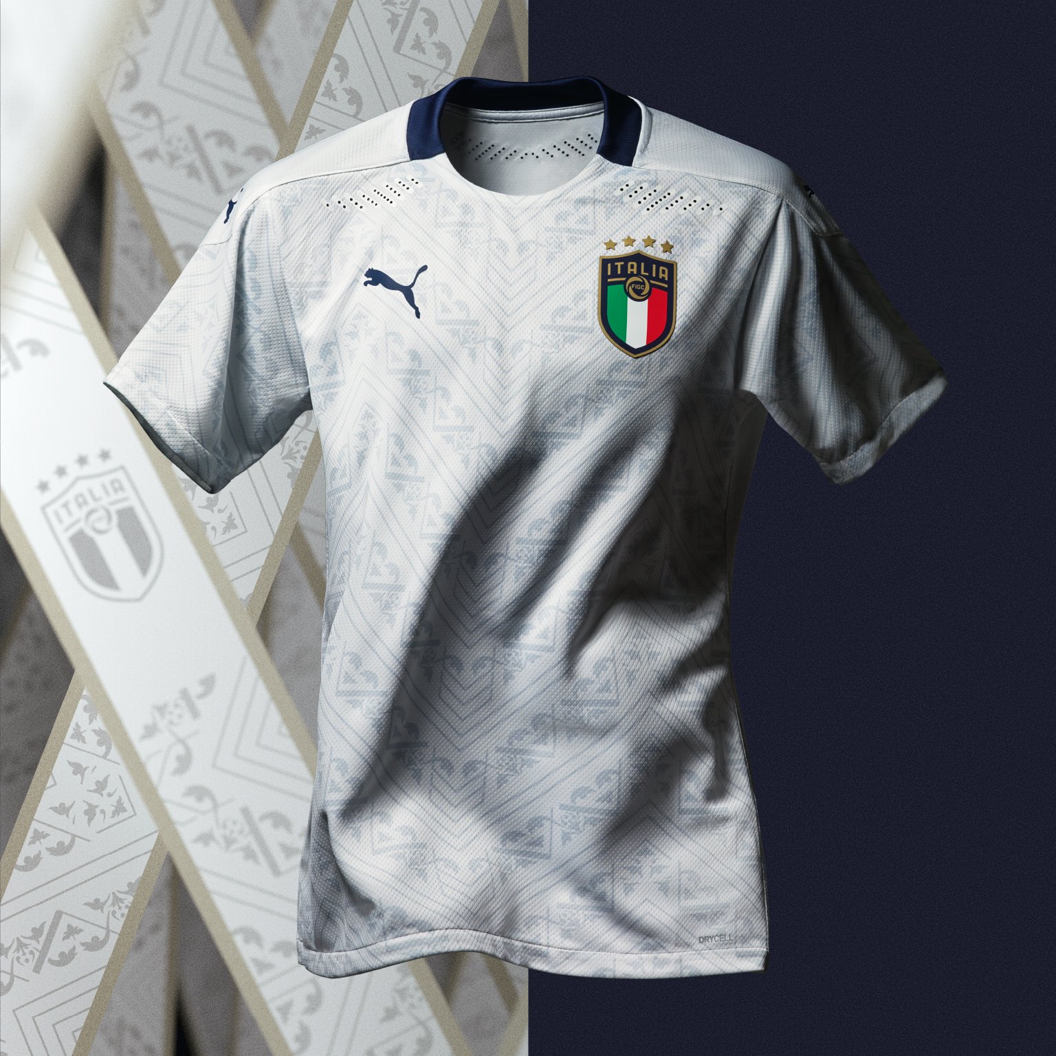 Inspired by the age of Renaissance, the new Italy 2020 Away Kit reflects the culture-defining era of art and architecture, featuring decadent Renaissance patterns reimagined as a modern geometric graphic, tonally incorporated in a classic white jersey.