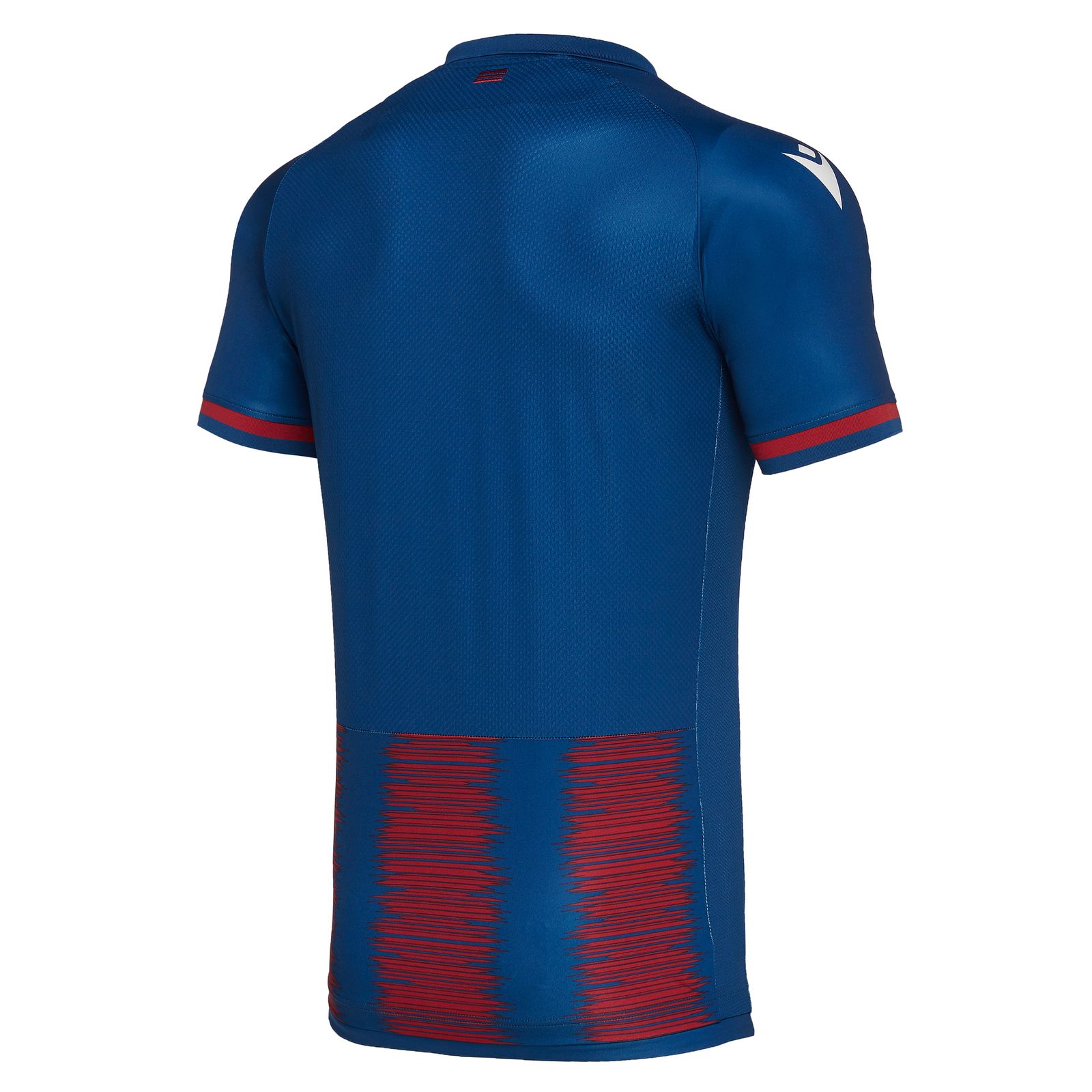 The Levante home match jersey, in softlock fabric, features garnet-red vertical stripes on a blue background with optical contrast.