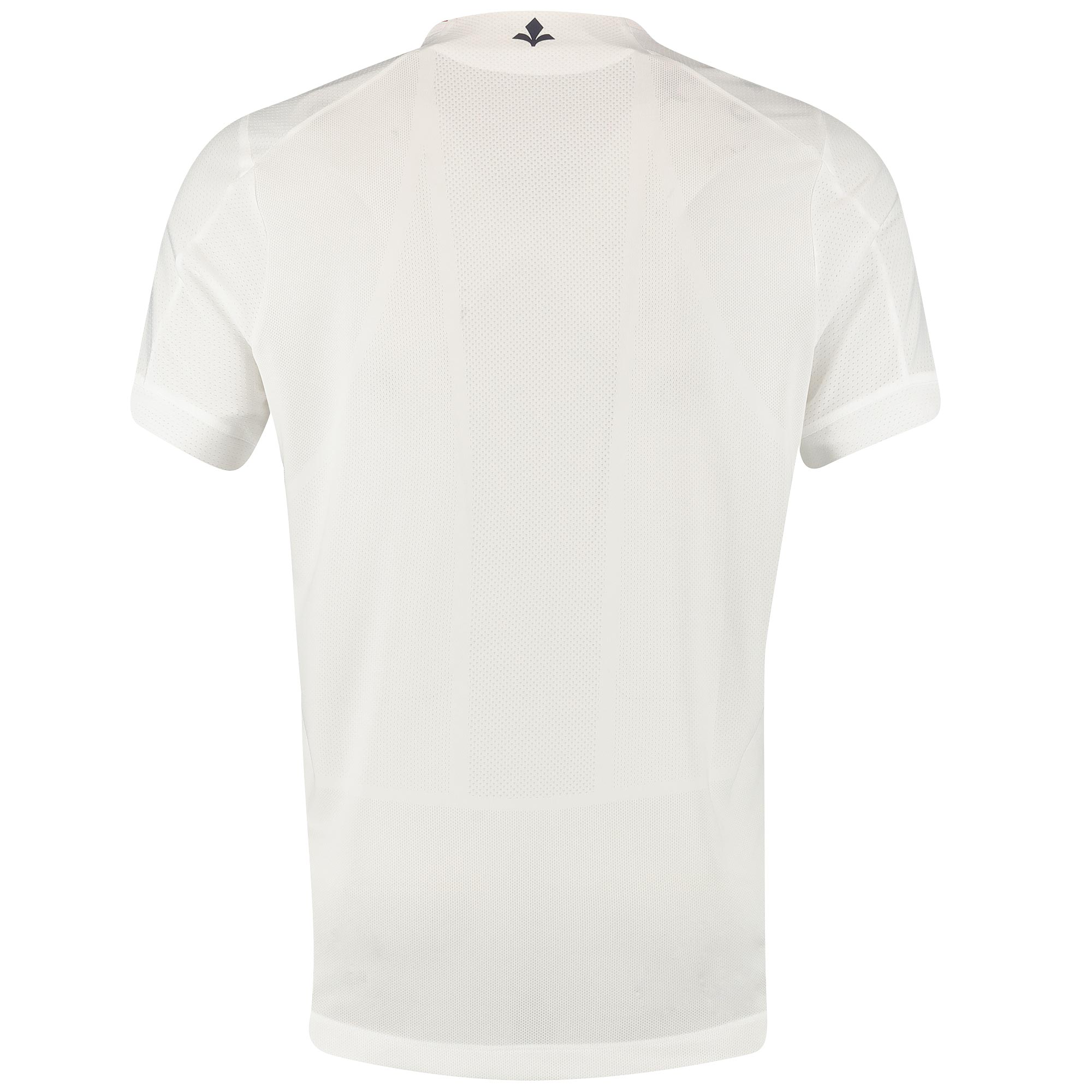 This white jersey sports a singular design representing the escutcheon and the Lille Citadel, which radiates to the north. Stripes with red and white details are present on the collar and the sleeves. The kit is completed with white shorts and white and navy socks.