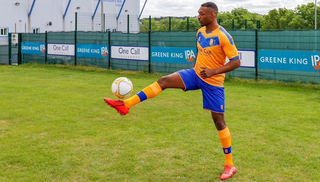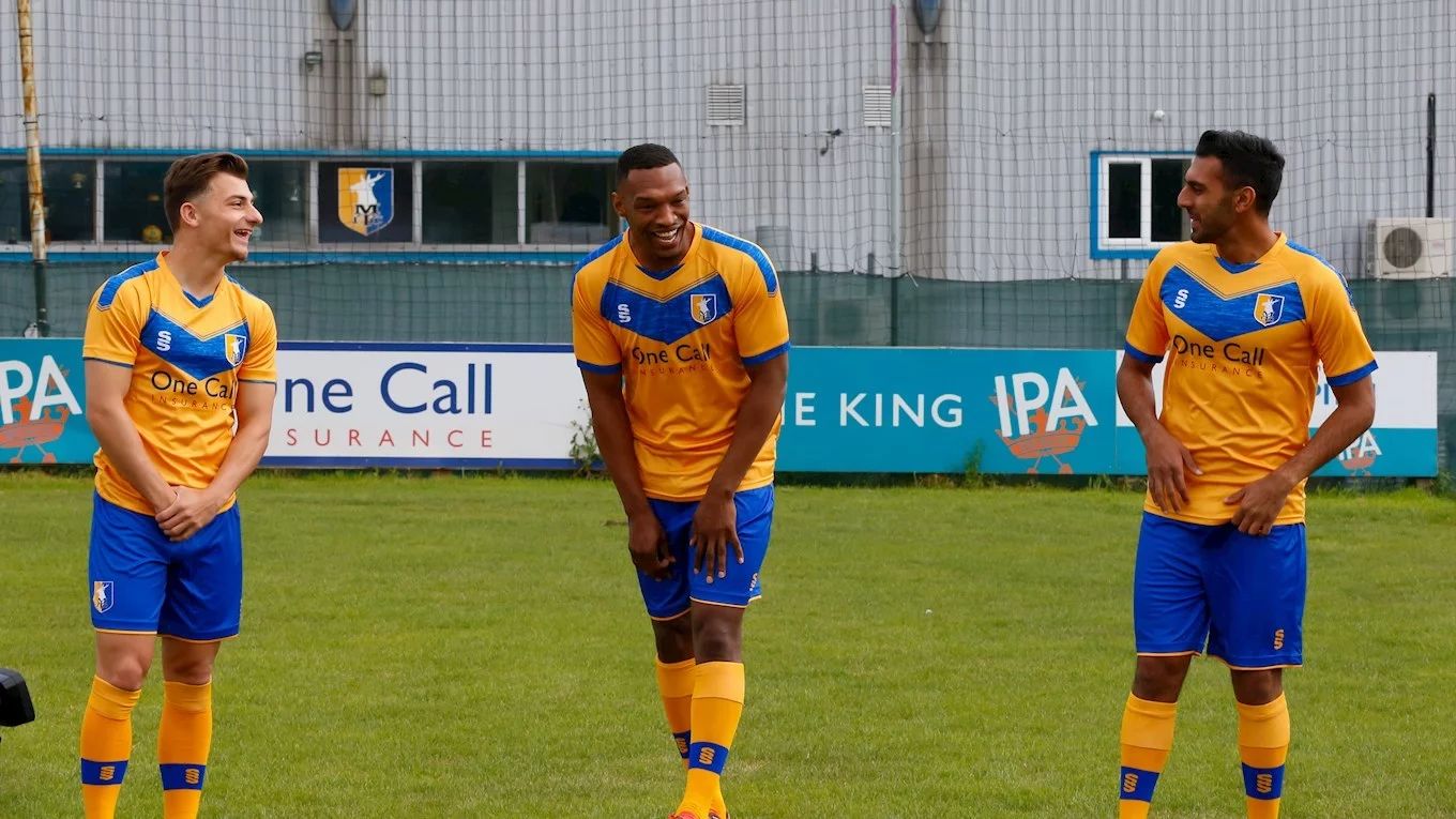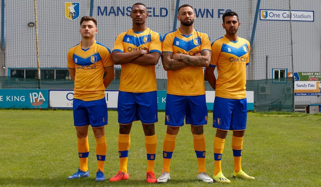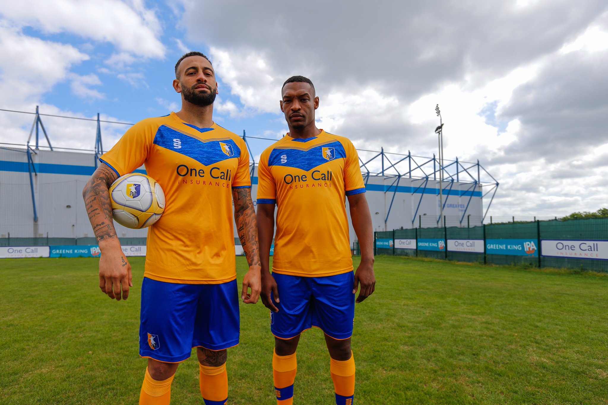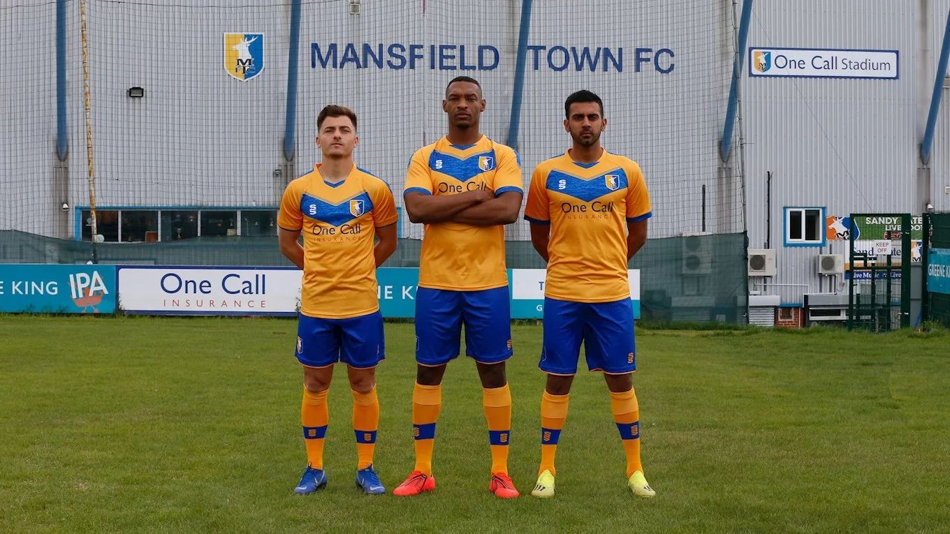 The new home shirt is sponsored by One Call Insurance, and features a stylish blue chevron overlapping the traditional amber of Mansfield Town.