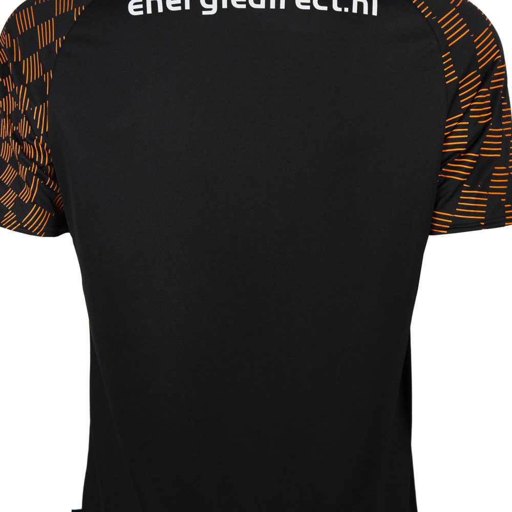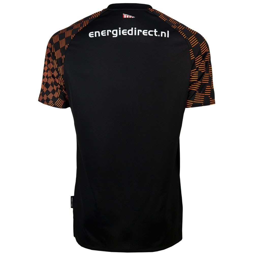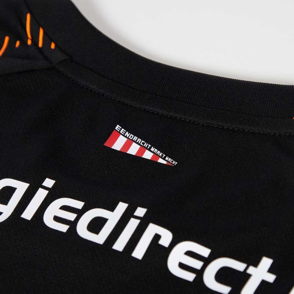 The Umbro designers have incorporated the club’s slogan ‘Eendracht maakt macht’ = ‘United We Stand’ in the collar of the shirt. The red and white striped logo is a reference to the first wooden stand from 1916 in the park. The shorts are orange and the kit will have black socks.