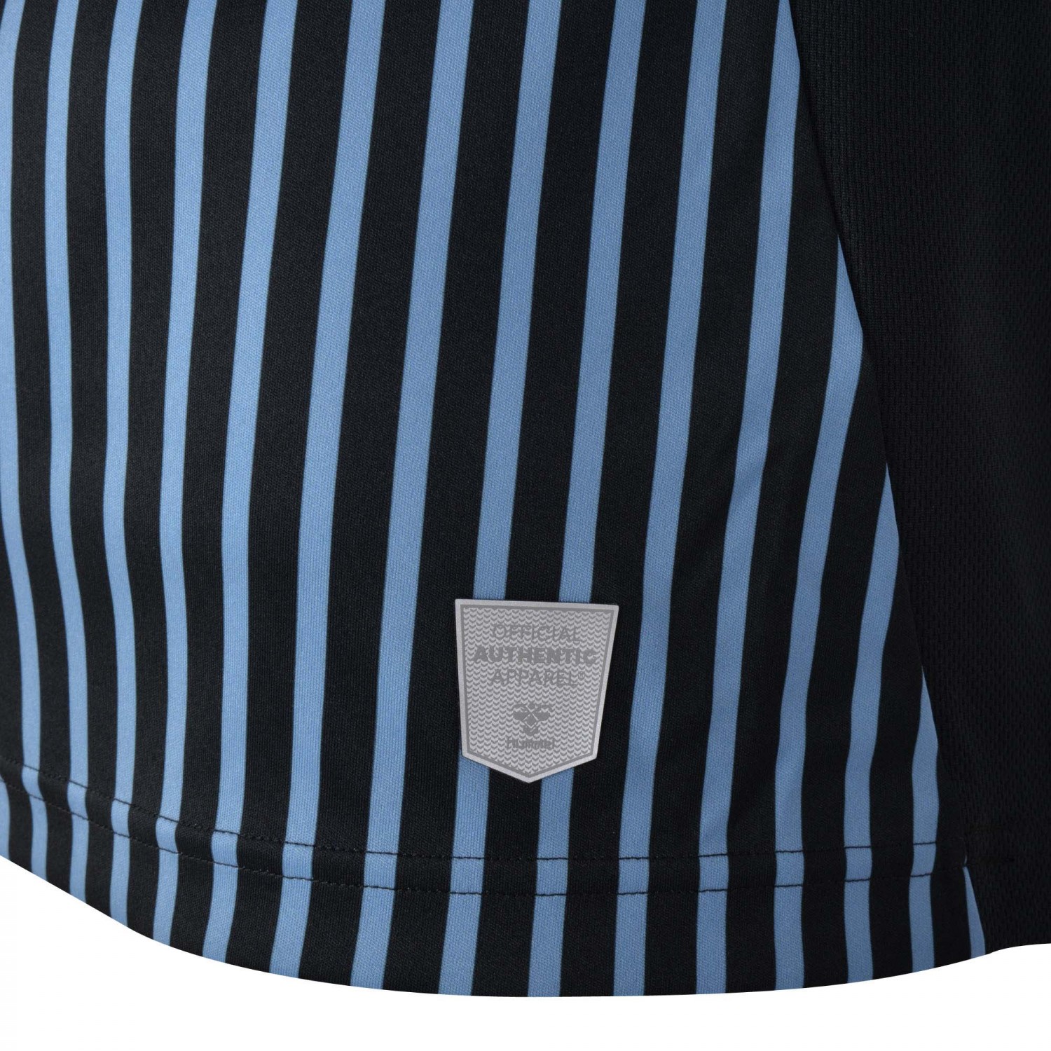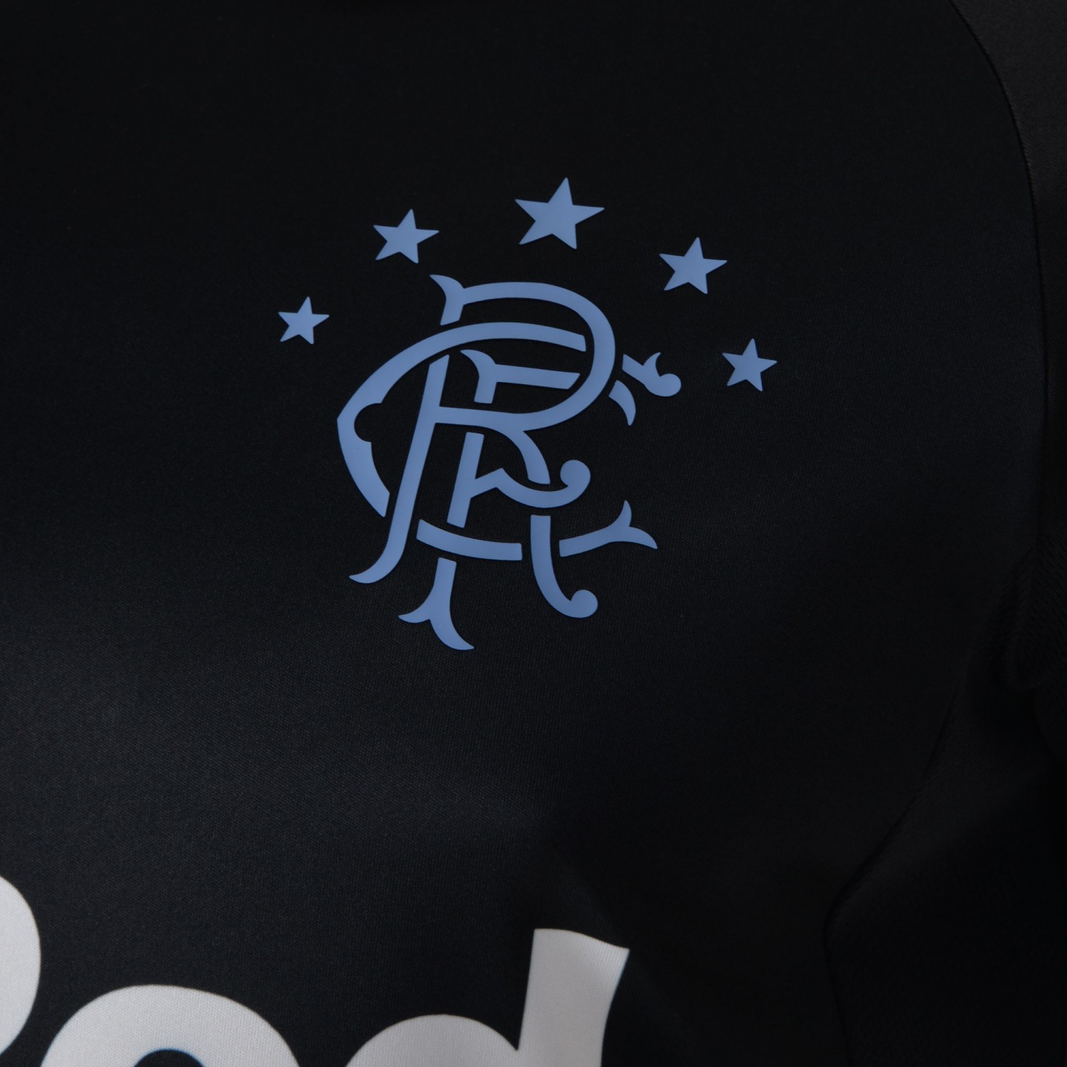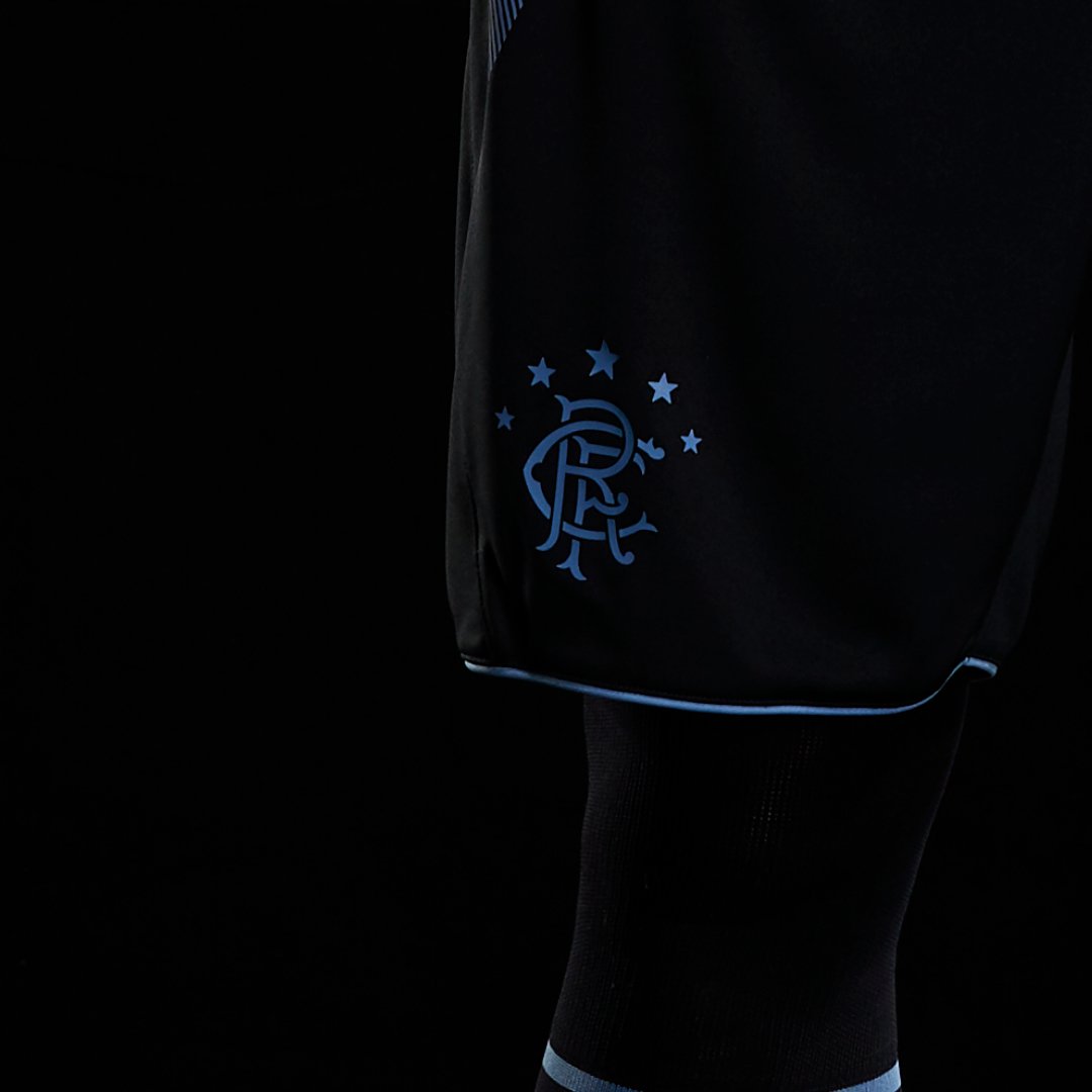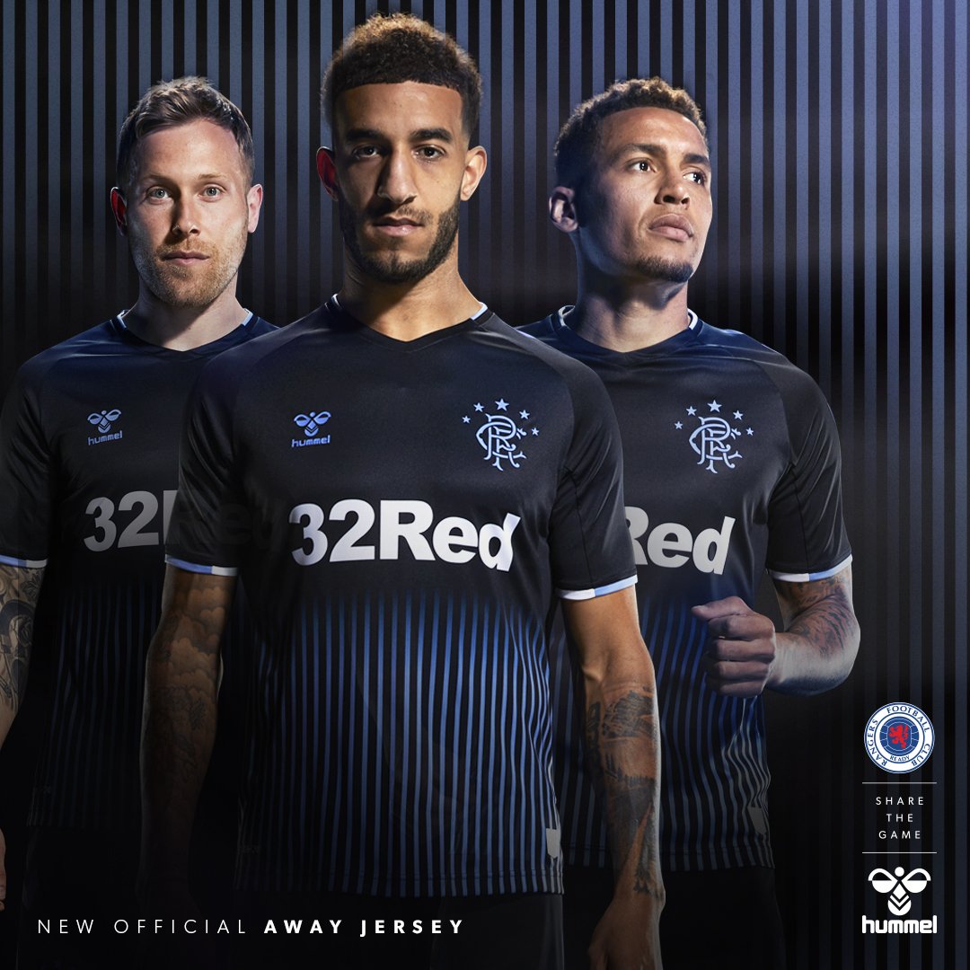 The new away shirt is black with a blue pin stripe fade design. Rangers FC crest and Hummel logo to the front along with the sponsor, Hummel chevrons in blue to shoulders.