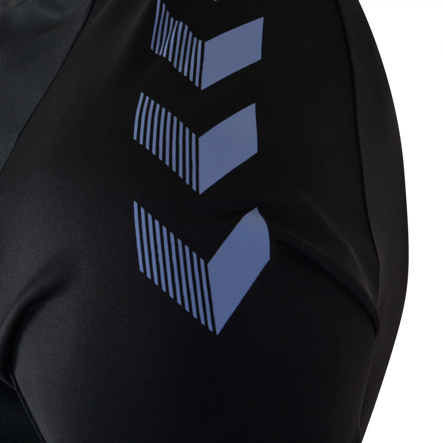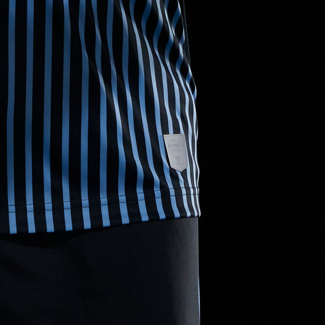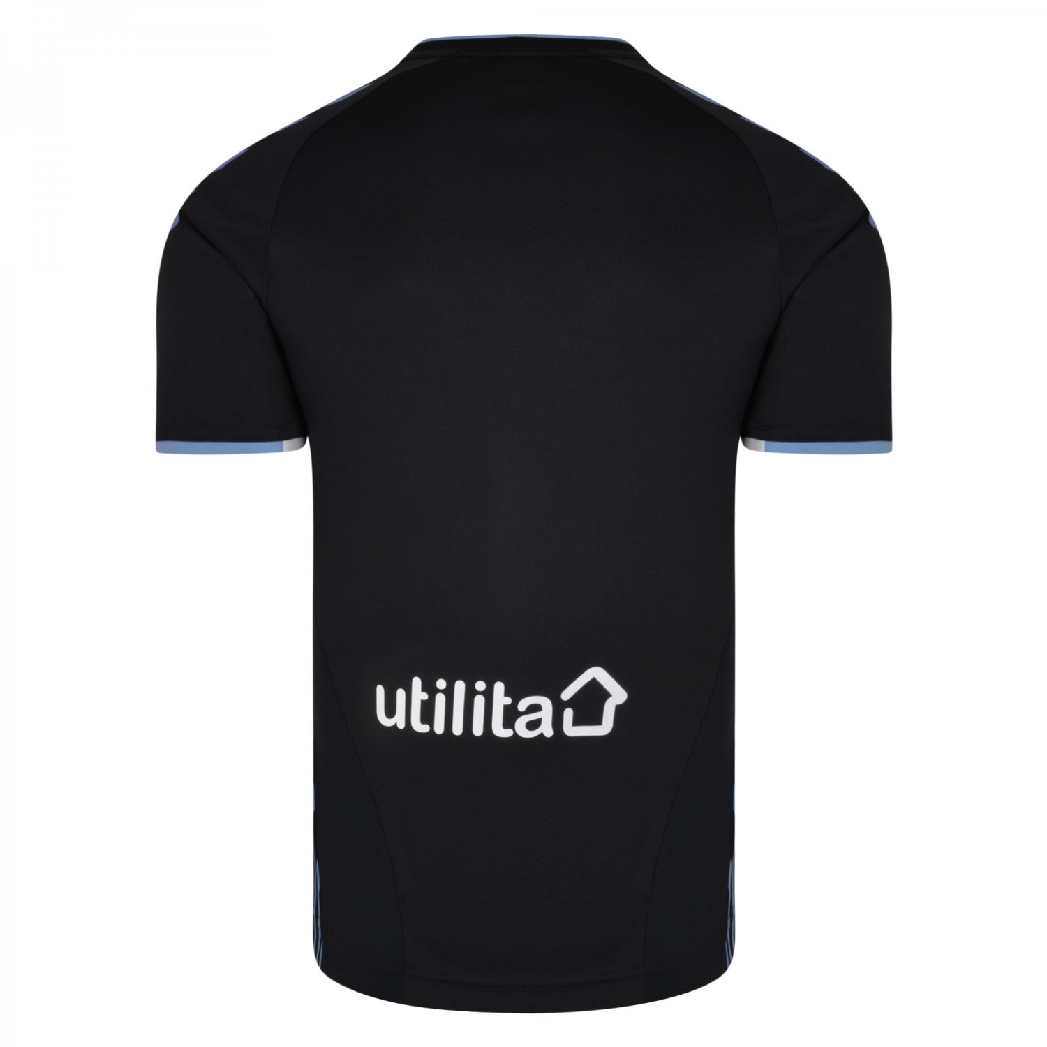 The new away shirt is black with a blue pin stripe fade design. Rangers FC crest and Hummel logo to the front along with the sponsor, Hummel chevrons in blue to shoulders.