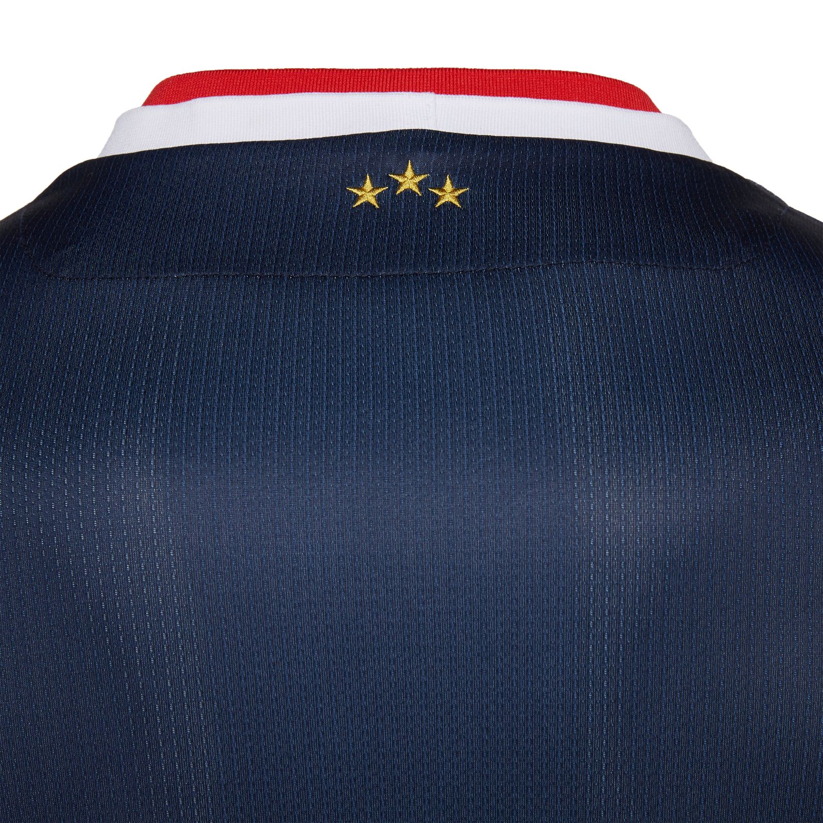The Away shirt which reflects the same technical features and cut as the Home, as well as the graphic and stylistic details, is Navy Blue. Shorts and socks of the same colour as the shirts complete each kit.