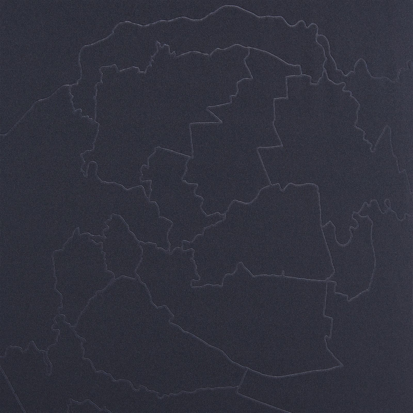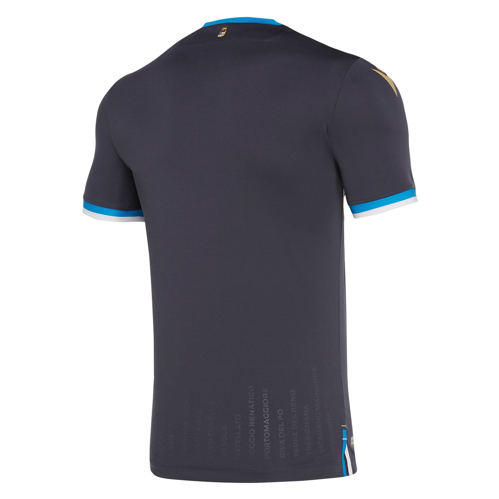 The Spal third shirt is unique thanks to the anthracite colour with white, azure blue and gold details. The front features an embossed map of the province of Ferrara in the middle, while the back has a list of the municipalities of the province of Ferrara, also embossed. The club badge is on the left-hand side of the chest. The back of the neck features the city crest. The neck has a Mandarin collar.