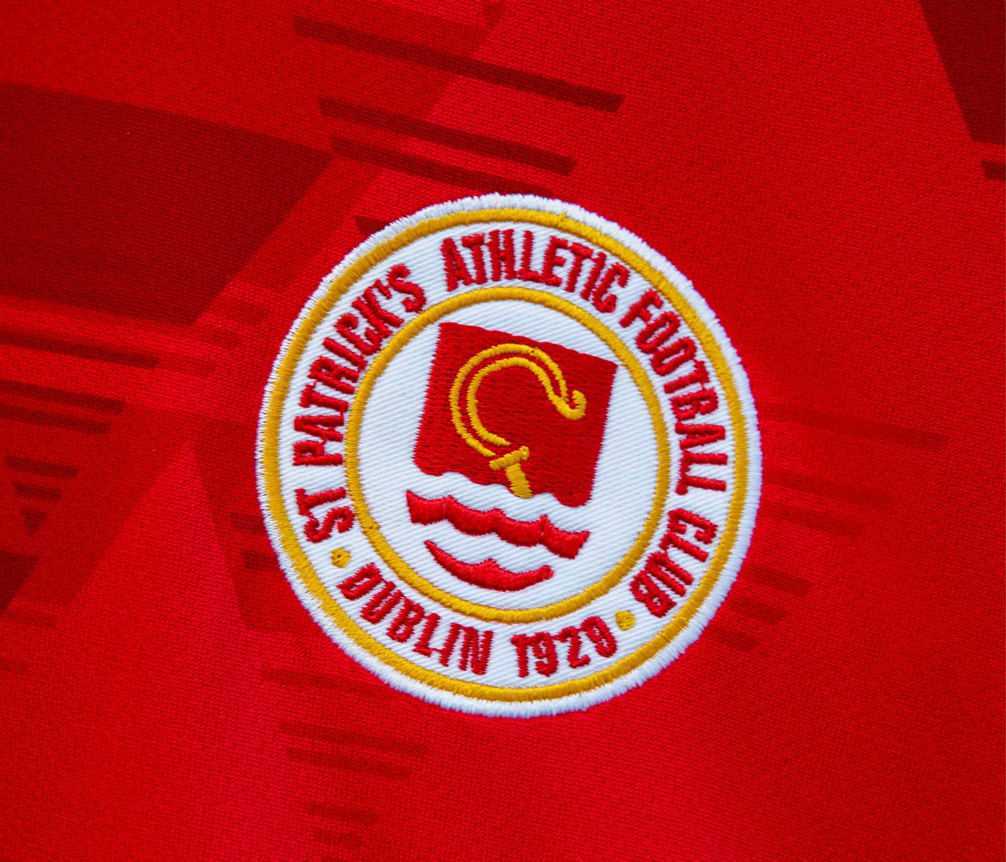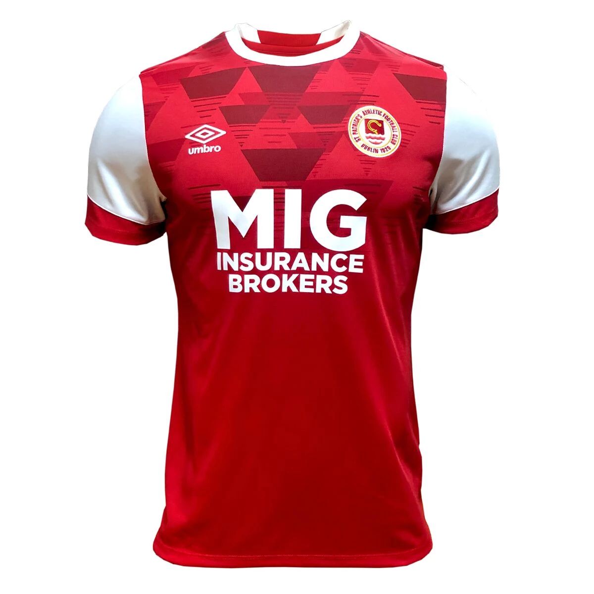 The 2020 home kit incorporates a clean red and white design with an embroidered St Patricks Athletic FC crest on left chest.