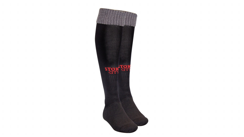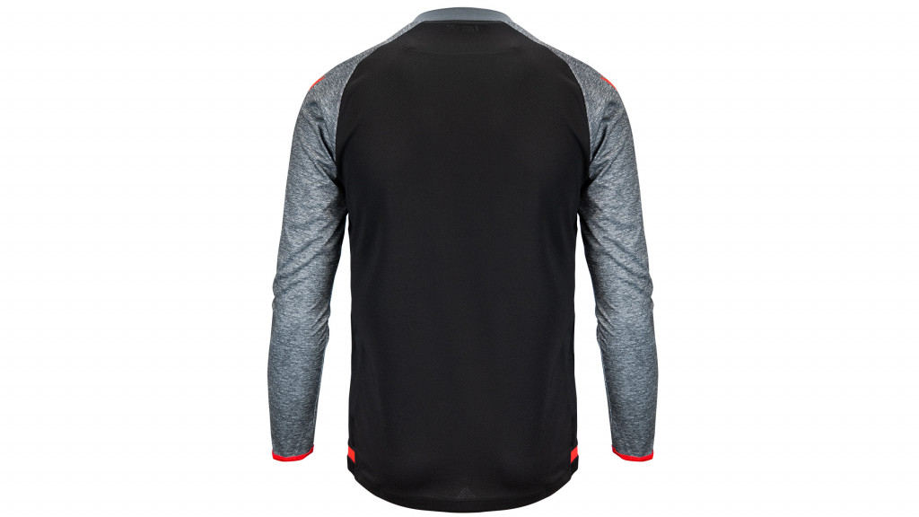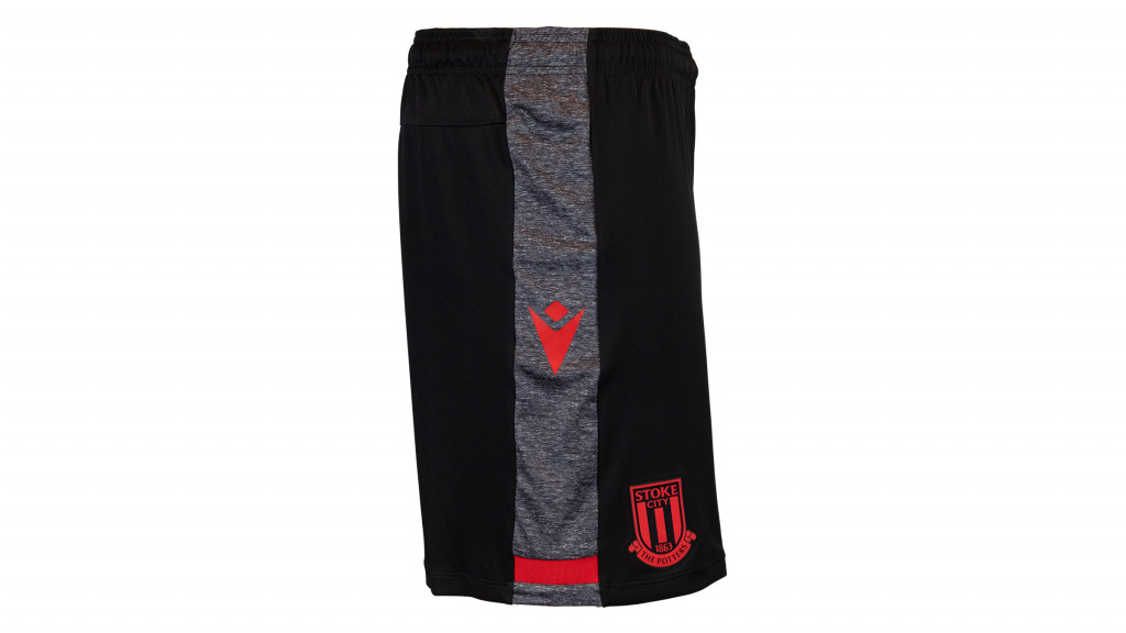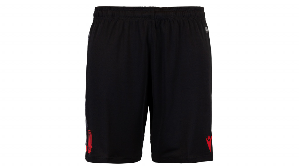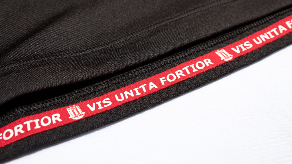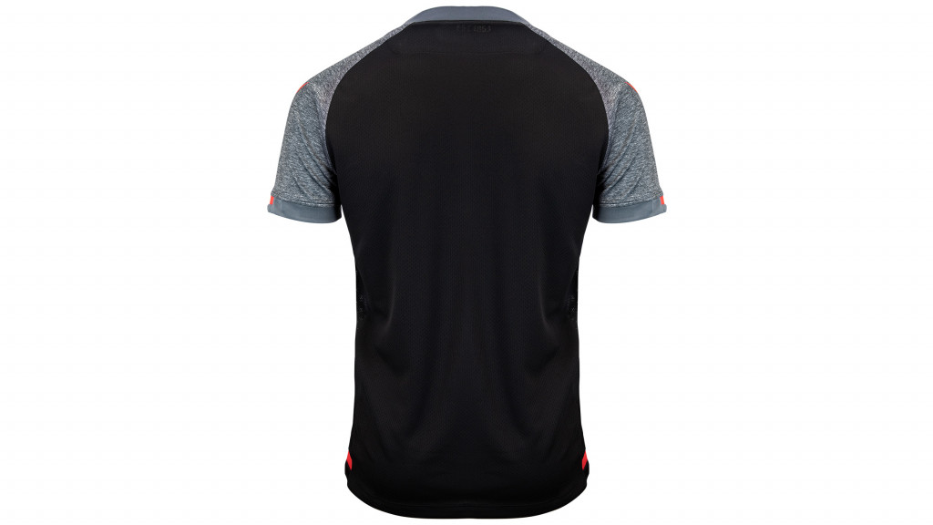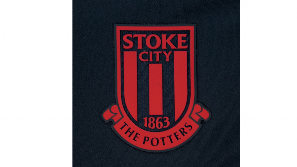 The away jersey has a completely new shirt template with a Raglan sleeve composition. The main body of the garment is in black with all shirt application in Stoke Red and black rear insert in micromesh as well as red rib-knit trims on the sleeves.