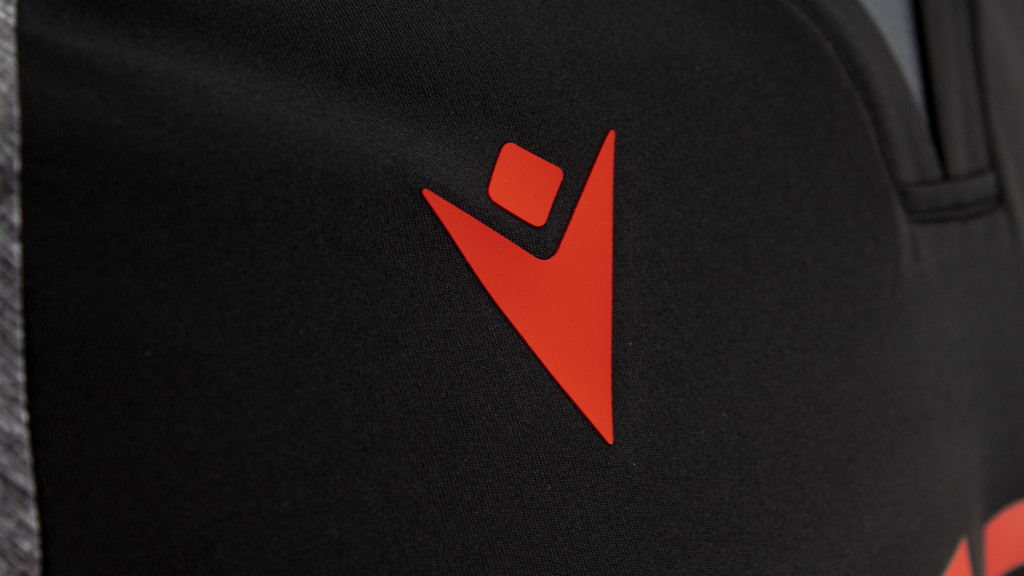 Both the Macron logo on the right chest and the Club crest on the left chest are in a rubber application.