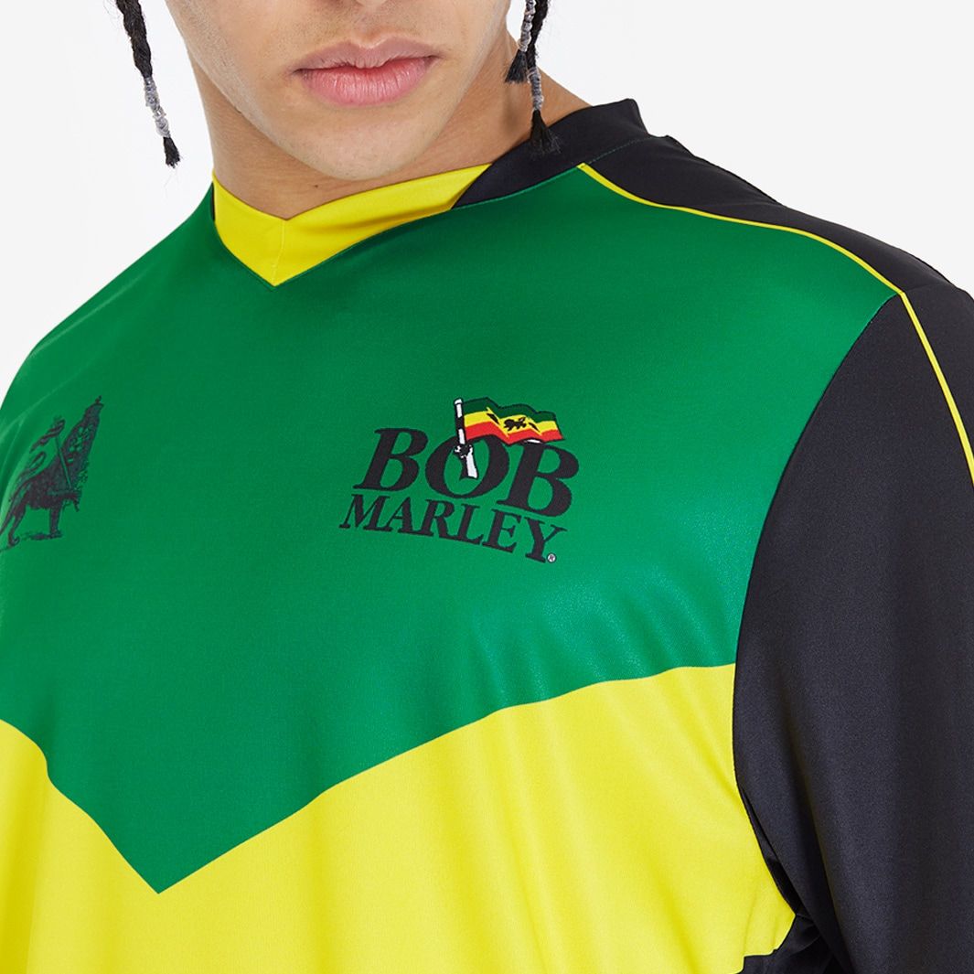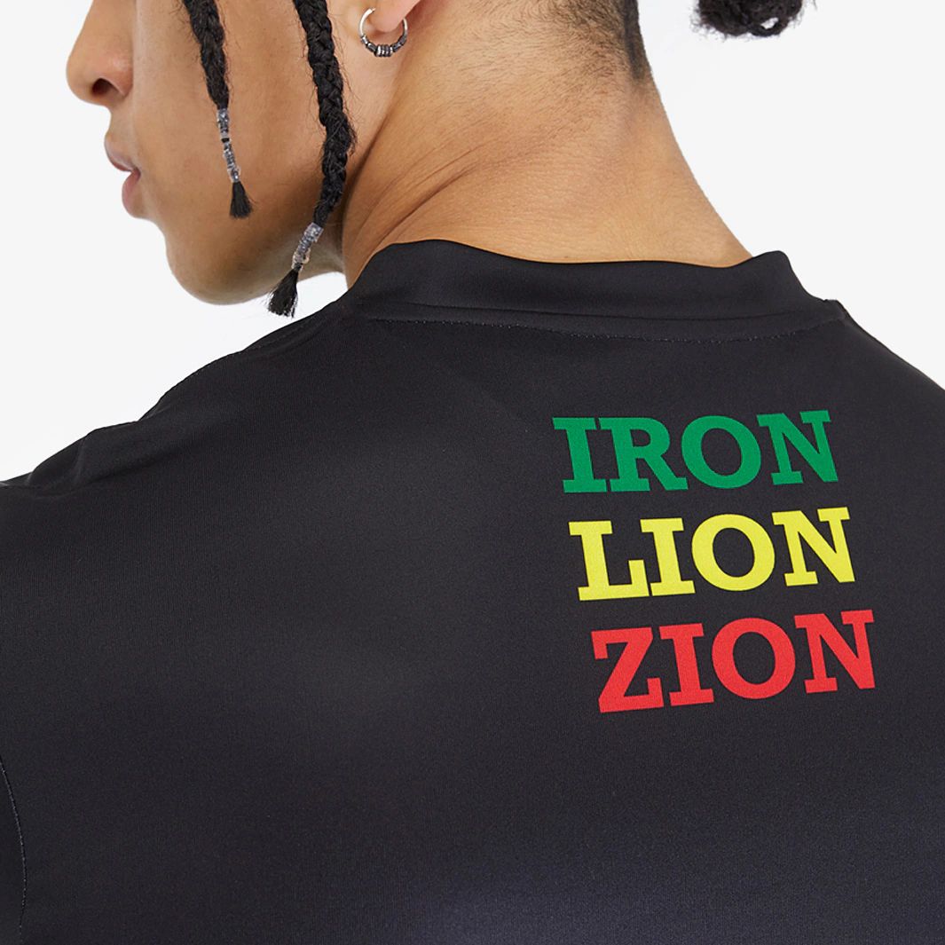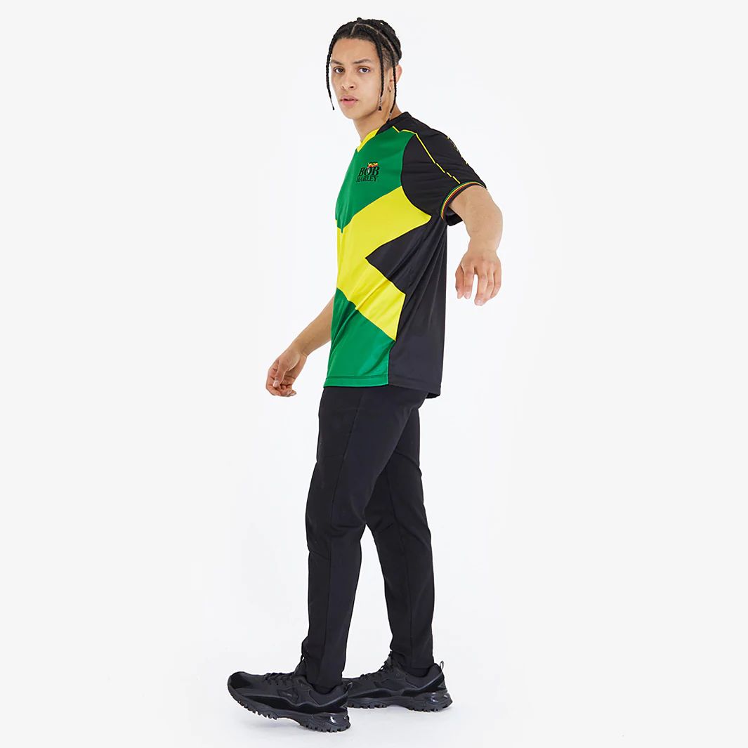 The Rock FC Bob Marley Iron Lion shirt in green, yellow and black pays tribute to the reggae legend's Jamaican heritage and has a Lion of Judah depiction in the traditional place where a brand logo would be.