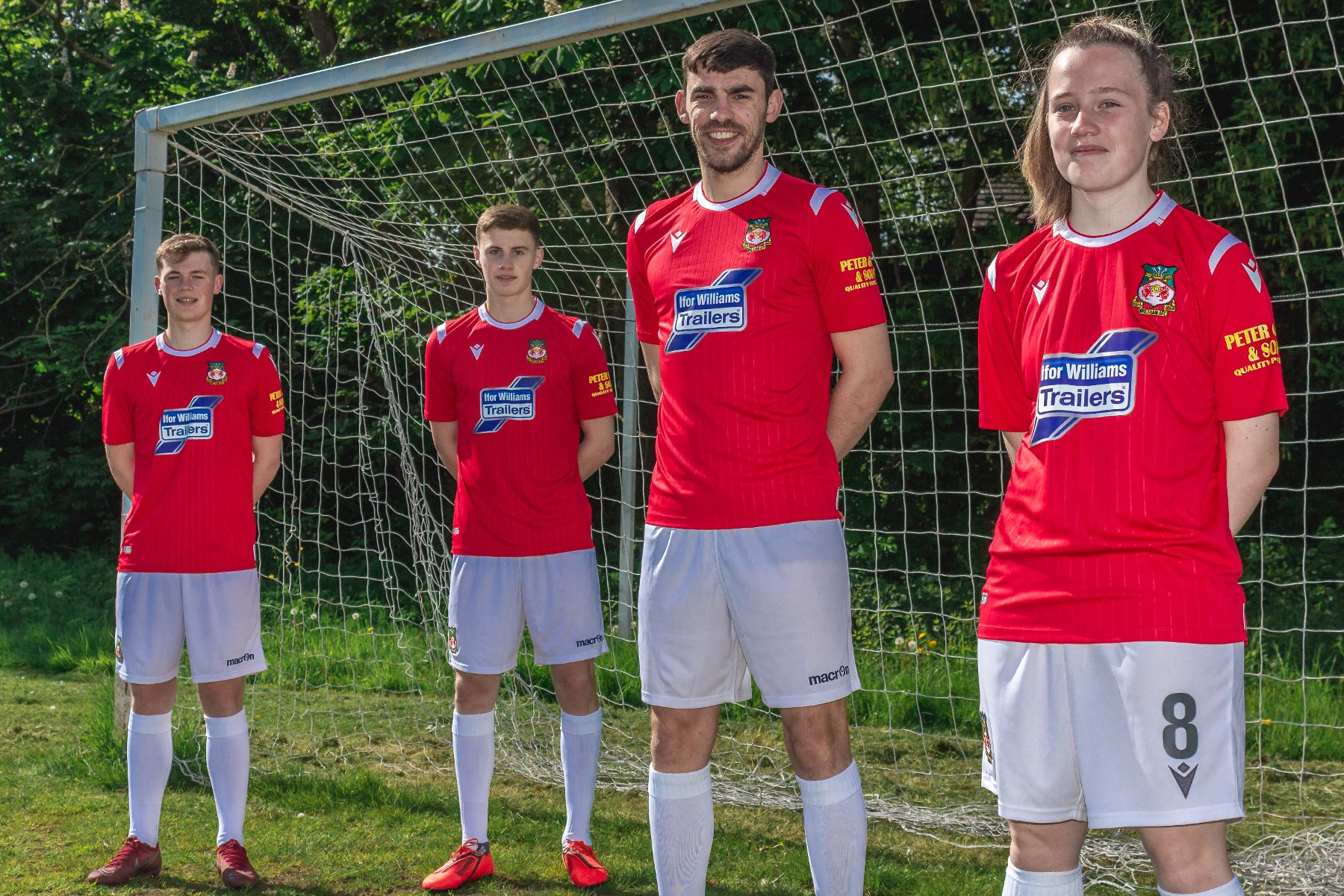 The shirt is in the traditional red of Wrexham and has a distinctive white neck trim with thin detailed vertical stripes. The shirts will sport AEC Engineering Ltd as the back of shirt sponsor and Peter Gwyn & Sons Potatoes as sleeve sponsor.