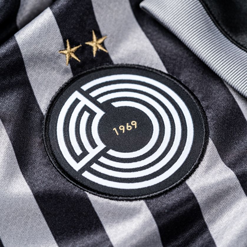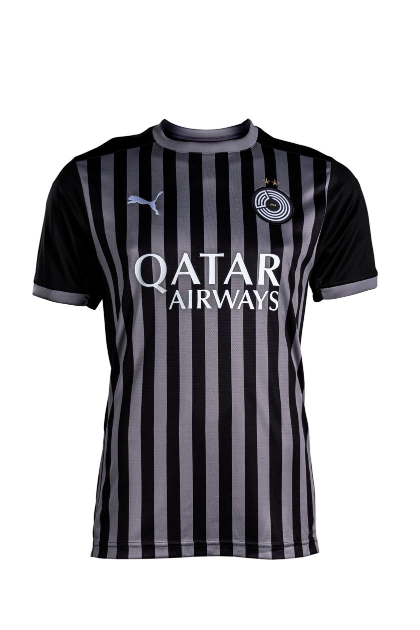 The new Away shirt is in black and grey stripes, with the sleeves in solid black and the neck and cuffs in grey. The “Qatar Airways” sponsor is rendered in white, while the crest is present and correct on the crest in recognisable colouring - albeit reversed from the version which appears on the Home shirt.