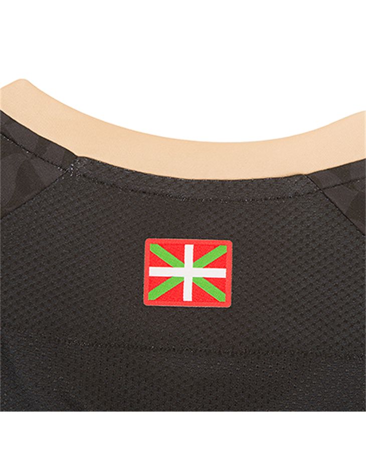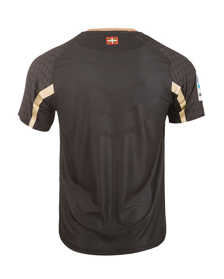 The shorts and socks continue the gold and black theme, which even sees the shirt carry the Betway sponsorship logo in gold, and the only injections of other colours are via the miniature Basque flag on the upper back and the La Liga patch on the sleeve.