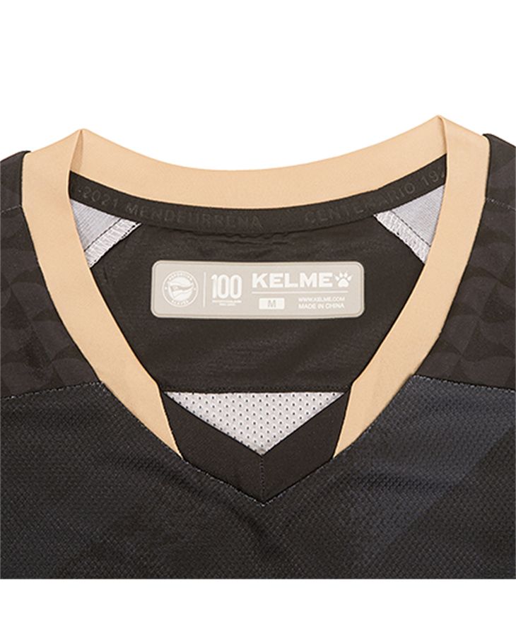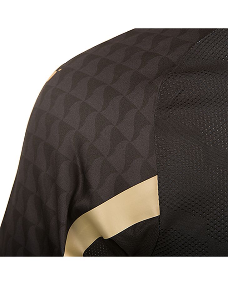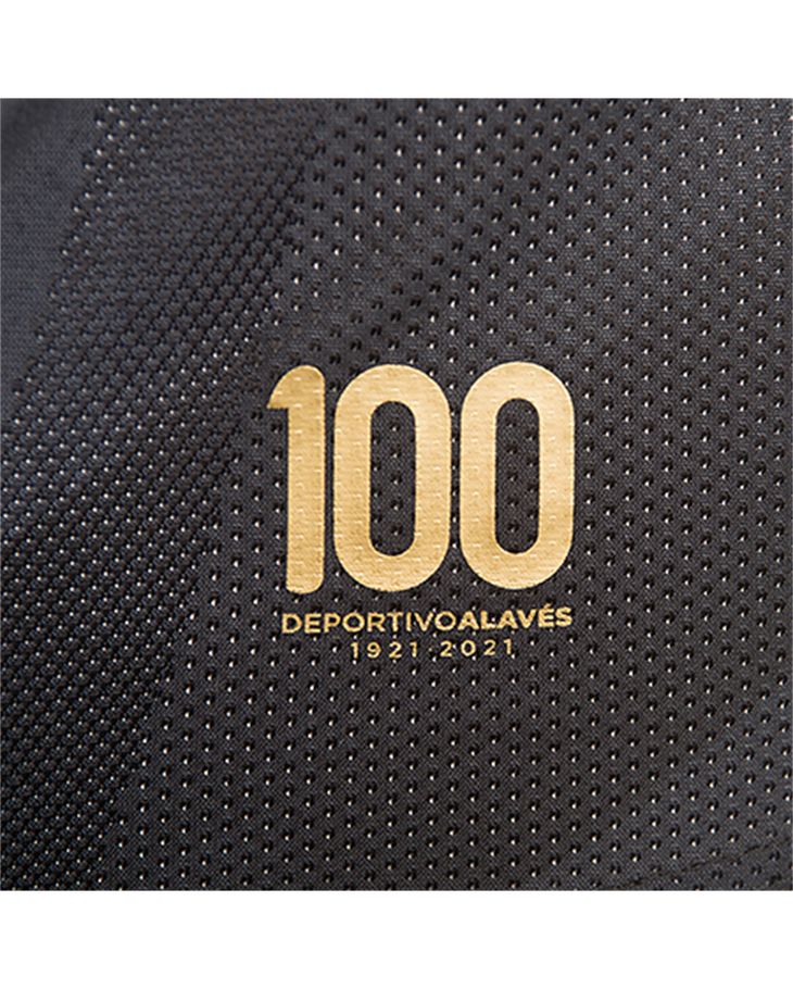 The black shirt is decorated with gold trim and detailing, perhaps as further celebration of the club’s centenary beyond the “100” print. There is a repeated, “go faster”-style repeated chevron texture to the torso, with a repetition of the crest’s flag motif repeated on the sleeves.