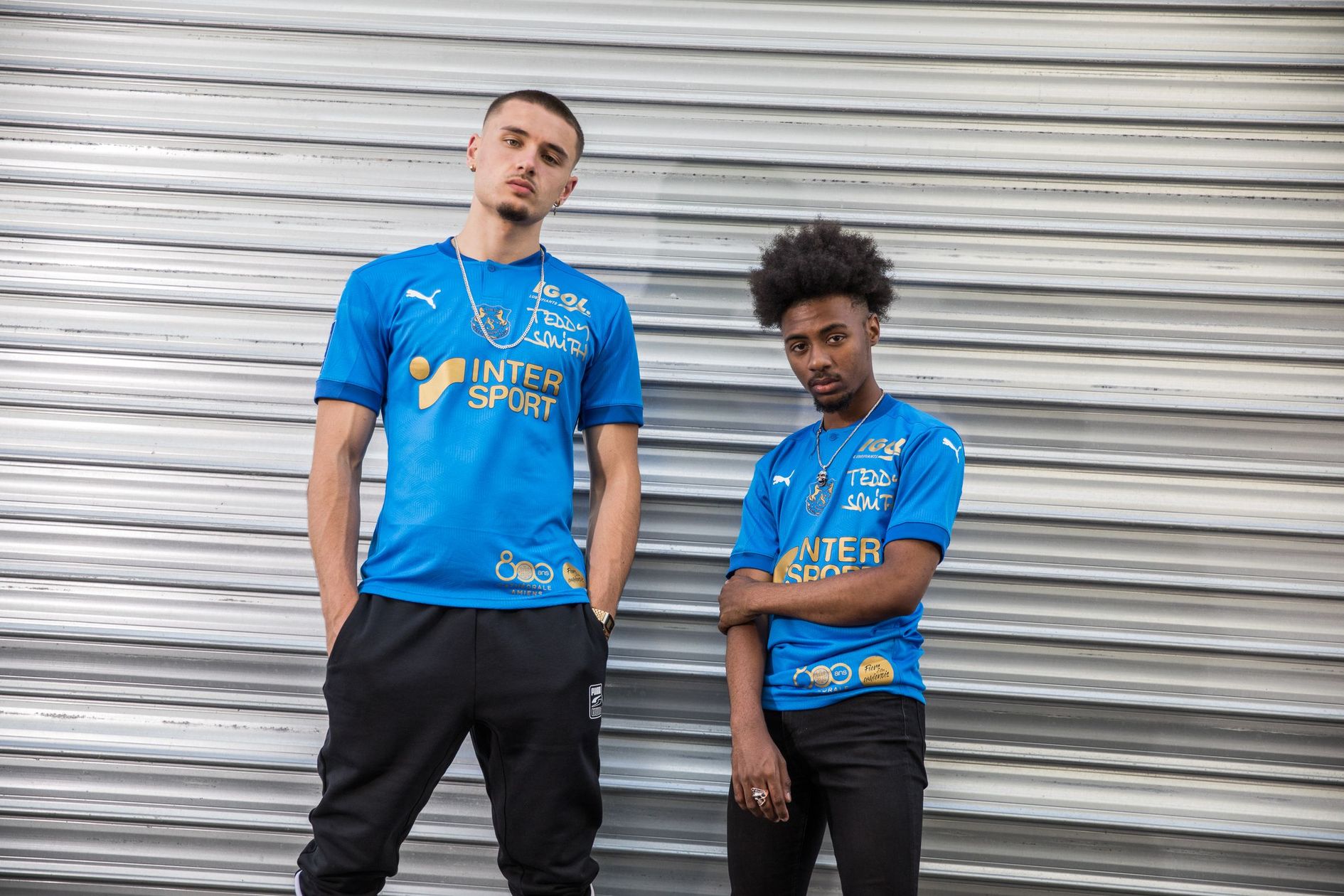 The new secondary change design for the French Ligue 2 side takes a relatively simple base of light blue shirt with royal blue collar and cuffs and white Puma logos, and essentially blings it up with gold decoration by way of the converted crest and partner sponsorship branding.