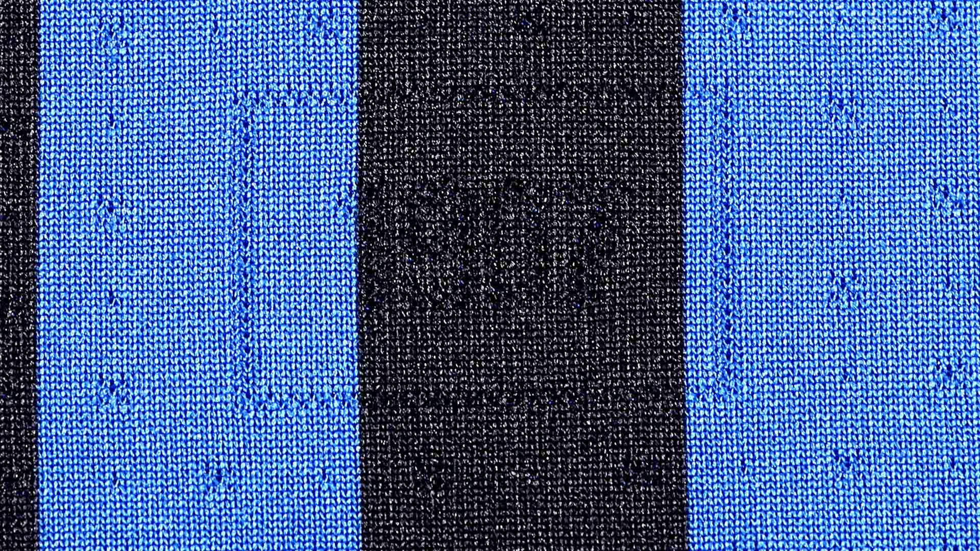 Featuring narrower than usual “Nerazzurri” stripes, the shirt has a somewhat retro feel, and has the addition of a repeated pattern of crest and date of establishment in the fabric jacquard.