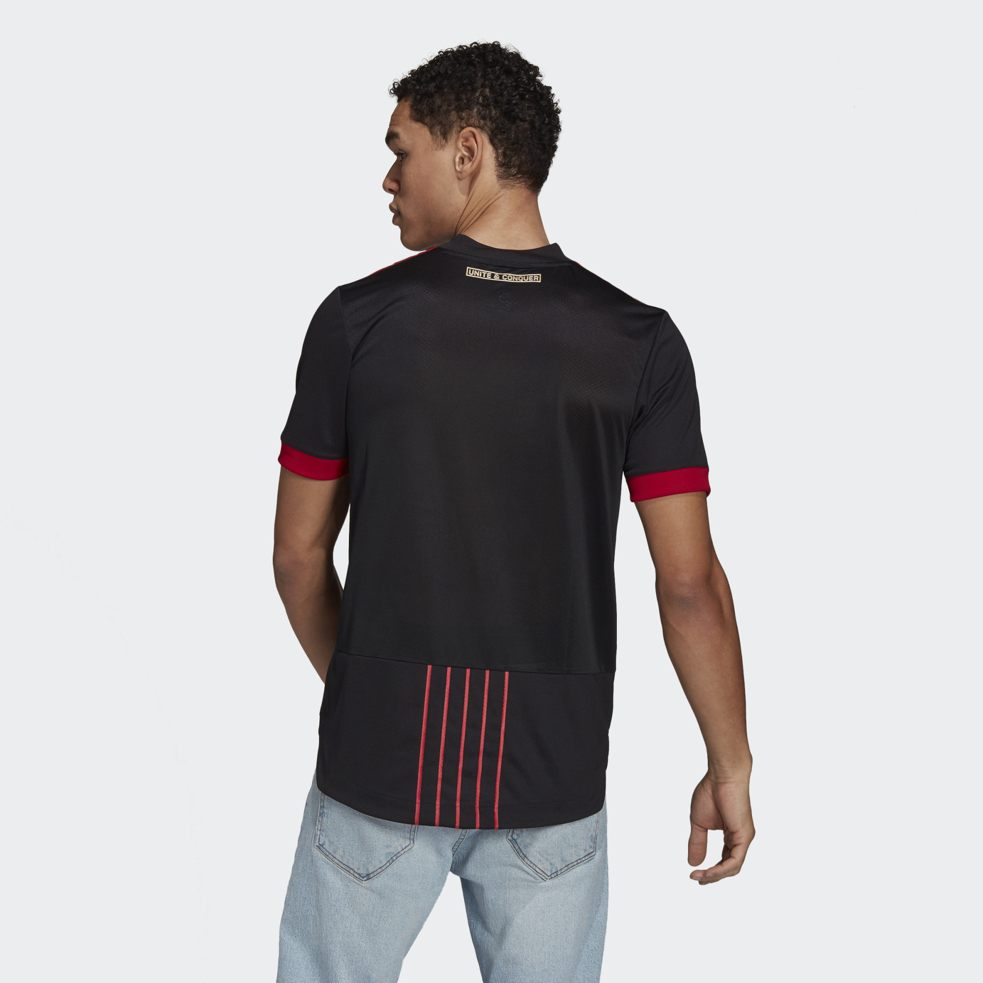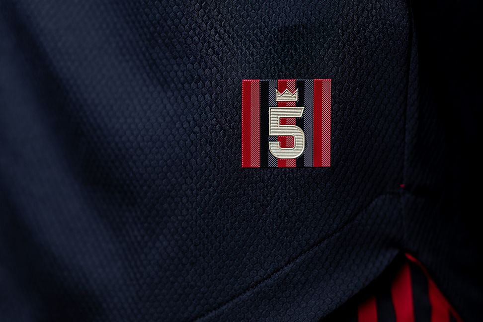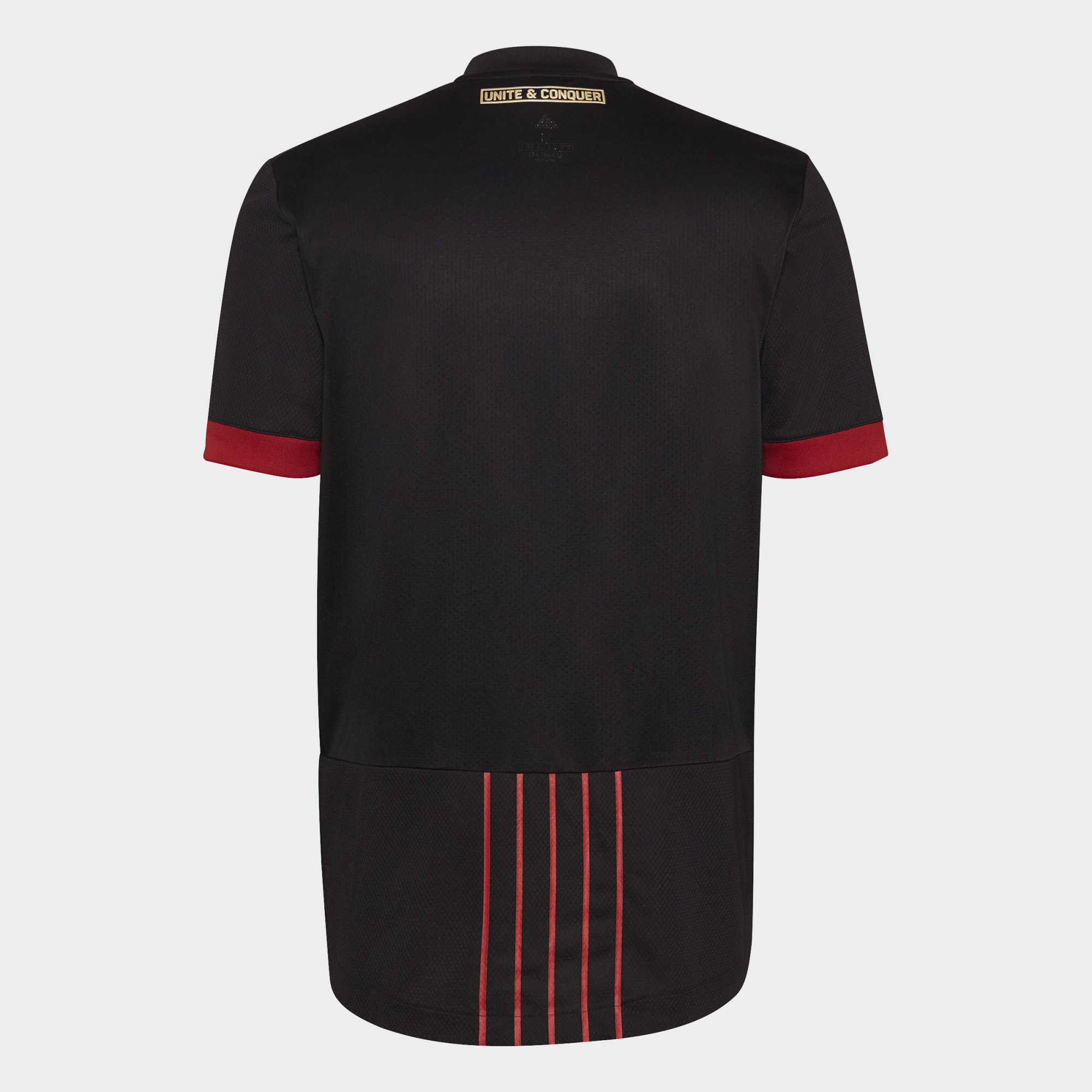 The kit is solid black with 5-Stripes in red down the middle of the jersey. The 5-Stripes represent the club’s pillars: Unity. Excellence. Community. Determination. Innovation.