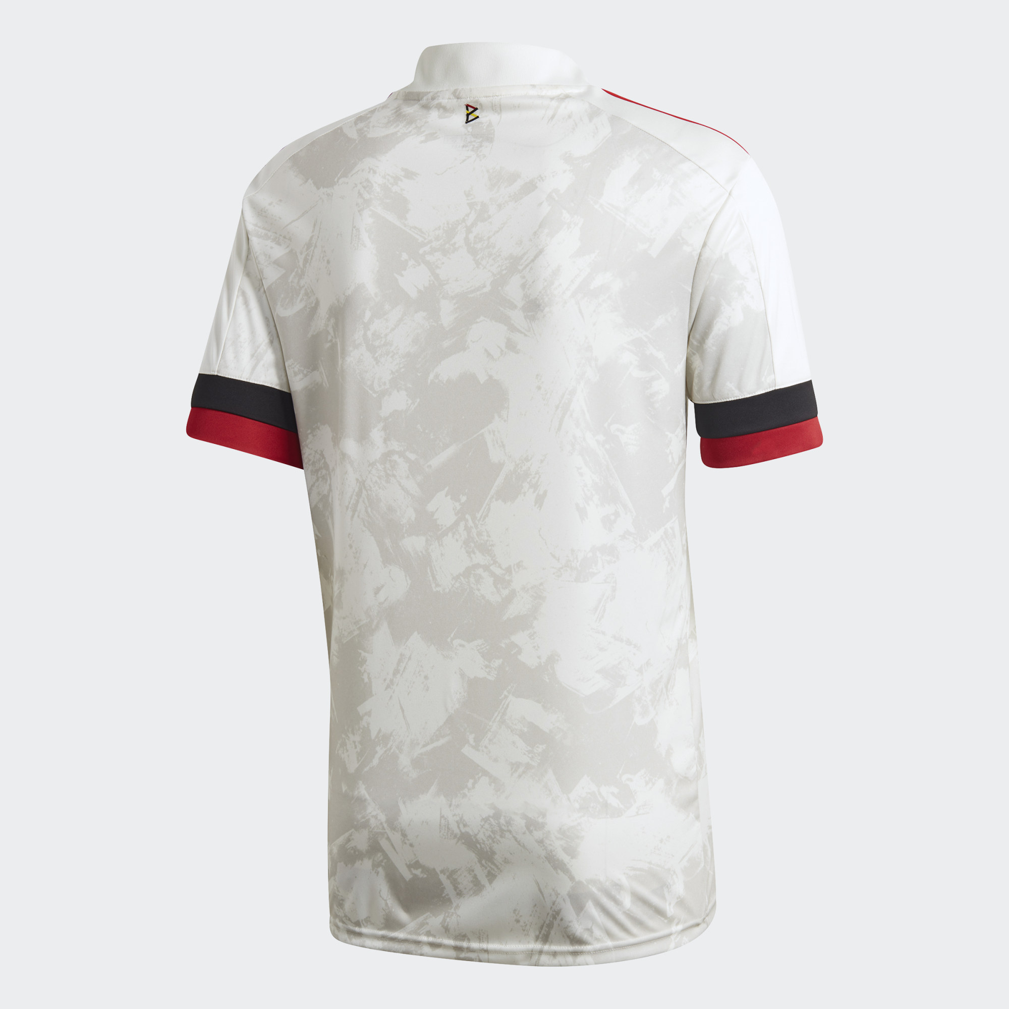 This adidas football jersey has an off-white painterly design with red and black details. An embroidered crest takes its place above the heart.