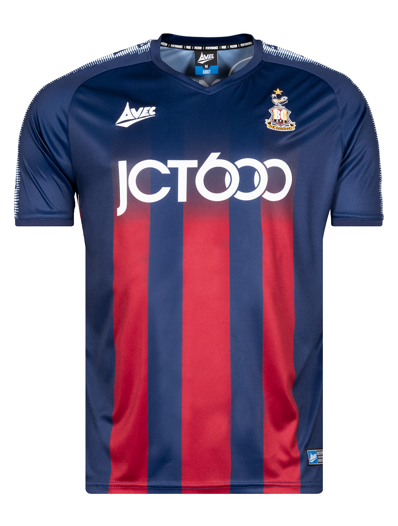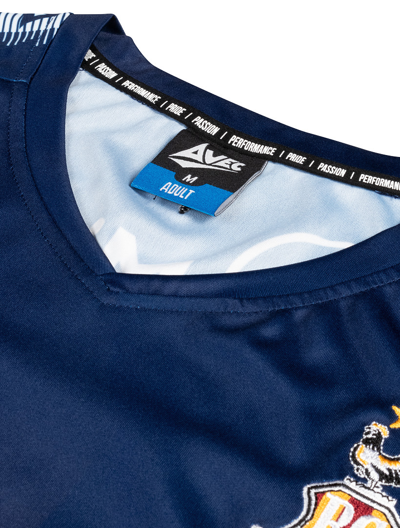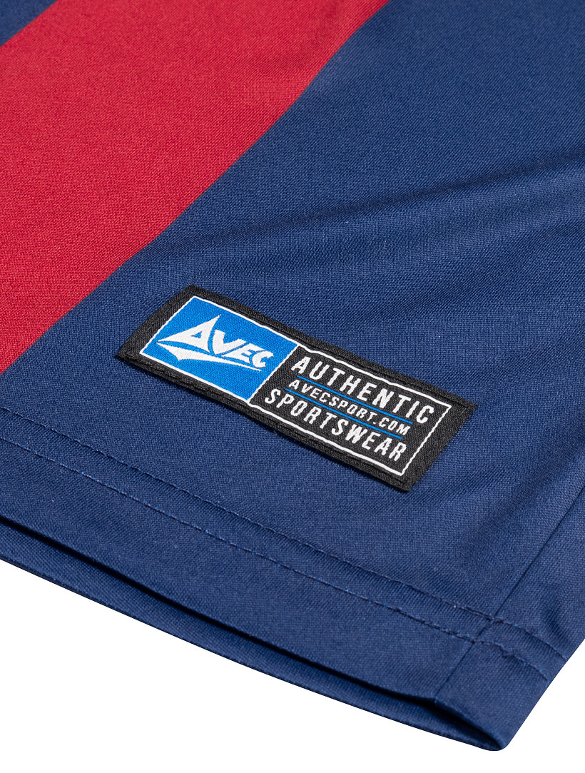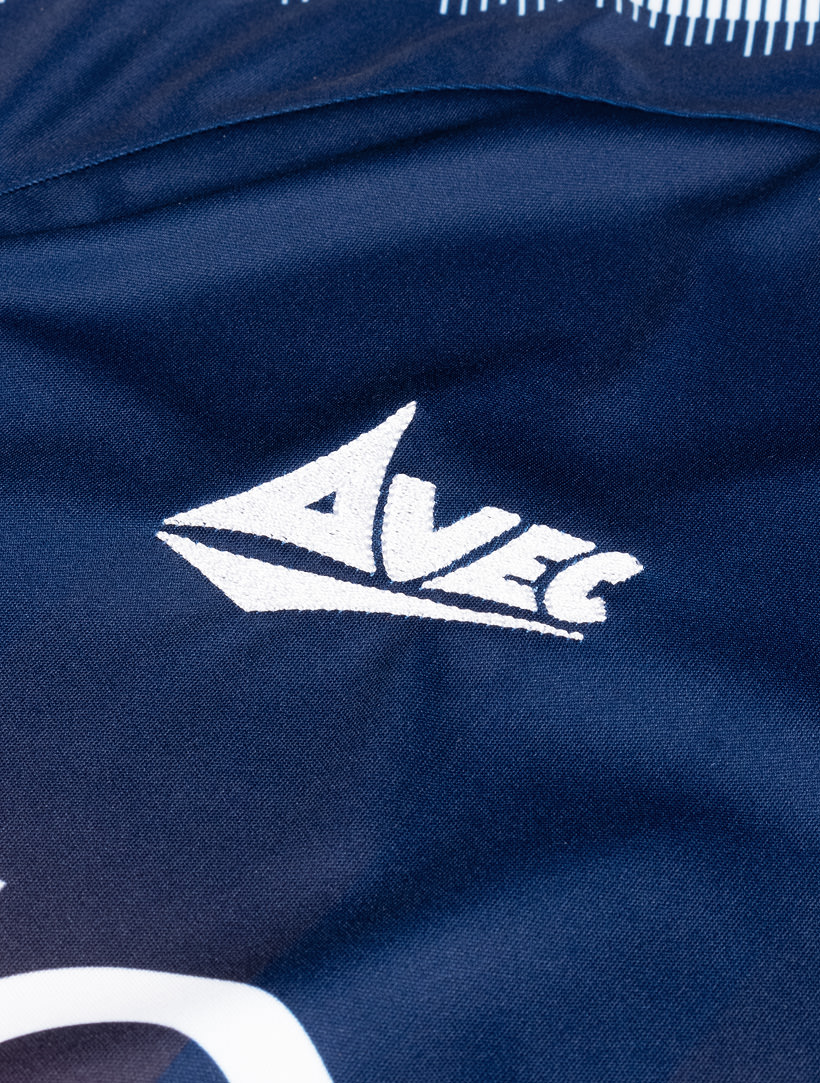 The navy blue shirt features fading claret stripes, an overlapping ‘V-neck’ collar and ribbed, cuffed sleeves with sublimated Avec Sport taping in white.