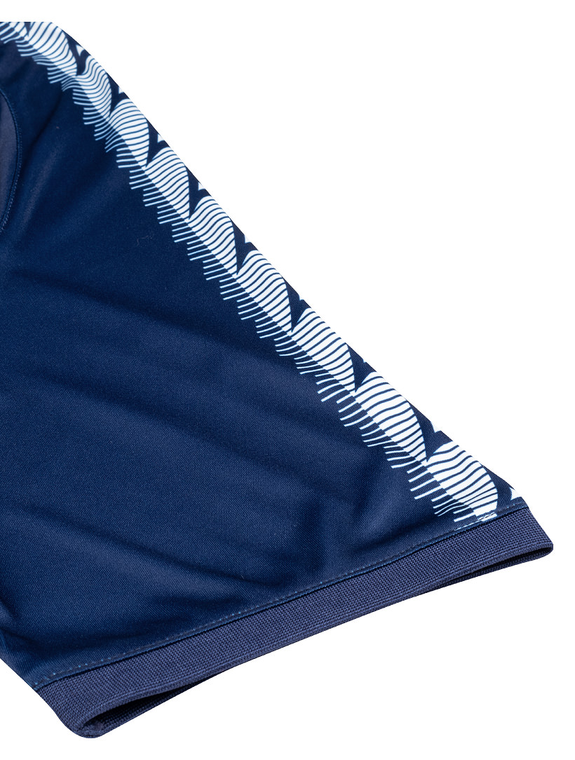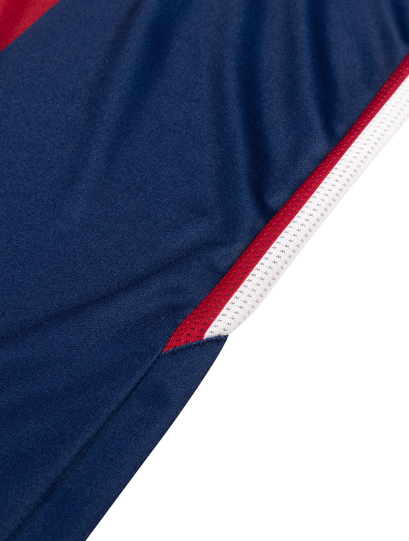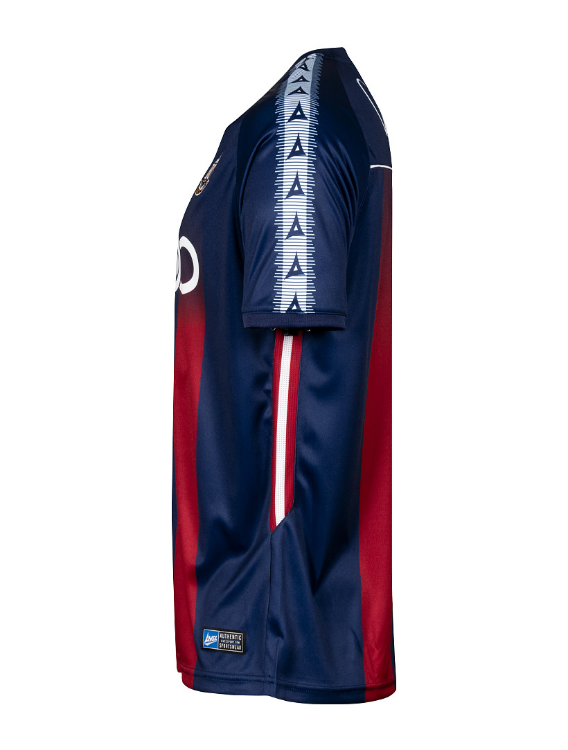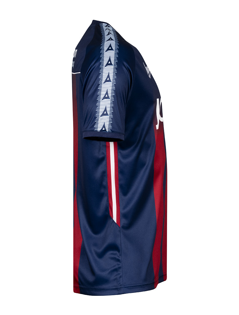 The navy blue shirt features fading claret stripes, an overlapping ‘V-neck’ collar and ribbed, cuffed sleeves with sublimated Avec Sport taping in white.