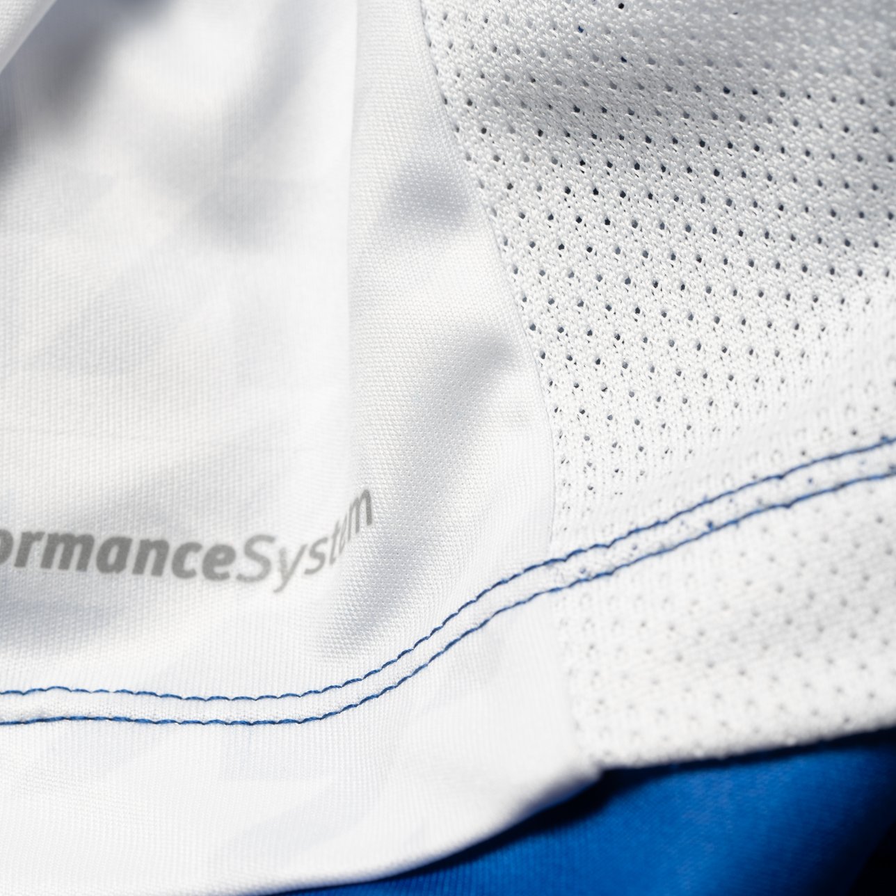 The kit includes a collar and the shorts continue the theme present in the shirt with a blue bulk and a white trim, with the socks mainly blue with white detail.