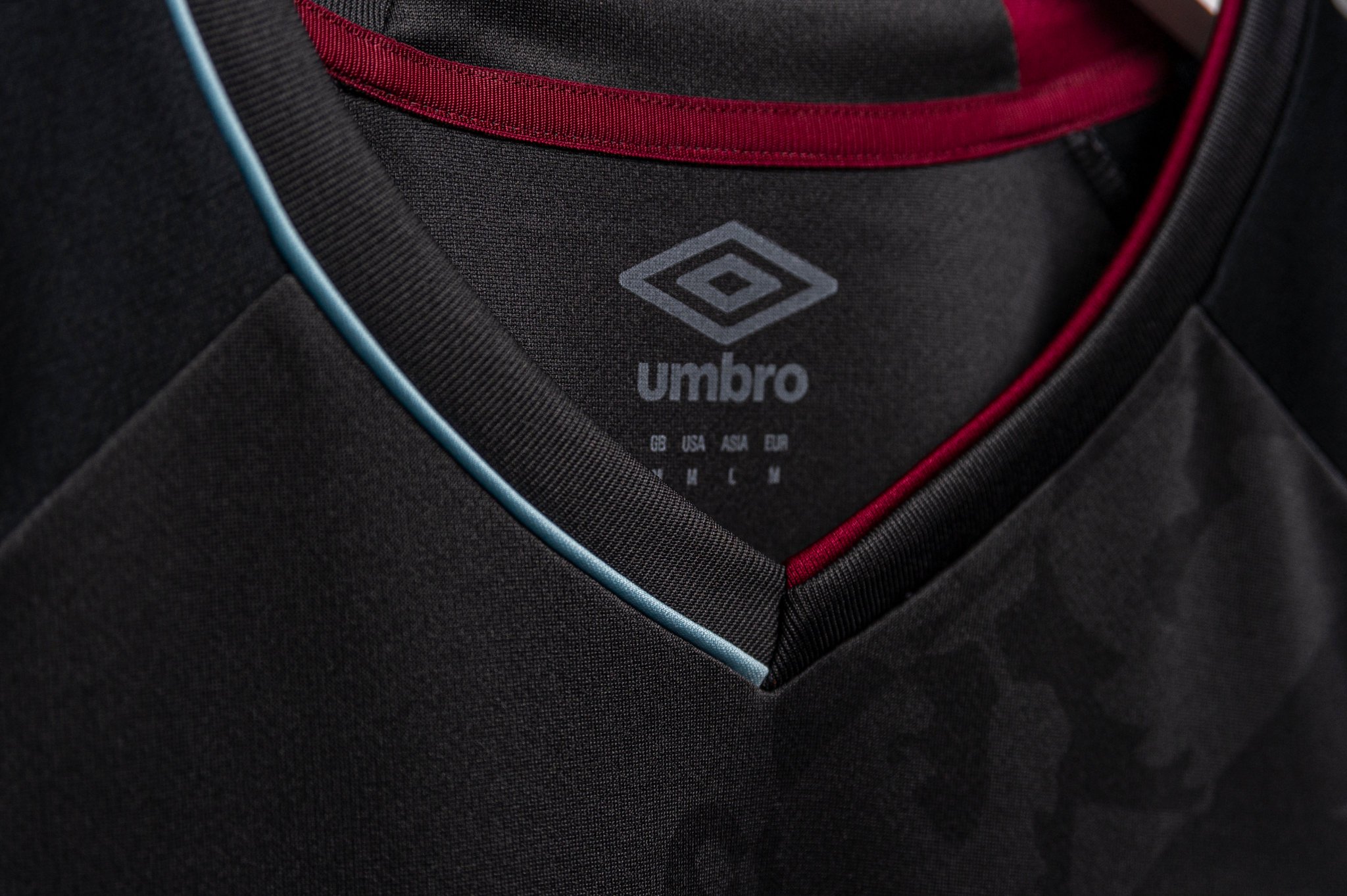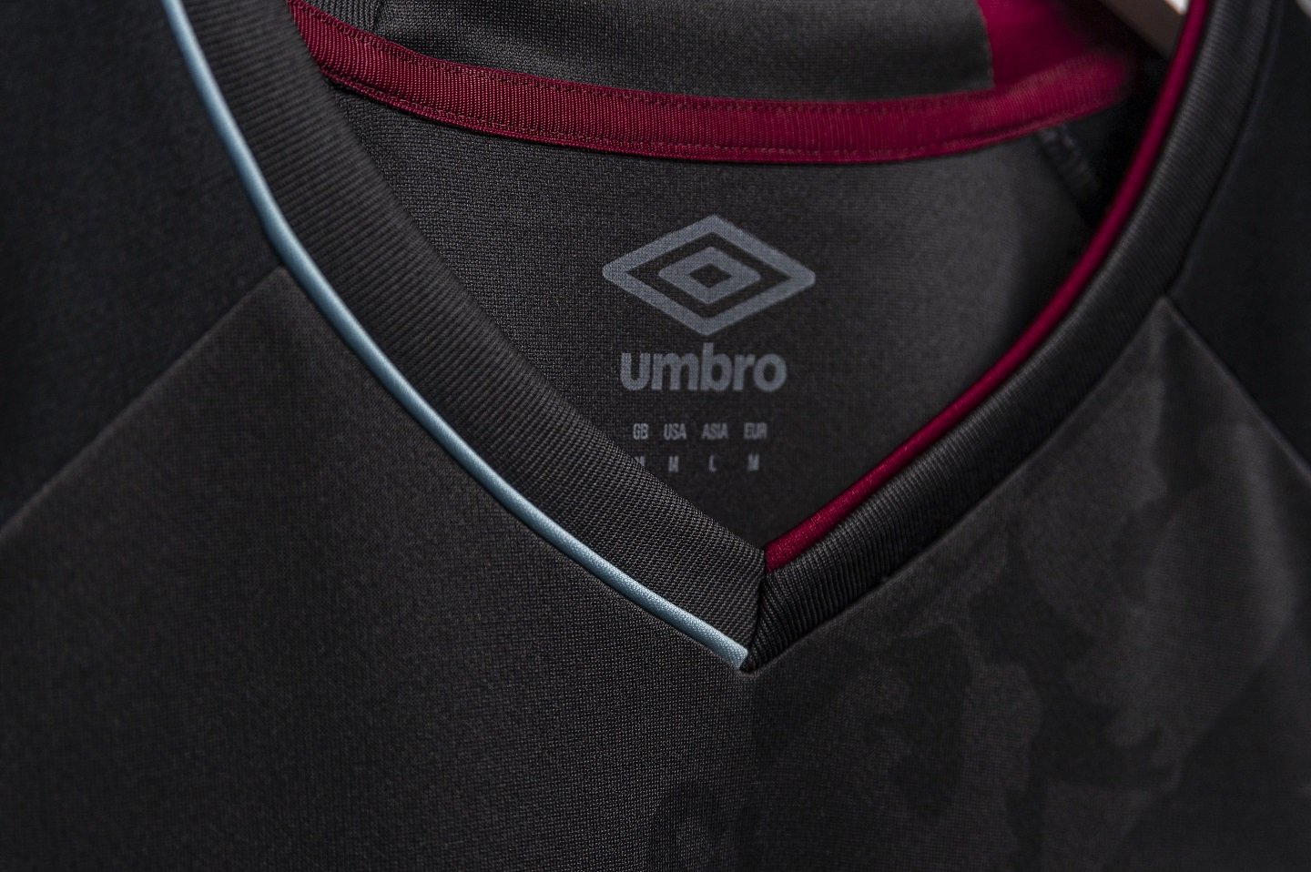 Claret and blue flashes on the cross-over V neck collar and capped sleeves carry the traditional club colours onto both the away shirt and shorts, which are accompanied by plain black socks.