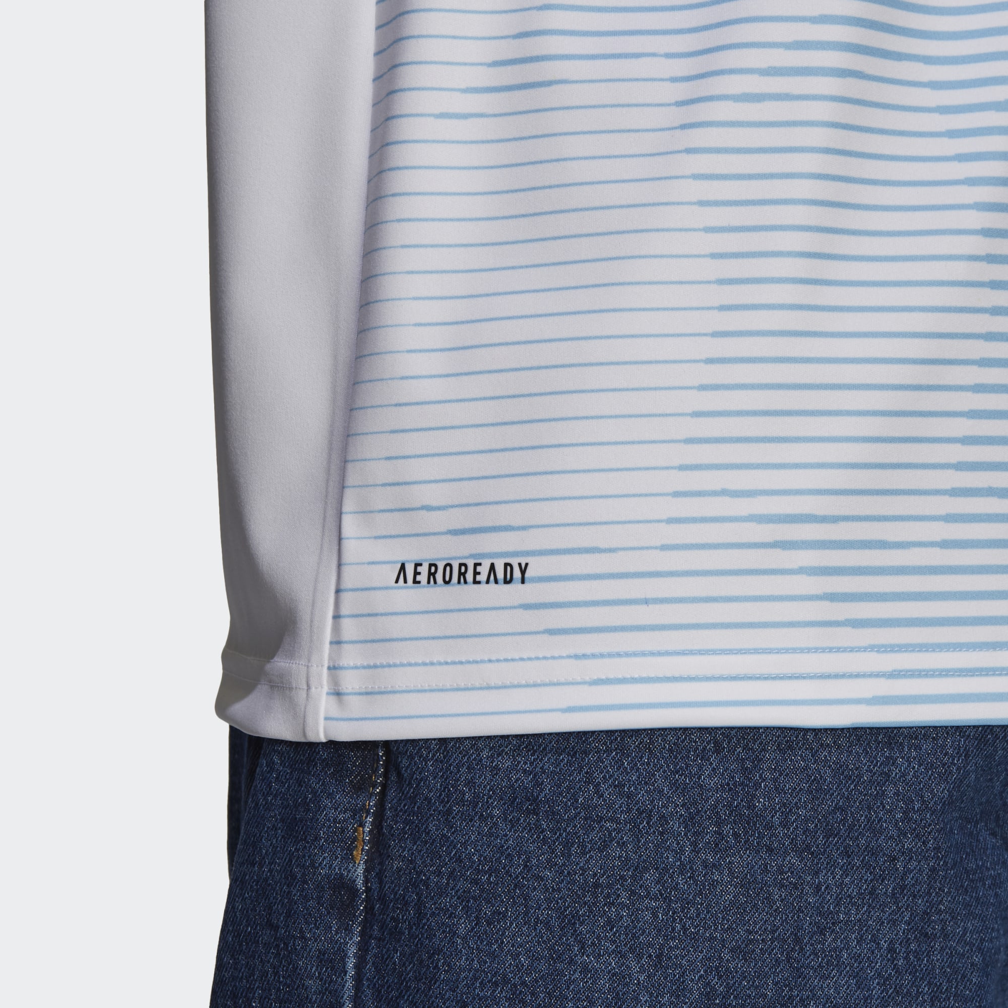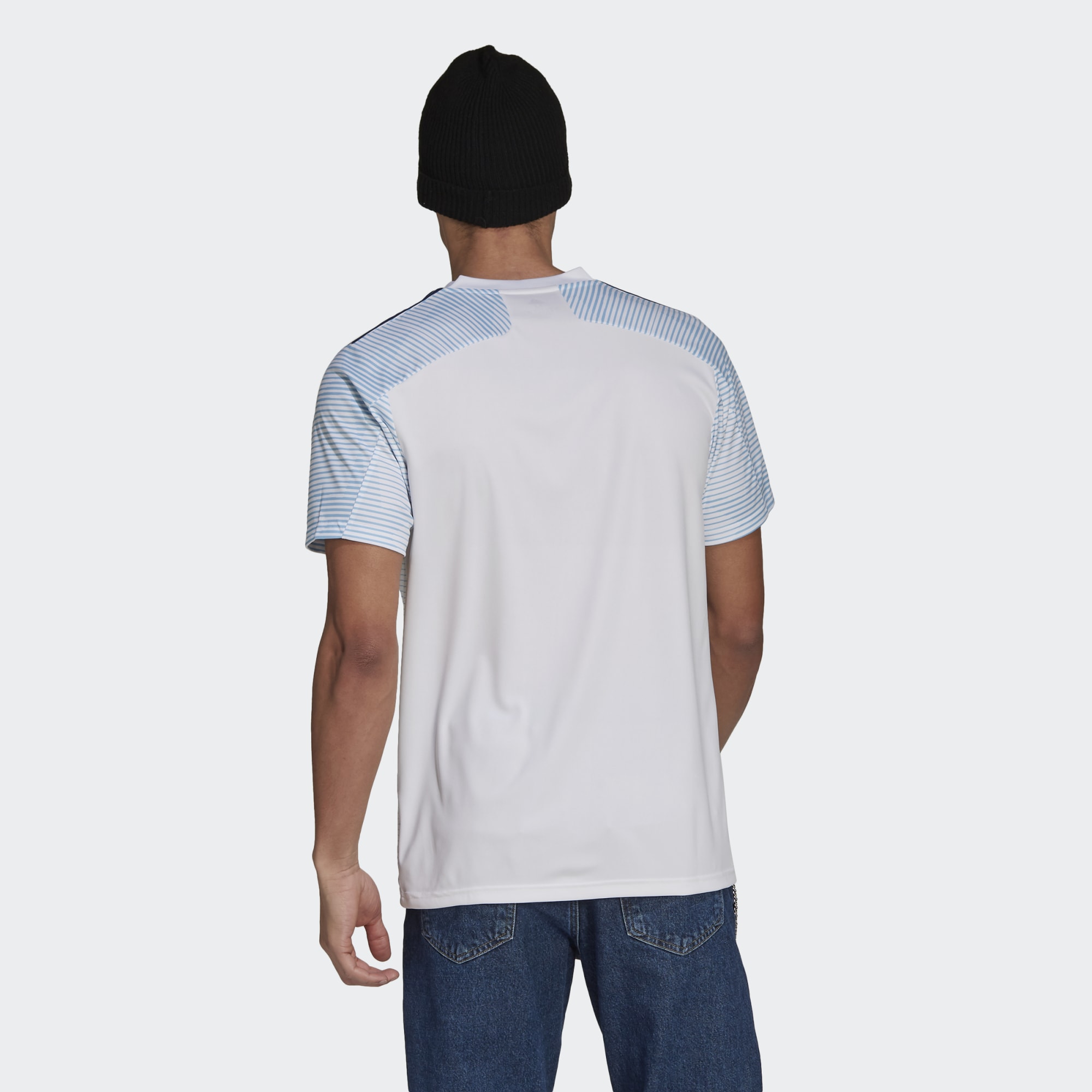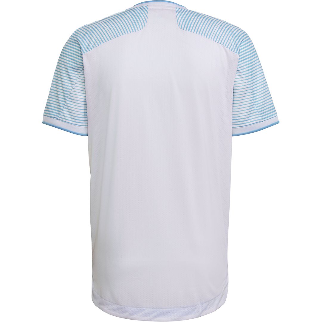 The white secondary jersey includes a monochromatic navy logo, while showcasing the classic adidas three-stripe pattern that continues onto white shorts, leading to socks of the same color.