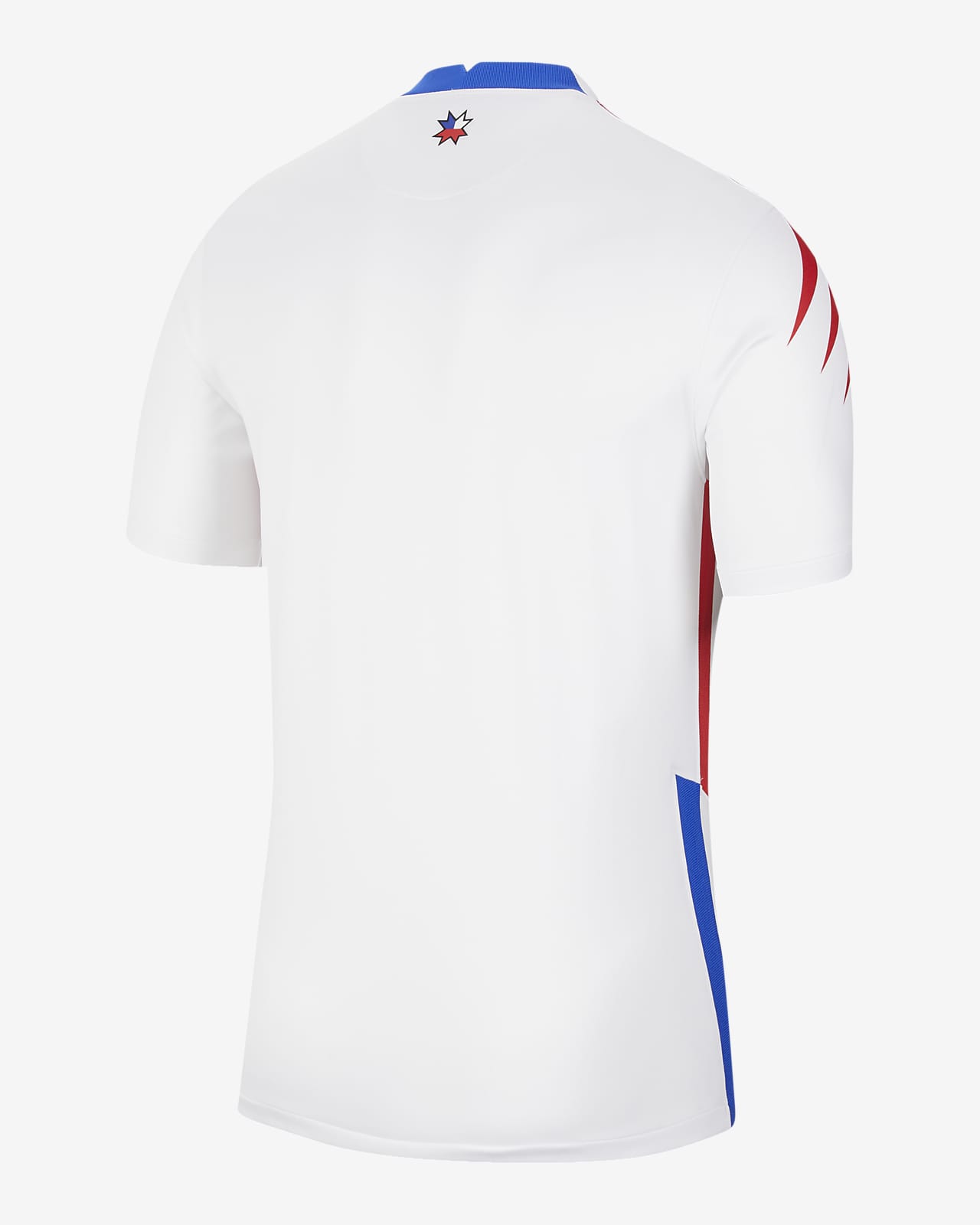 Nike’s new signature thunderbolt trim appears in red and blue also, and the upper back detail is also consistent with the tricolour theme. The Nike Swoosh is in red and the crest is in full colour.