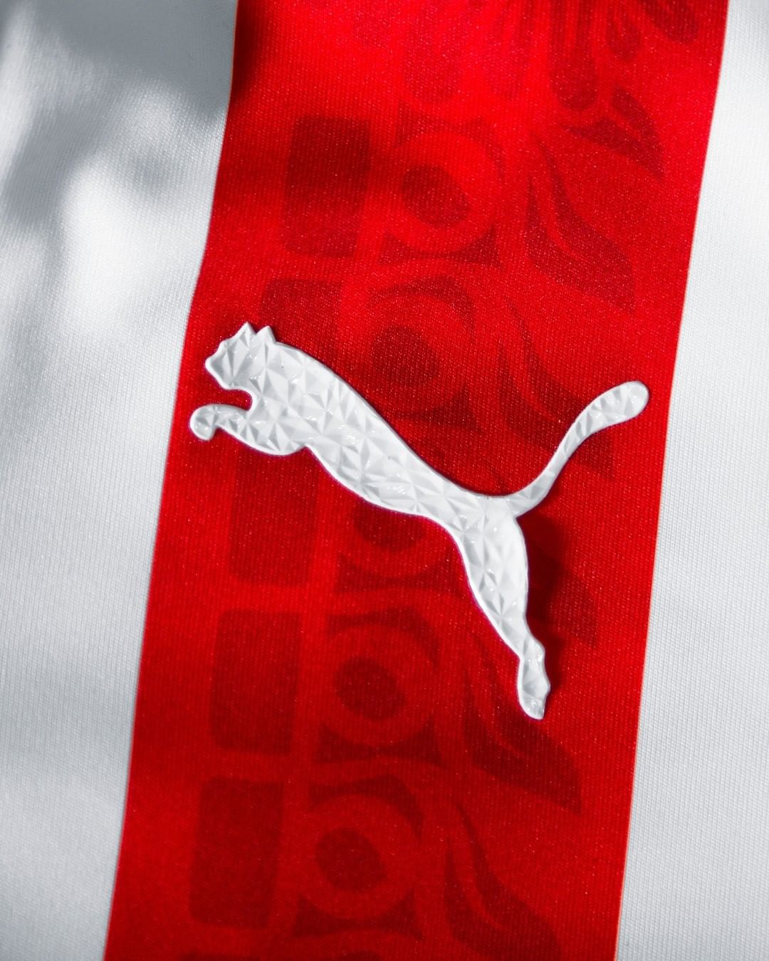 The logo of sponsor “Caliente” also appears in red on the shirt, while the crest appears in full colour and the chest Puma logo in white.
