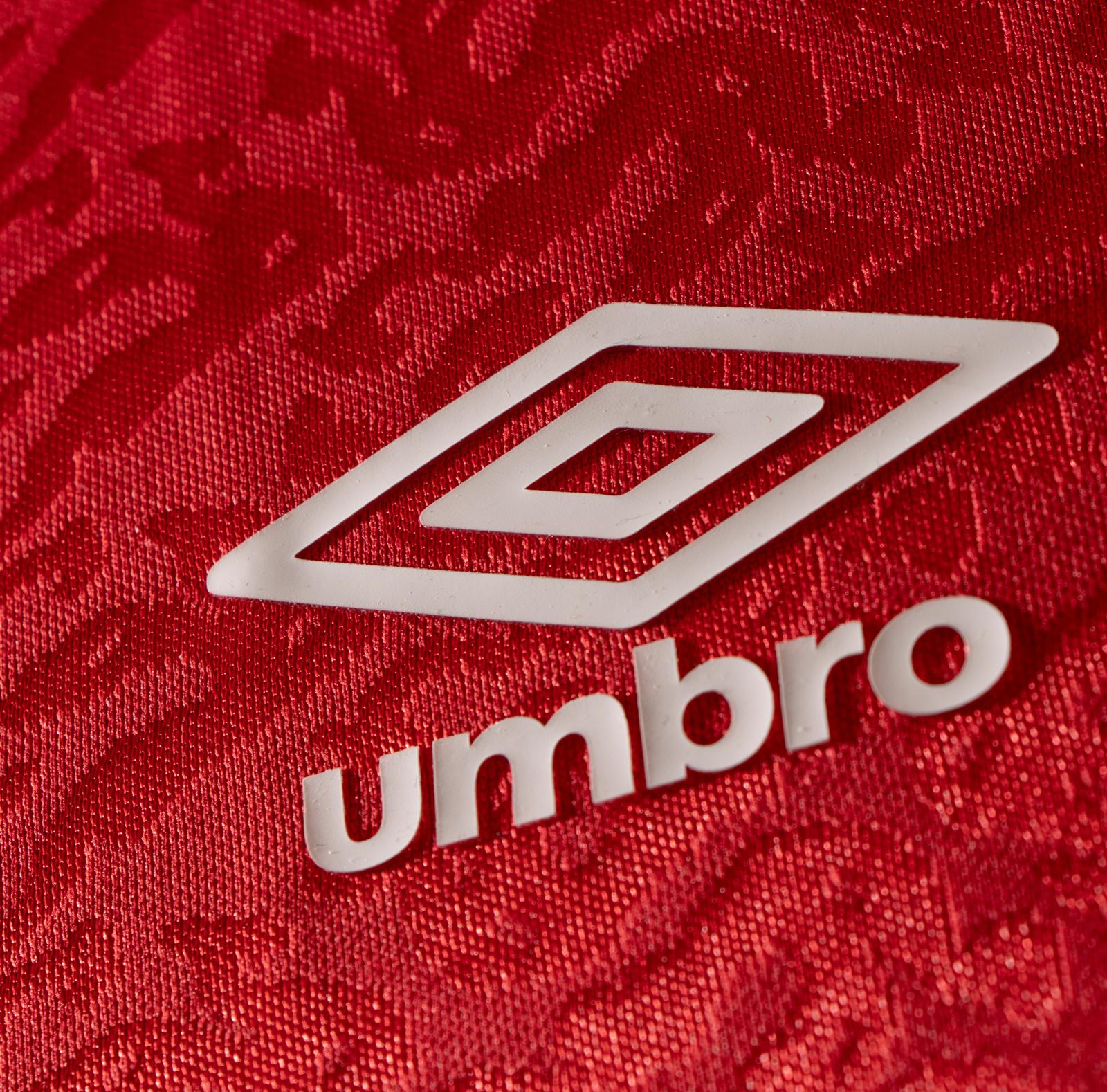 The new design features a textured red torso, with white sleeves and shoulders - creating an approximation of a raglan sleeve effect - with navy and red cuffs. The Umbro logo and sponsors all appear in contrasts to the base colour - navy on white and white on red - and the crest is in full colour.