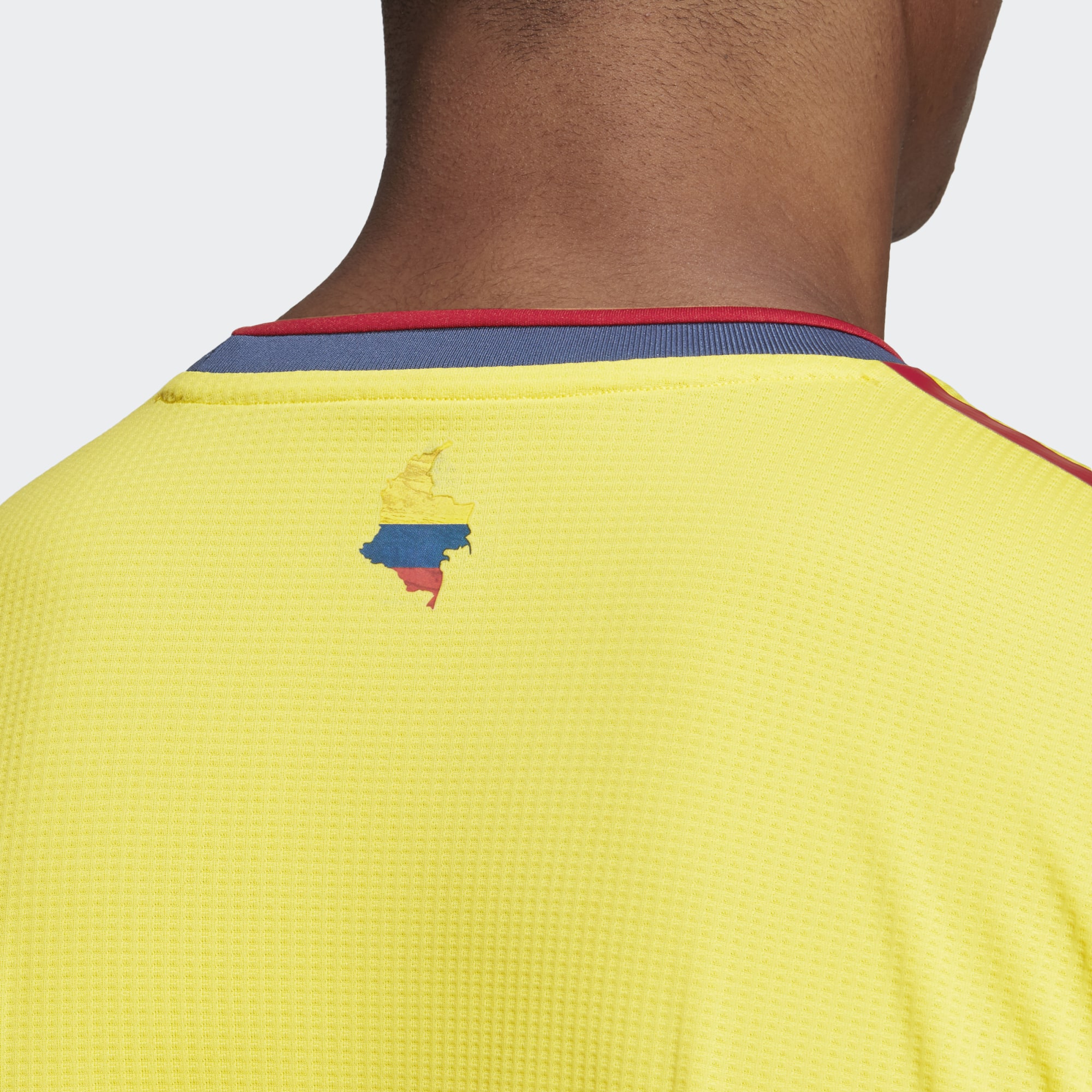 The flag of Colombia is represented in the fill of the country’s morphology on the upper back, as well as the overall kit which is completed with blue shorts and red socks.