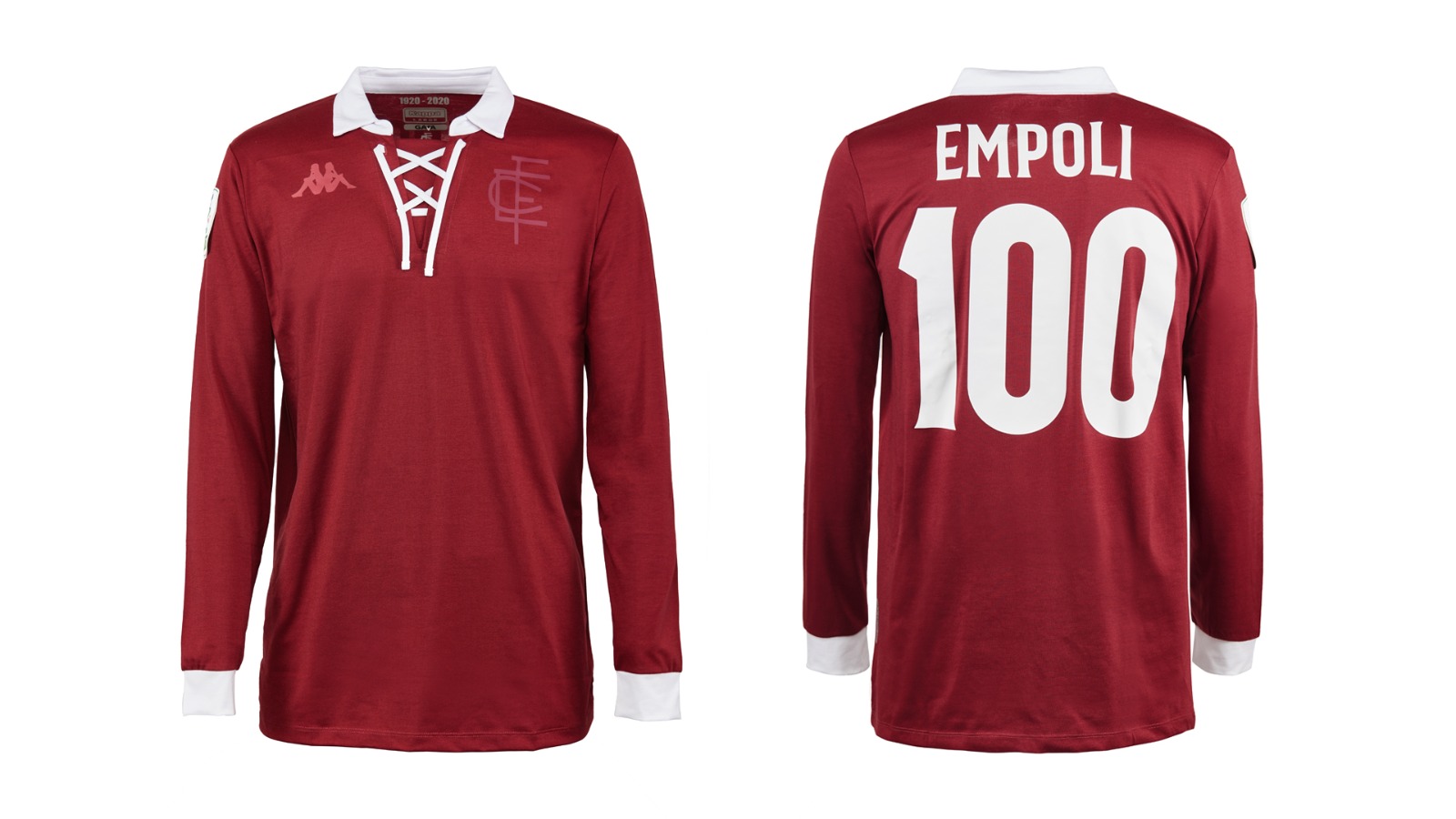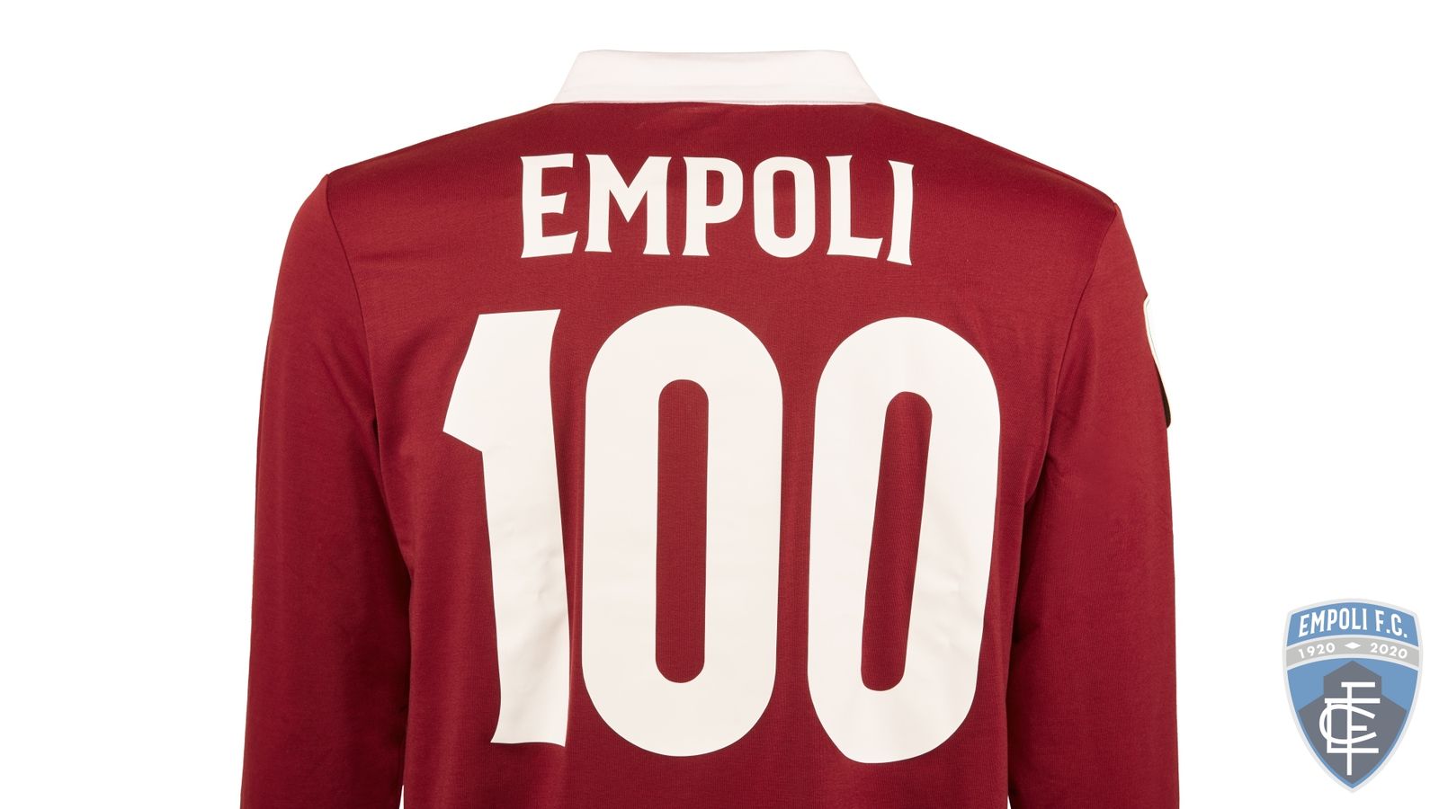 The shirt carries no sponsor but is sold with contrasting “Empoli [-] 100” printing in white on the reverse, to celebrate the hundredth anniversary of the Italian Serie B club’s formation.