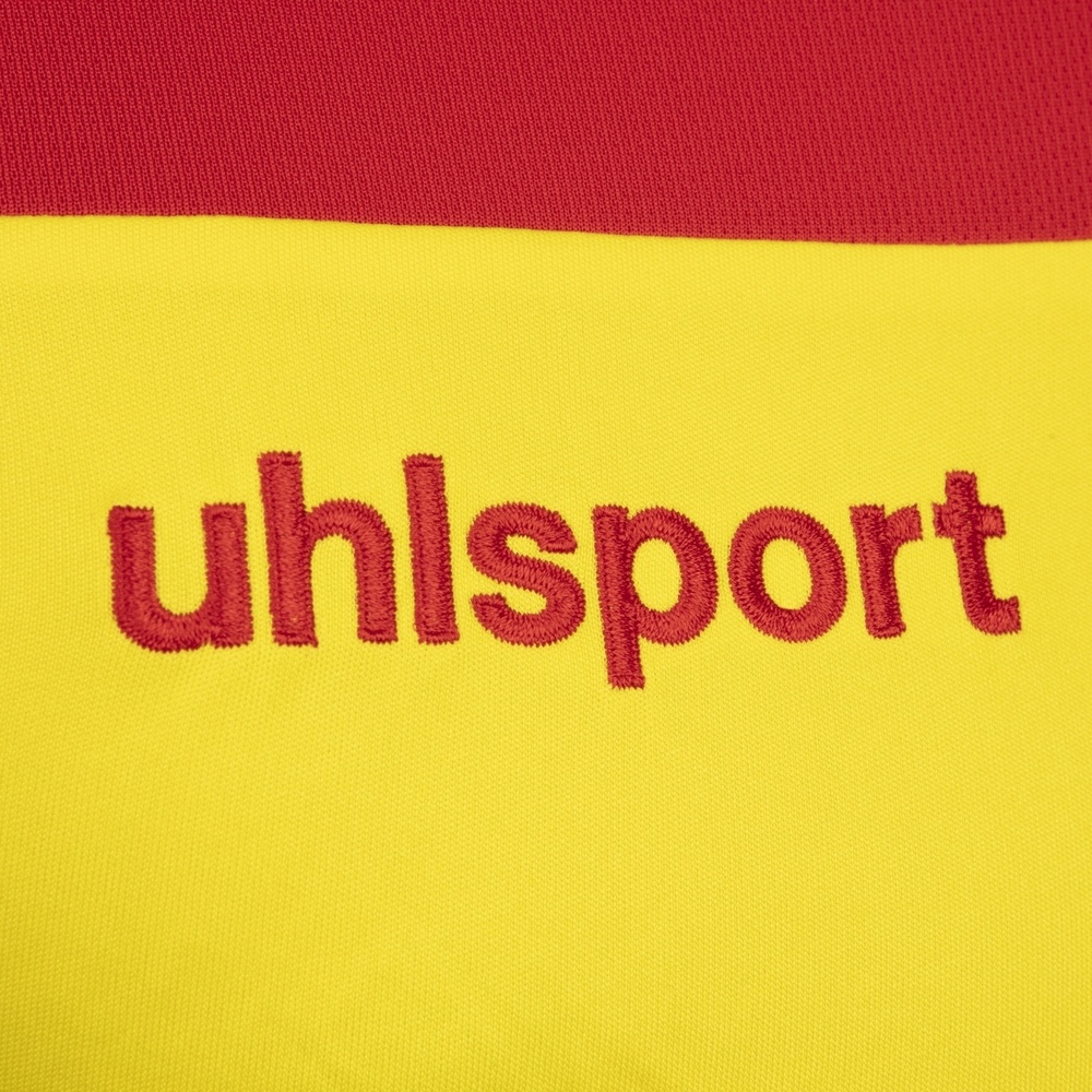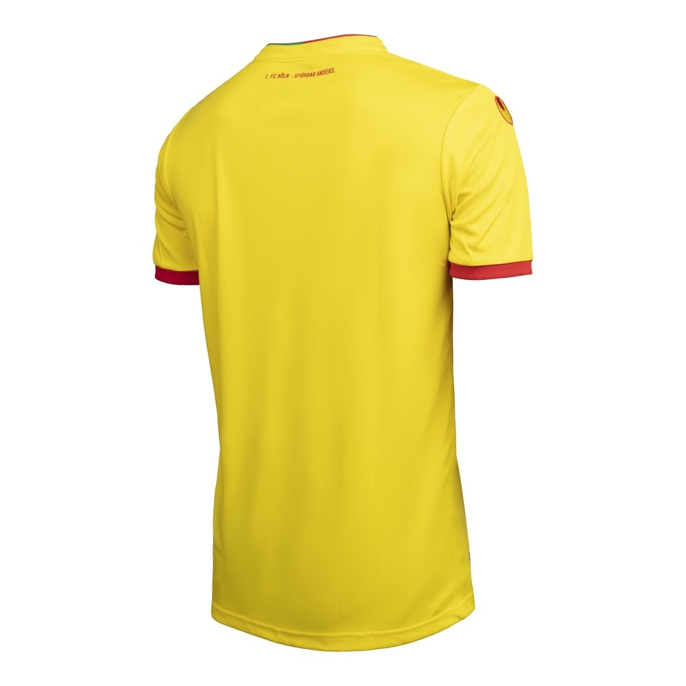 The upper part of the shirt features a dual band of green and red, while further embellishment appears in red, such as the embroidered Uhlsport logos and Rewe sponsorship branding, and the printing on the rear. The crest is the exception, appearing in full colour, and the neck trim is divided between green and red.