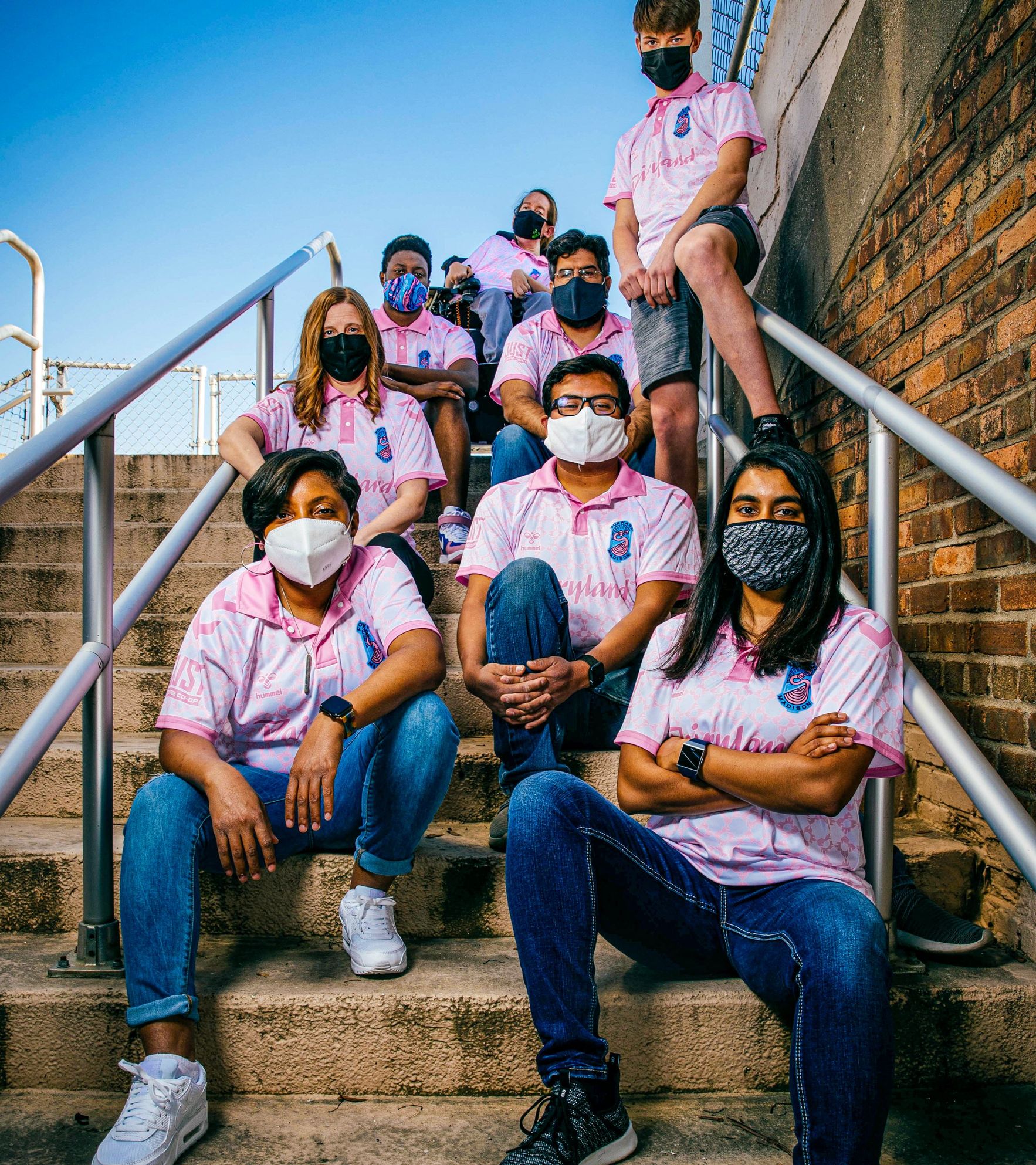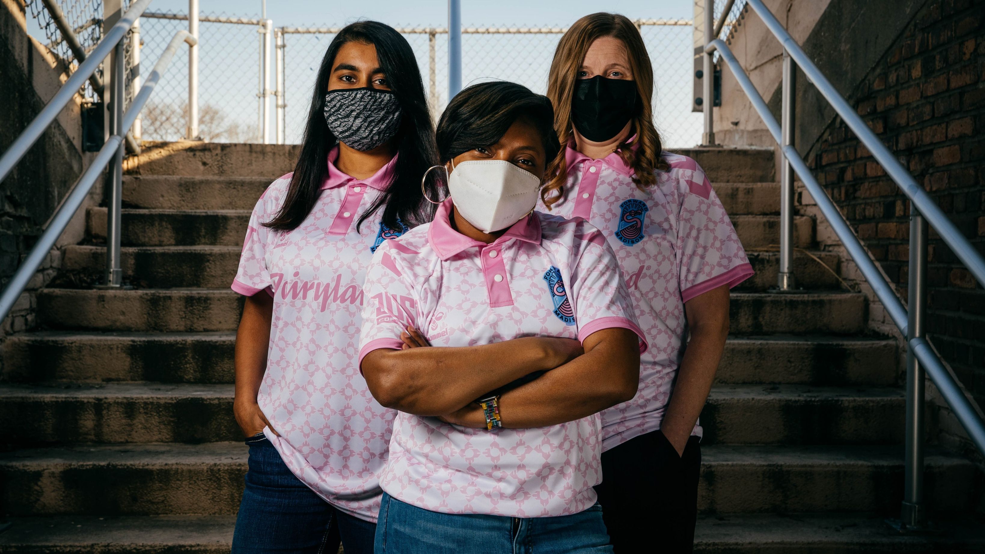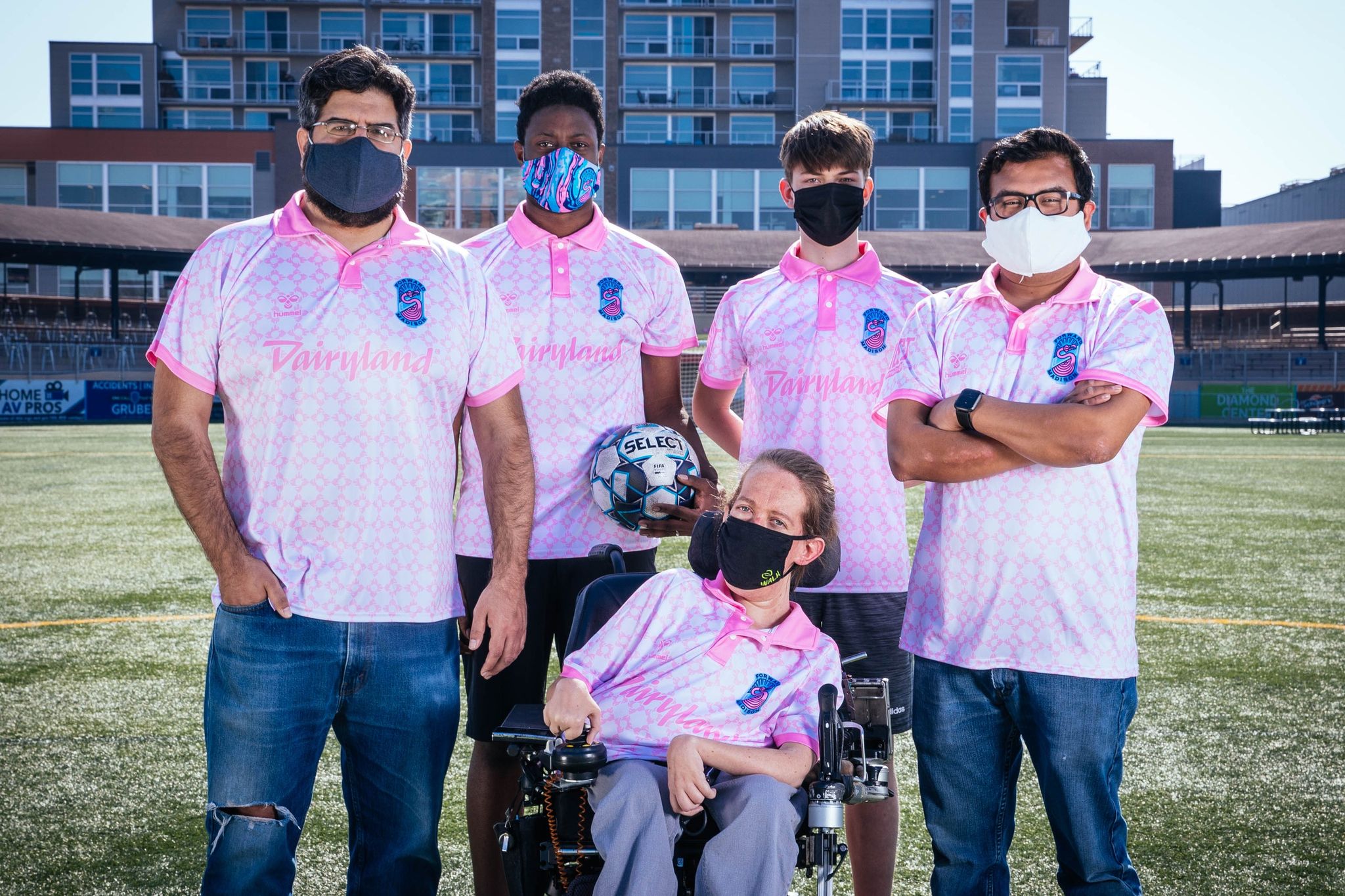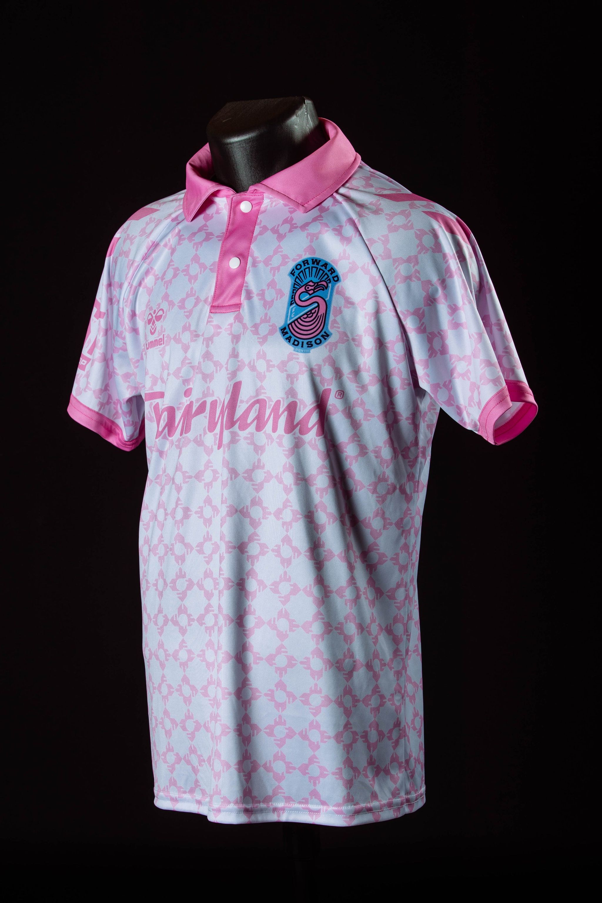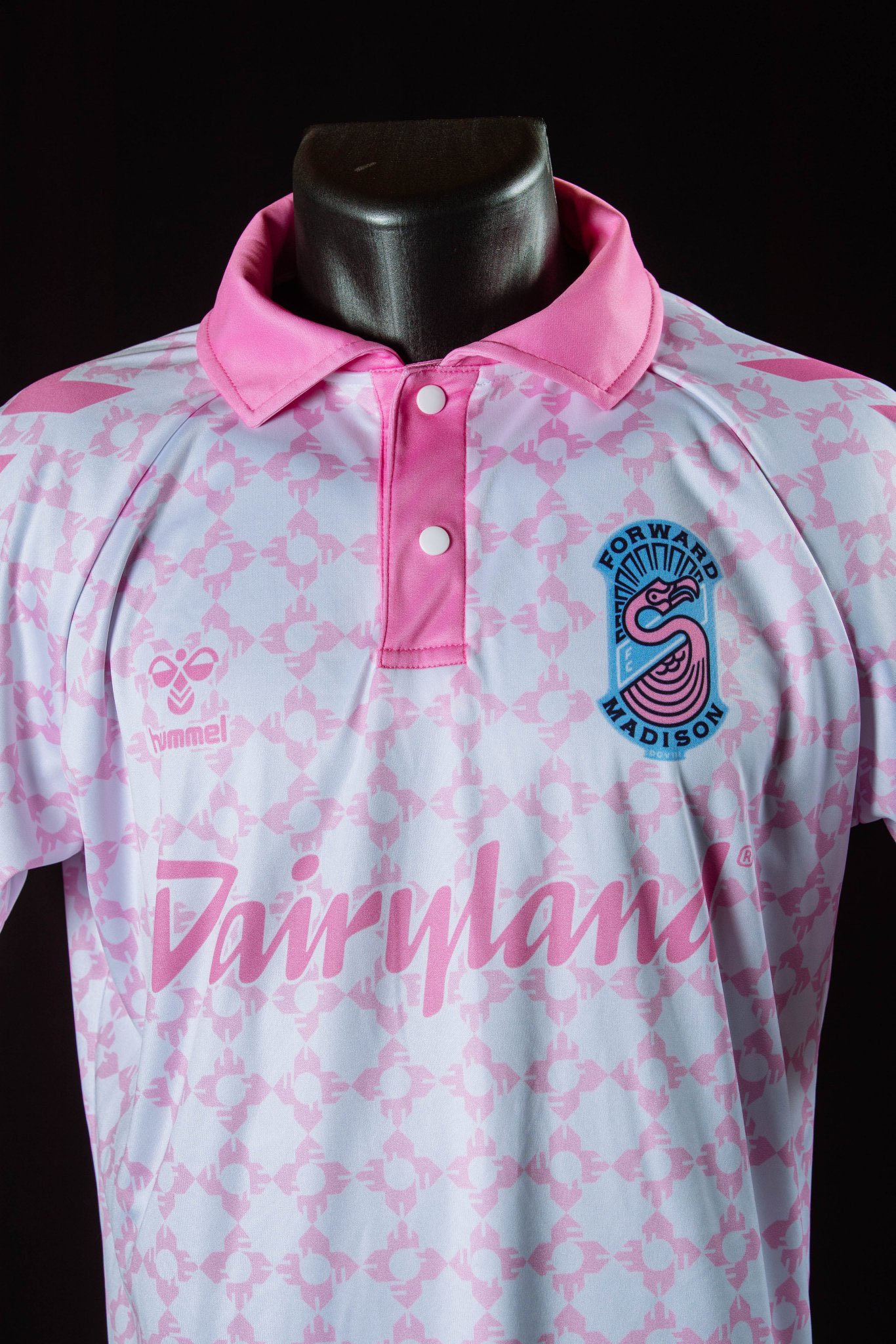 The 2021 away kit, created by FMFC’s independent supporters’ association The Flock, features a pink-and-white pattern emblazoned with symbols of the Wisconsin capitol building.