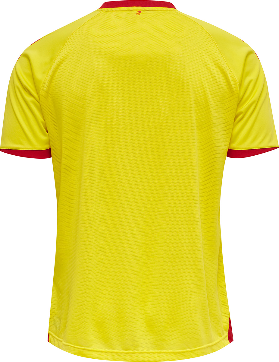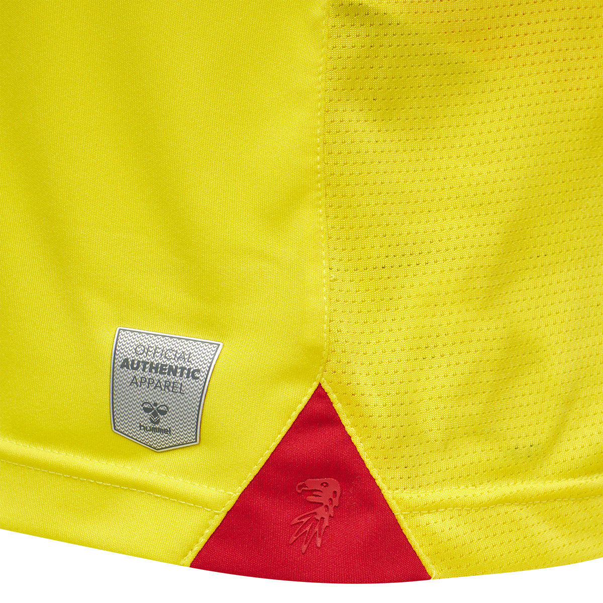 The shirt will be worn with yellow shorts and socks, with red decoration on both.