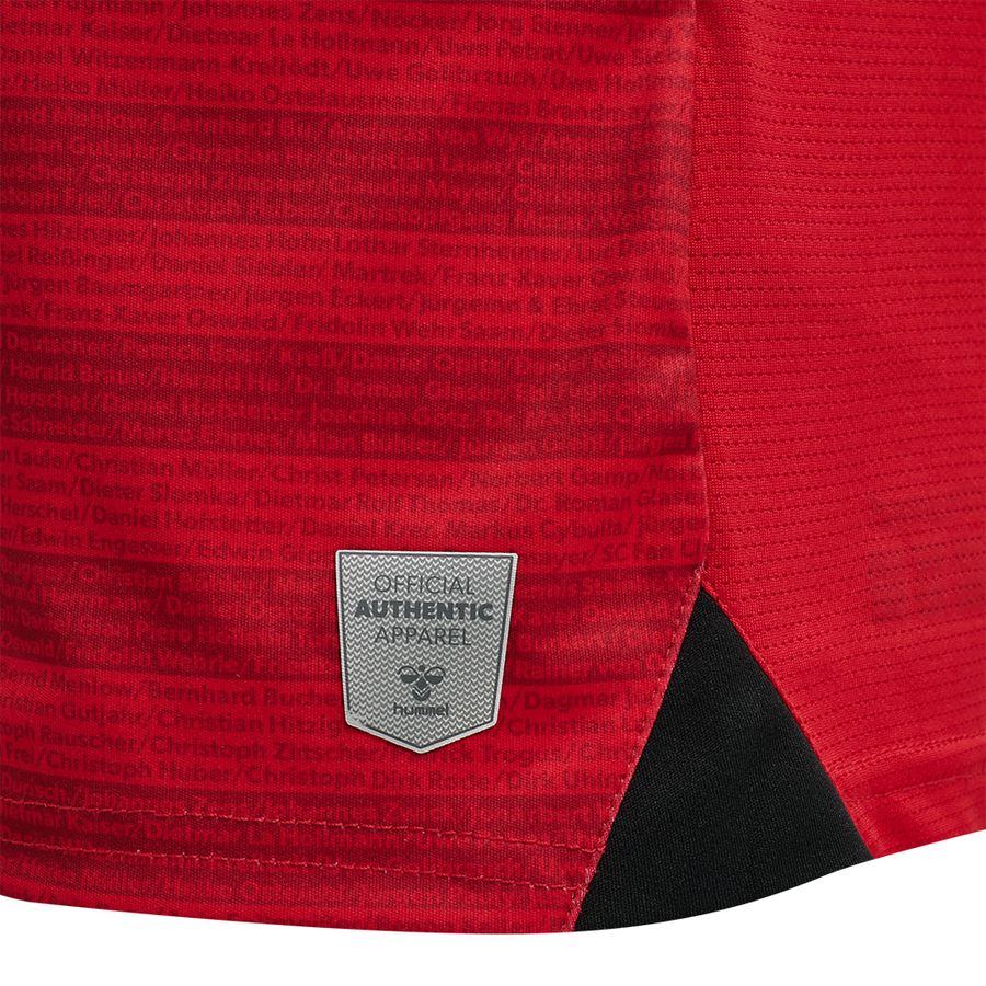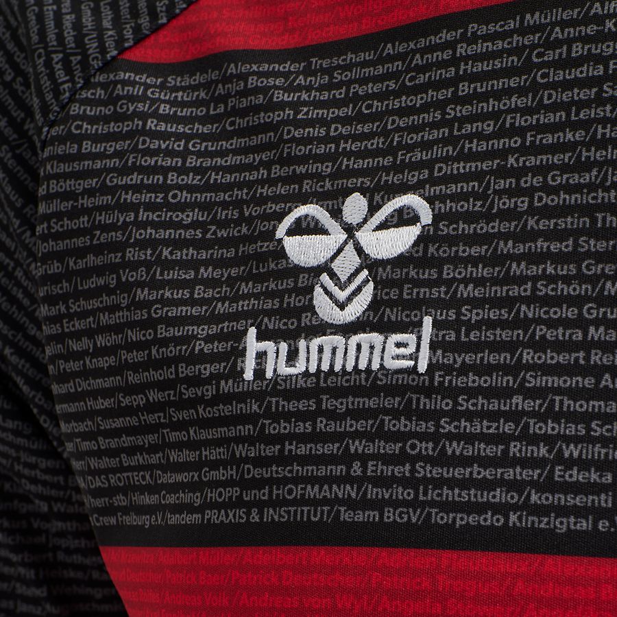 The red shirt features the names of 475 members of the Freiburg football school supporters’ association. SC and the association are fulfilling the pledge made in the “Your name on our shirt” campaign in the 2018/19 season that aimed to recruit more members for the supporters’ association.