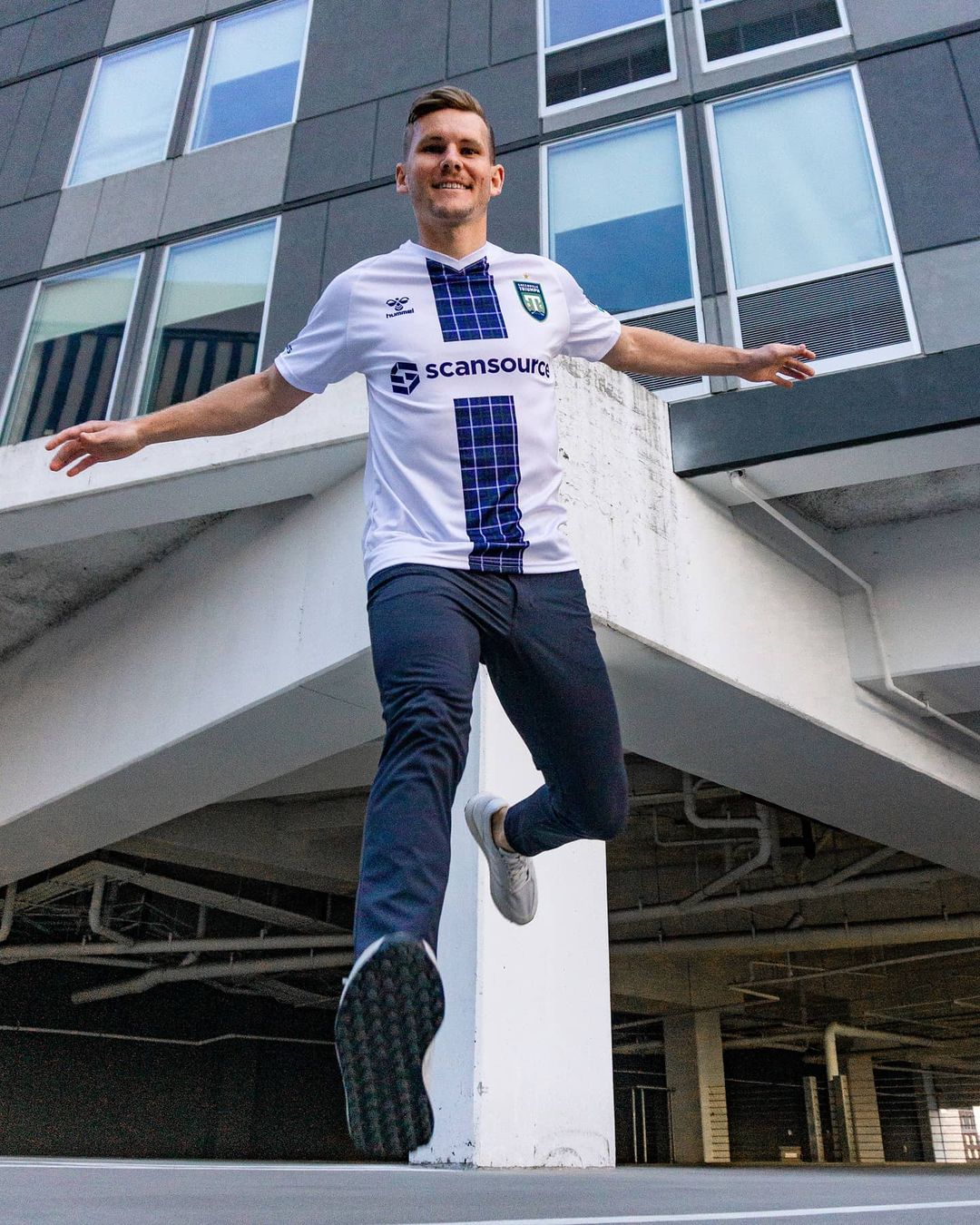 The white kit is anchored by a vertical tartan-patterned stripe in Triumph colours that pays homage to the stripe design on the club's vintage 1961 Triumph TR3A car, a fixture at Triumph home matches and community appearances around the Upstate.