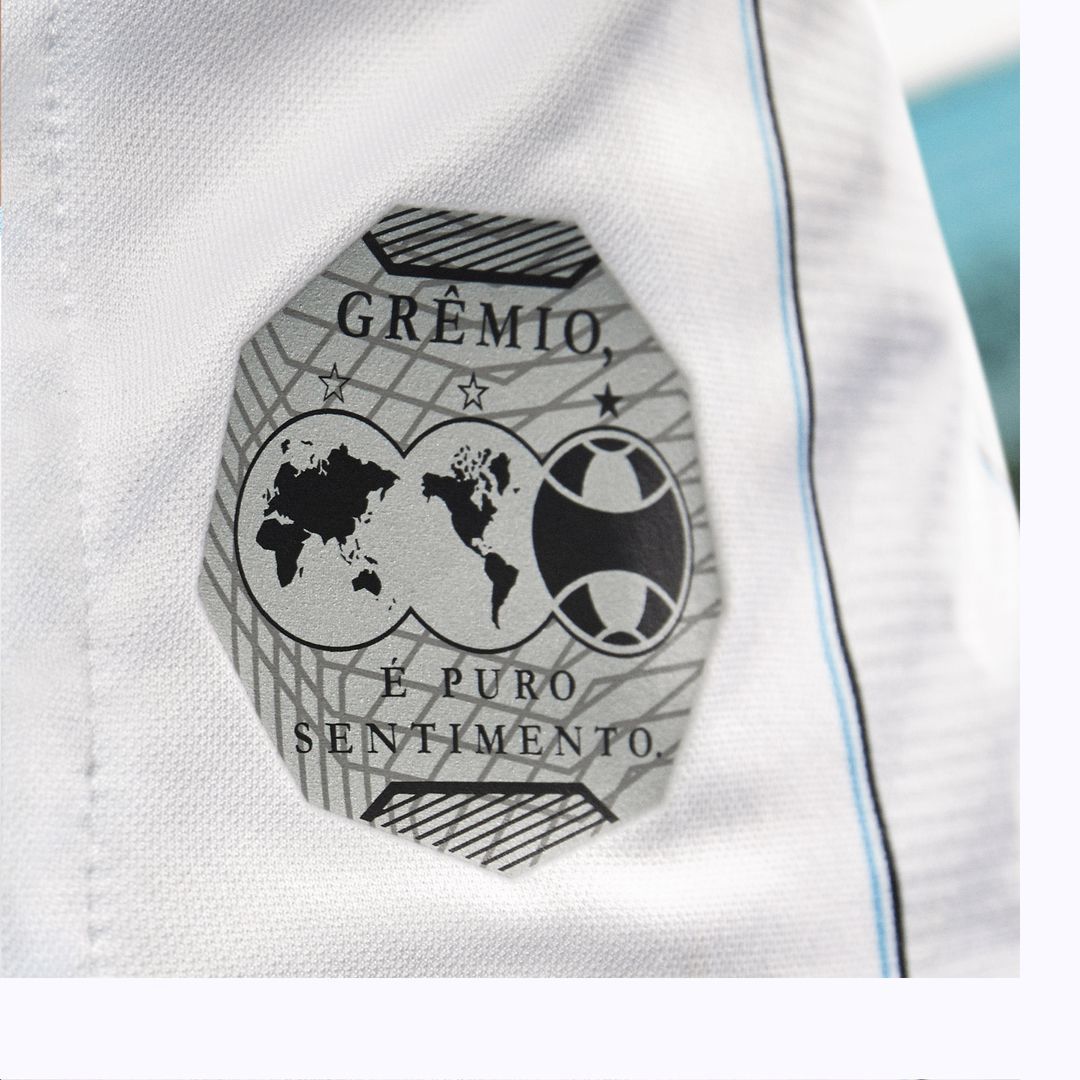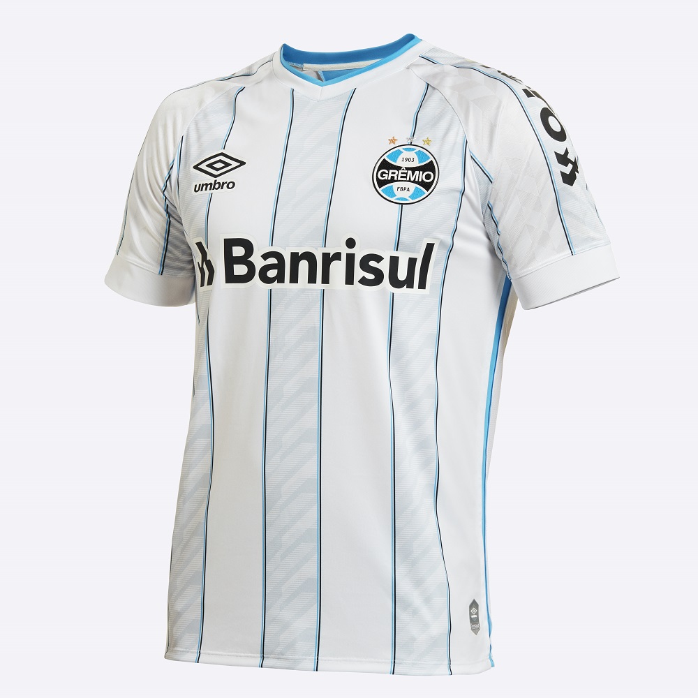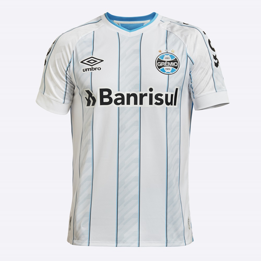 Ther neat white collar has a light blue trim, with black and blue edging to the aforementioned stripes. The Umbro logo and “Banrisul” sponsor’s logo are in black - along with those on the sleeves - and the Grêmio crest is in full colour, complete with bronze, silver and gold stars above. At the top of the upper back is a combination logo featuring elements of Umbro and the club.