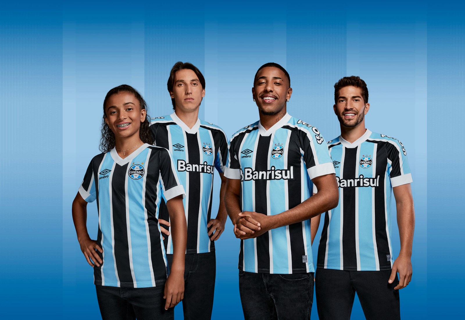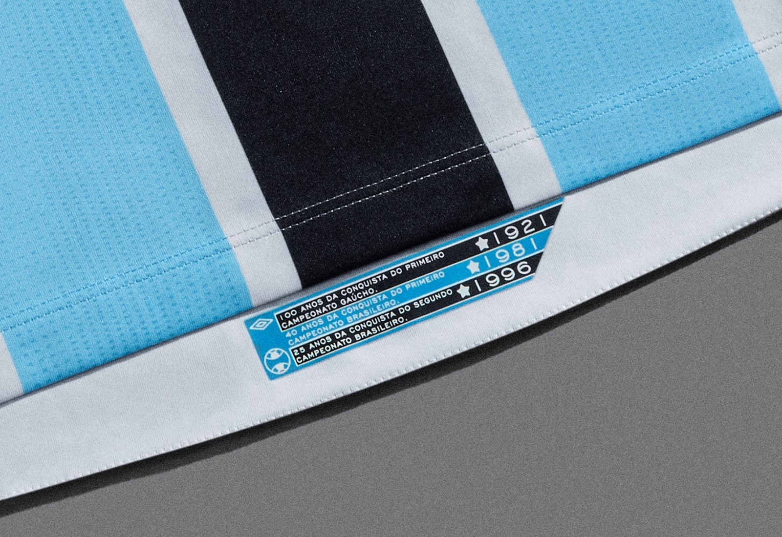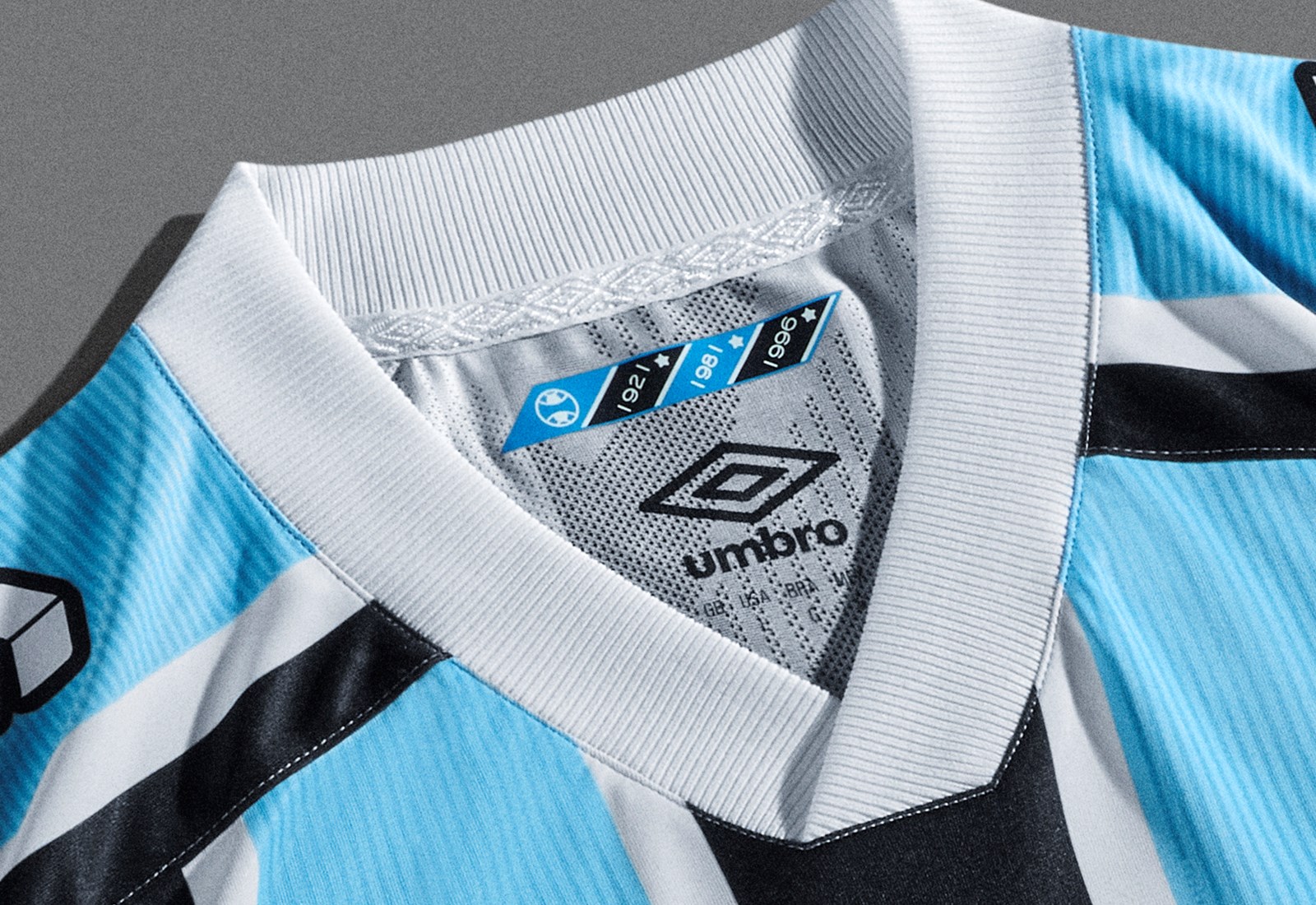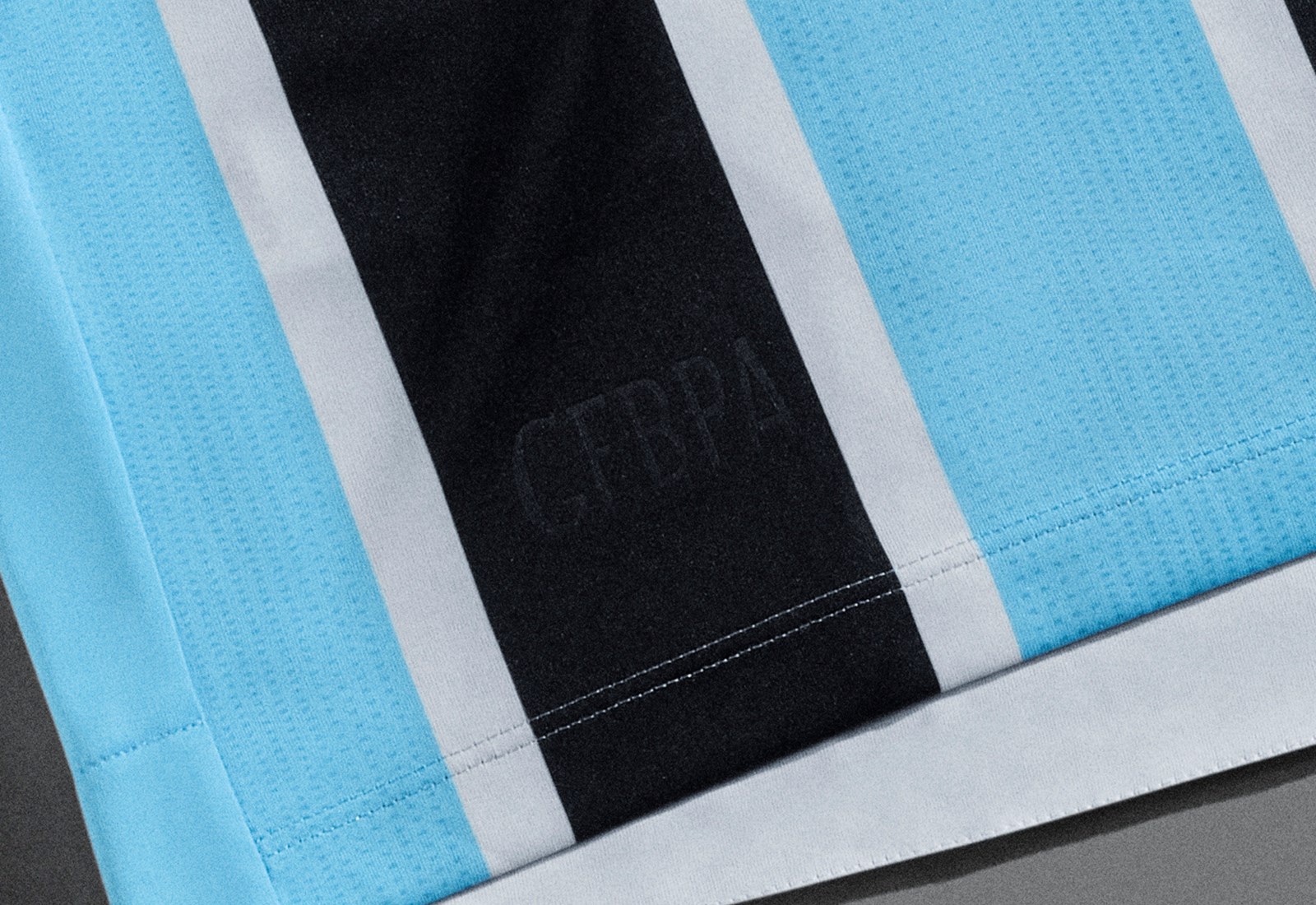 The new Grêmio primary design for 2021-22 features the famous tri-colour stripes - here in black, white and textured sky blue - with deep overlapping “V”-style neck and cuffs matching in white.