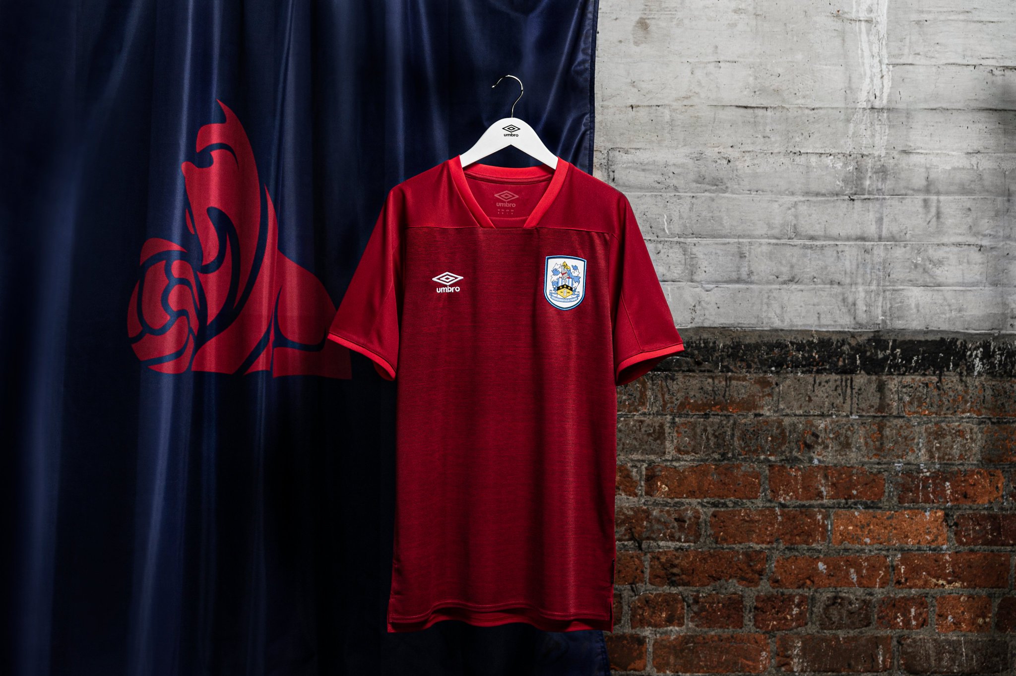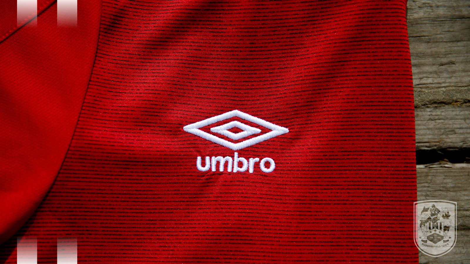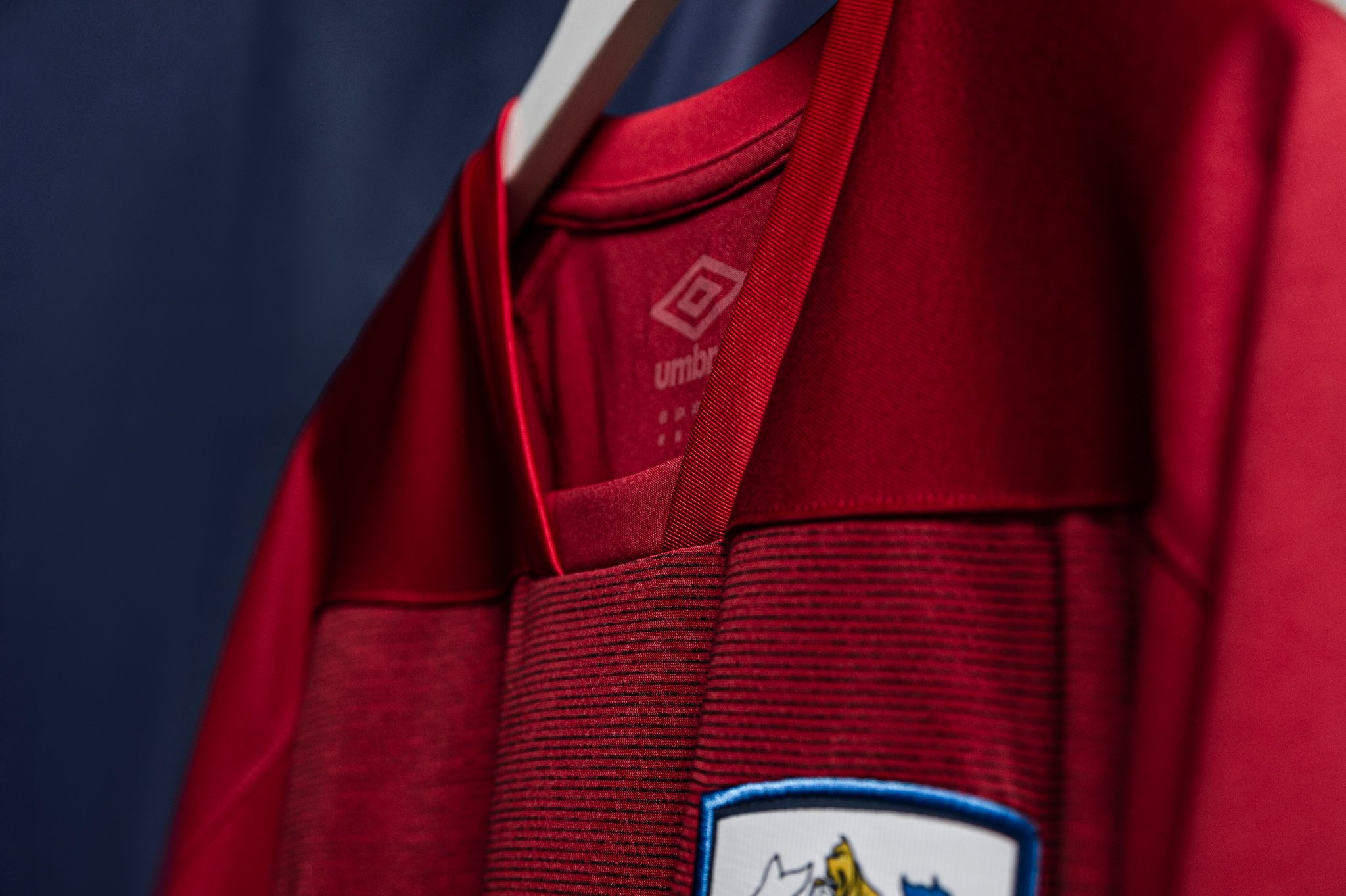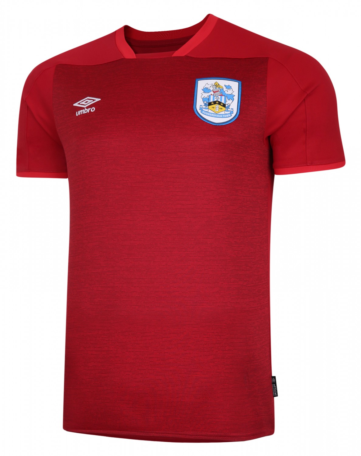 Town’s 2020/21 red Umbro away shirt has a special design across the front Chili Pepper Red Marl body panel, which contrasts nicely with the Lollipop Red rib on the collar and cuffs.